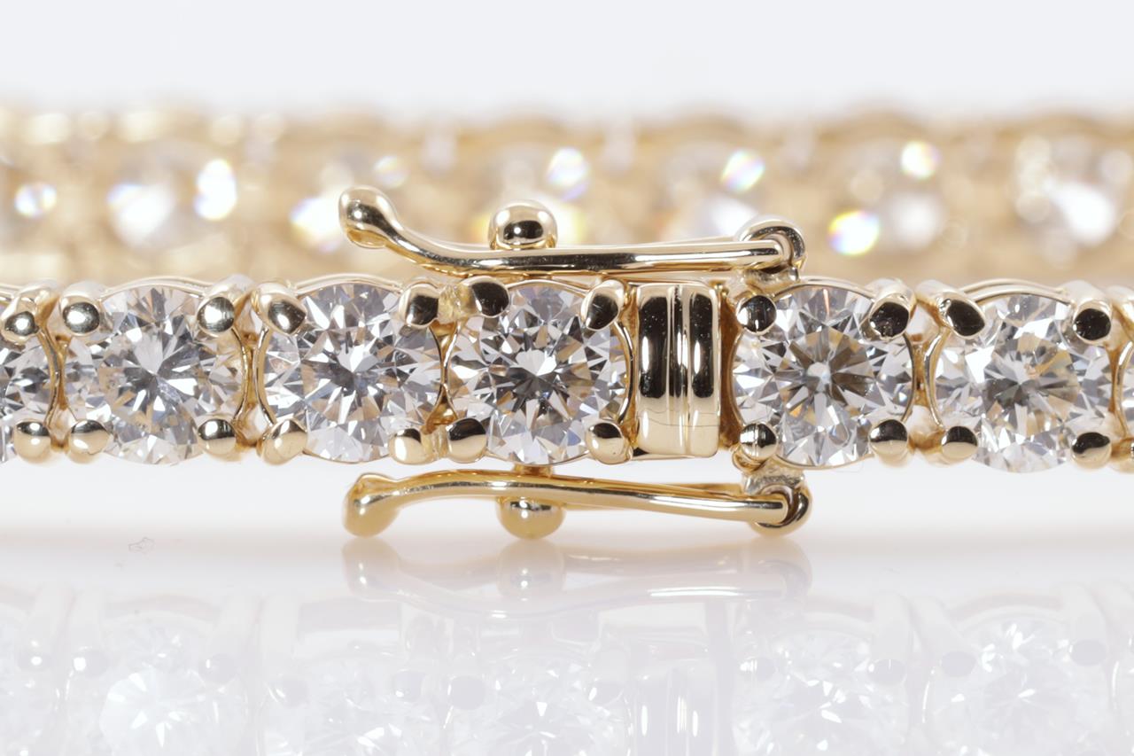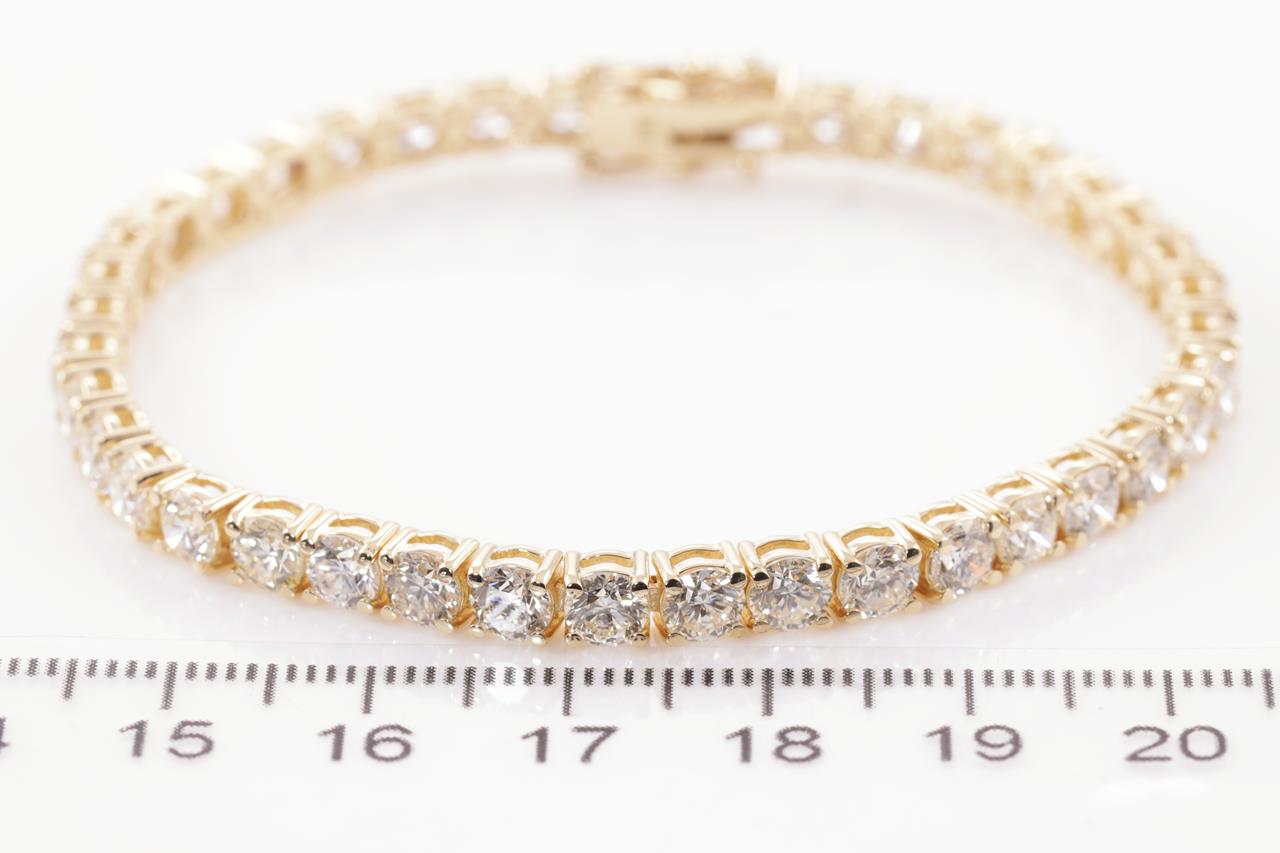 Diamond tennis bracelet with 40 round Diamonds totalling 12.13cts (Estimated grading: I-J SI). 18ct yellow gold. Length: 18cm. Weight: 16.3g. With certificate #415104. (New)