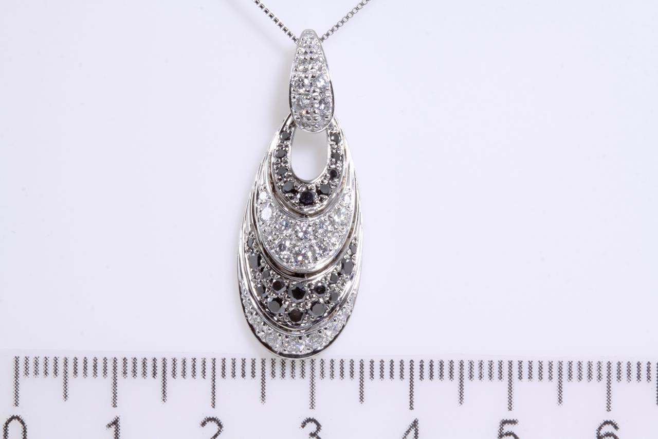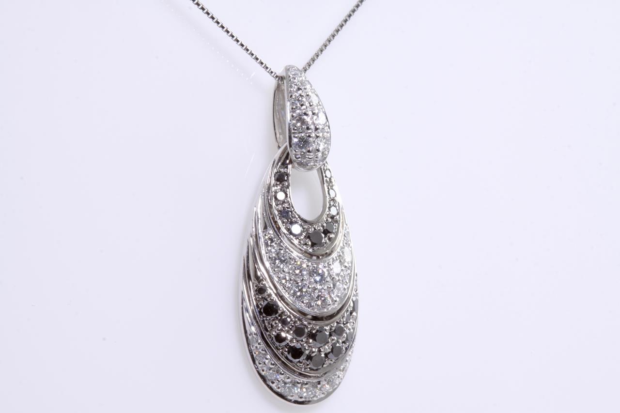 Diamond pendant with black Diamonds totalling 0.61cts and white Diamonds totalling 0.60cts (Estimated grading: G-H VS). Platinum with adjustable platinum 45cm chain. Weight: 8.5g (Pre-owned)