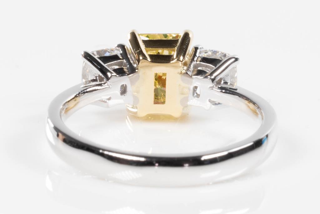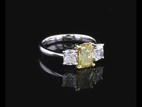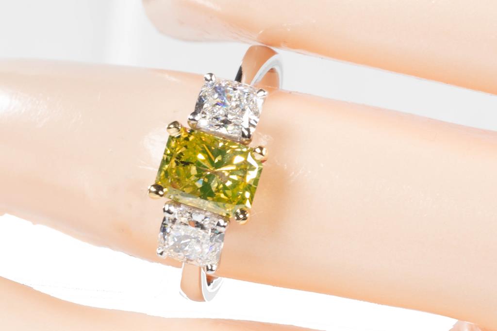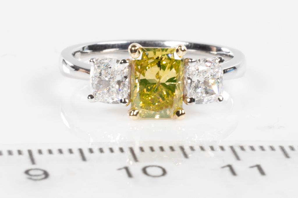 Diamond ring with centre Radiant cut Diamond of 1.21ct (with GIA report graded as Natural Fancy Vivid Greenish Yellow Even #5141518608) and 2 shoulder cushion cut diamonds totalling 1.03cts (with GIA summary reports graded as E VVS1 #6412349484, 3415350991) 18ct yellow and white gold. Ring size M. Weight: 4.6g. (new)