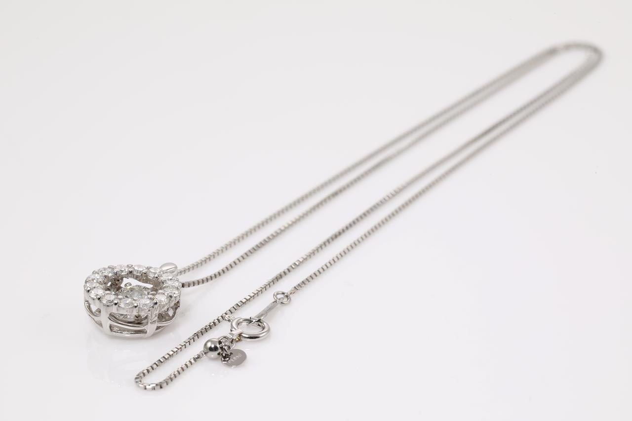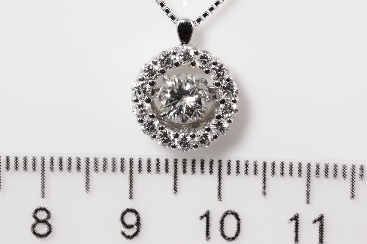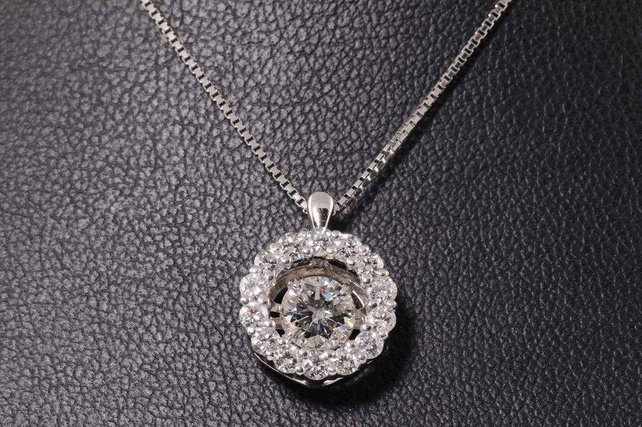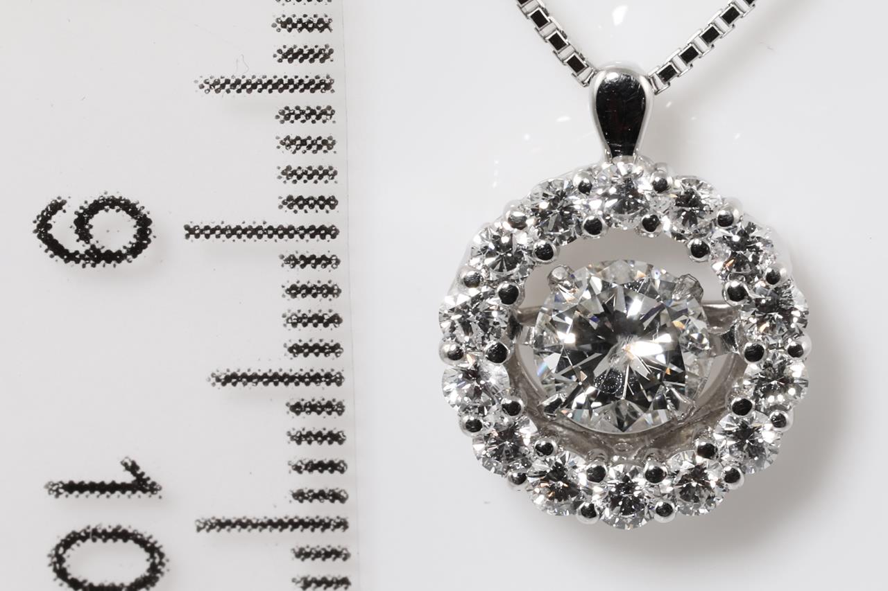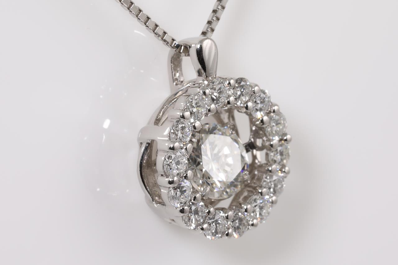 Diamond pendant with a centre round Diamond of 0.73ct (Estimated grading: J P1) and remaining Diamonds totalling 0.48cts (Estimated grading: H SI). Platinum with adjustable 45cm chain. Weight: 5g. (Pre-owned)