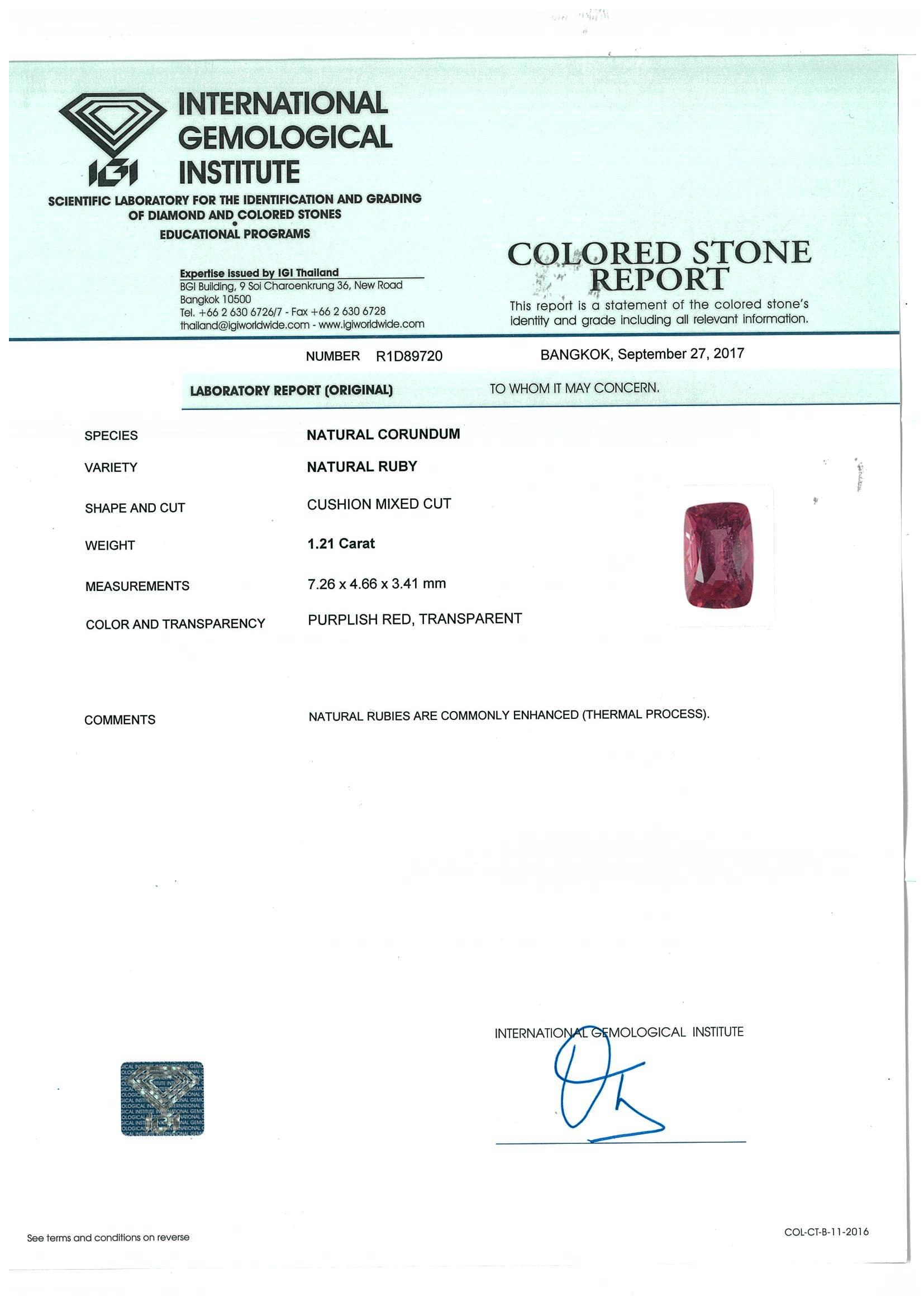 A loose cushion mixed cut natural Ruby of 1.21ct (with IGI report #R1D89720). Size: 7.2 x 4.6 x 3.4mm. (New)