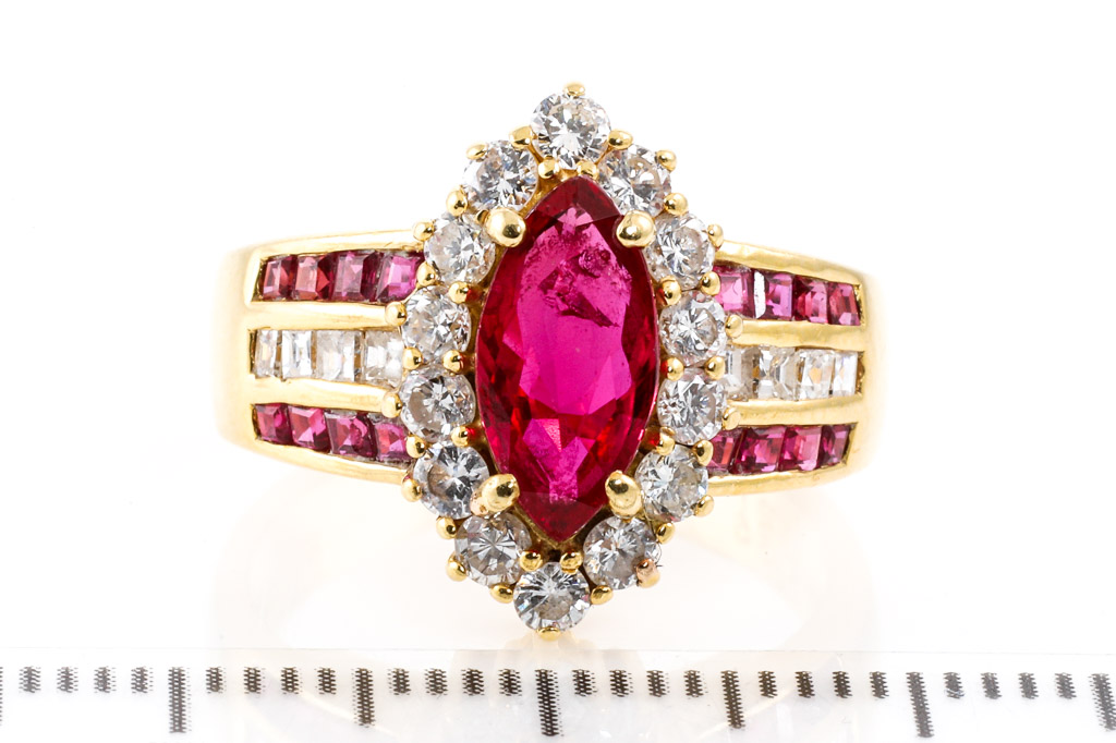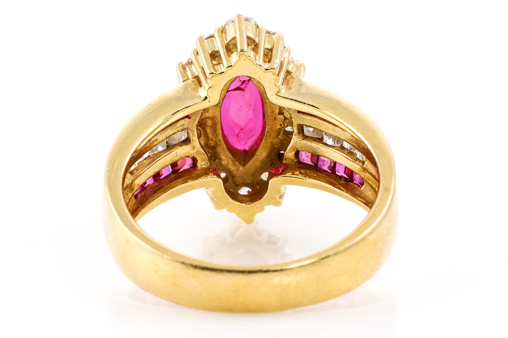 Ruby and Diamond ring with marquise cut & carre cut Rubies totalling 1.21cts and carre cut & round Diamonds totalling 0.65cts (Estimated grading: H SI). 18ct yellow gold. Ring size: J1/2 - ring resizing is not recommended. Weight: 7.0g. (Pre-owned)