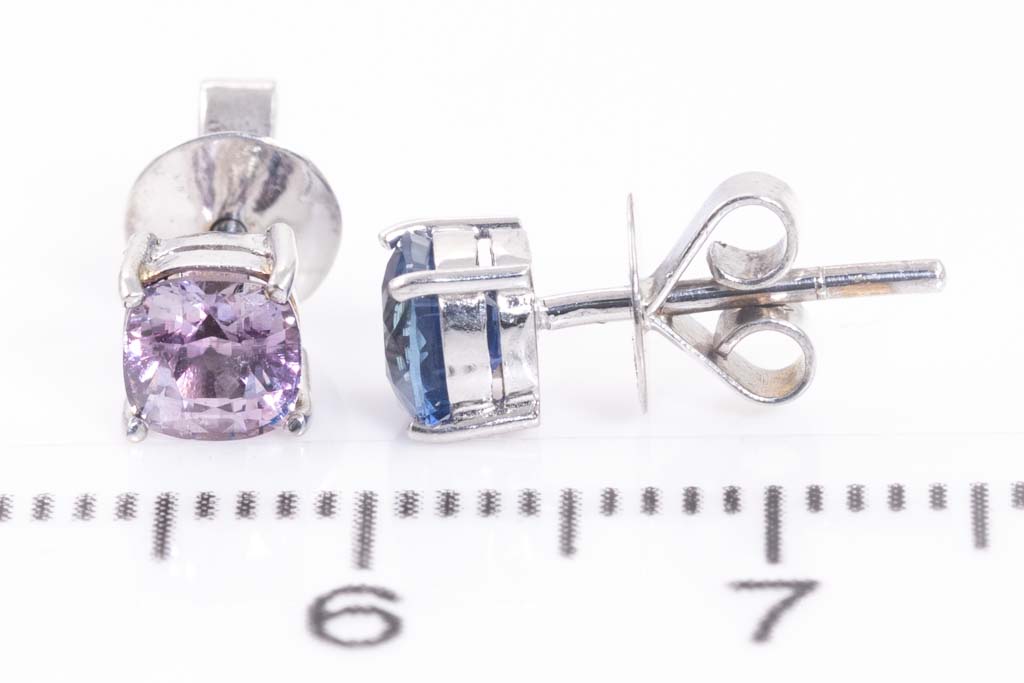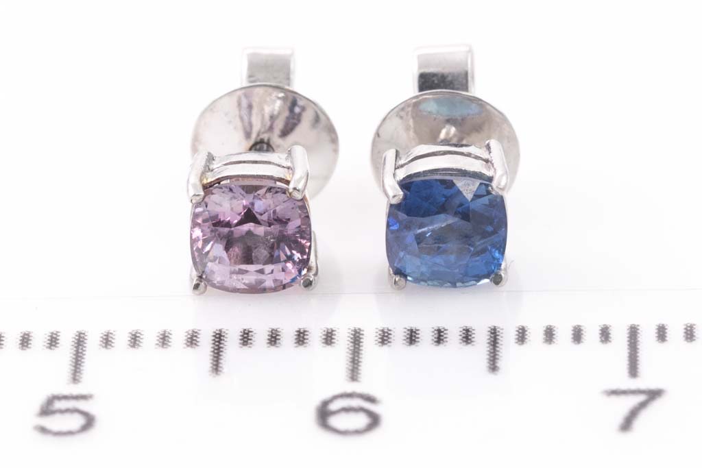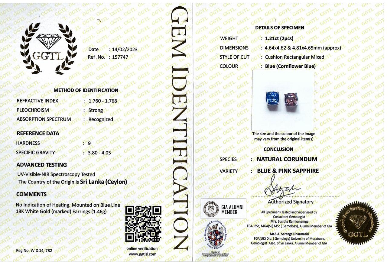 Sapphire stud earrings with a cushion cut unheated Ceylon blue Sapphire and a cushion cut unheated Ceylon pink Sapphire totalling 1.21cts. 18ct white gold. Weight: 1.4g. With certificate GGCL #157747. (As New)