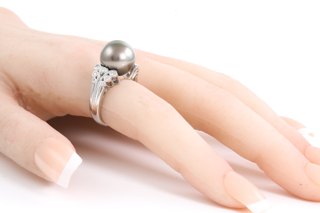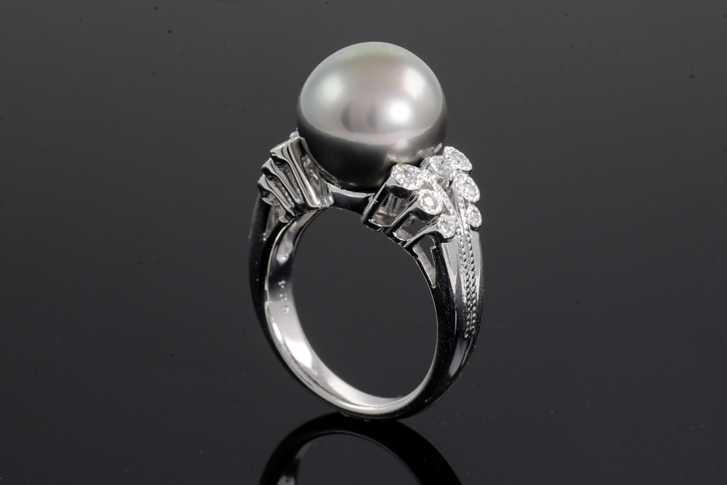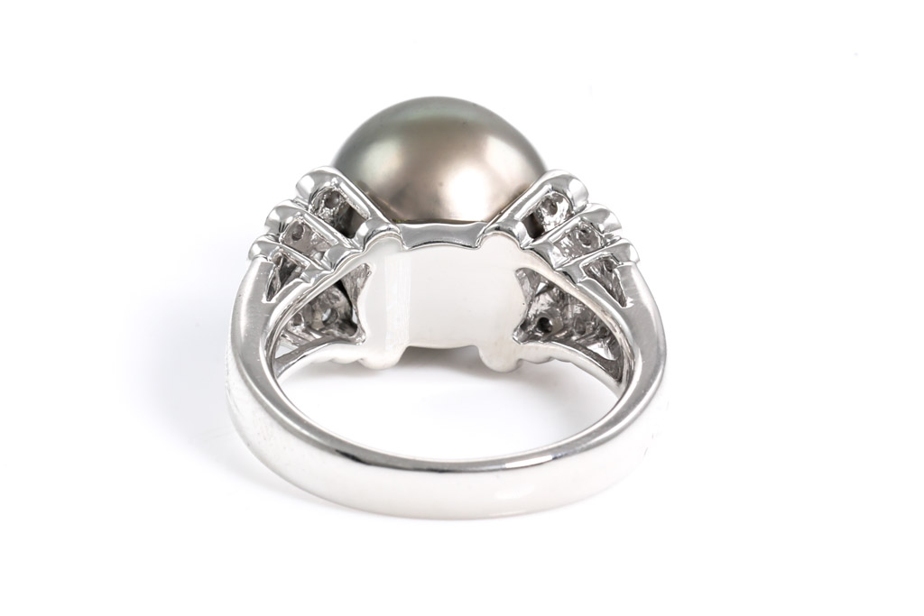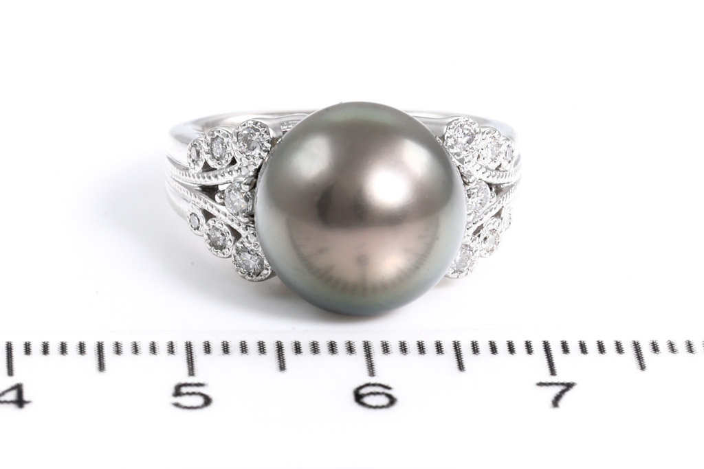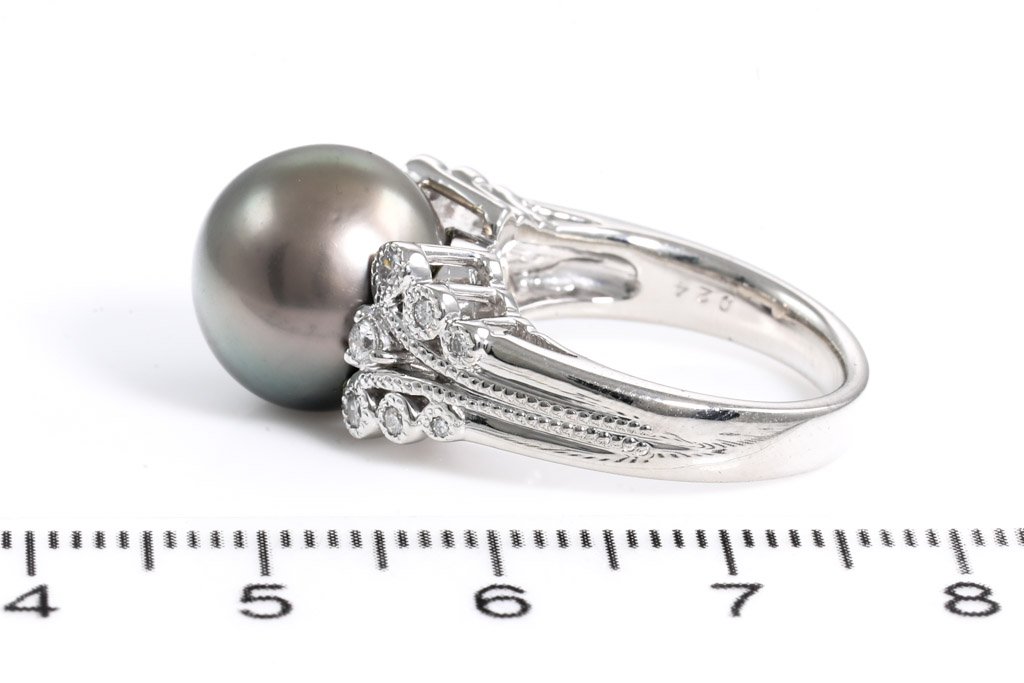 Pearl and Diamond ring with Tahitian Pearl of 12.1mm and round Diamonds totalling 0.24cts. Platinum. Ring size K1/2 - ring resizing is not recommended. Weight: 13.1g. (Pre-owned)
