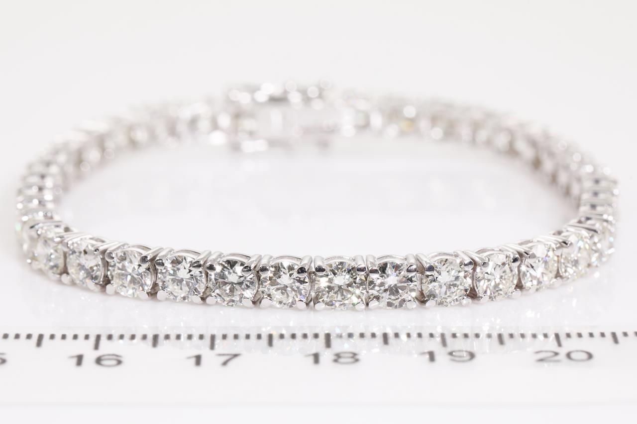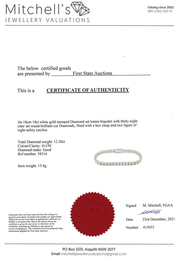 Diamond tennis bracelet with 38 round Diamonds totalling 12.20cts (Estimated grading: H-I SI). 18ct white gold. Length: 18cm. Weight: 15.8g. With certificate #415033. (New)