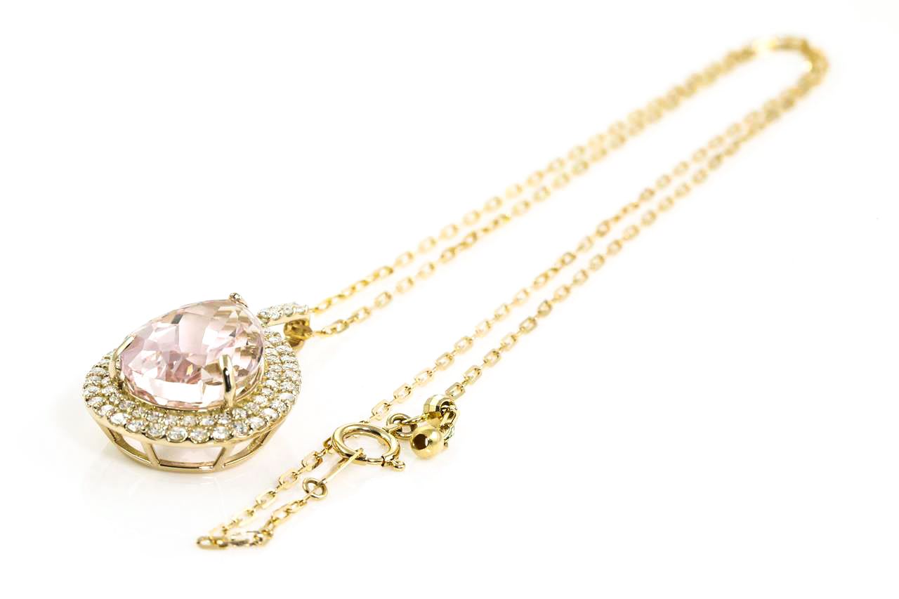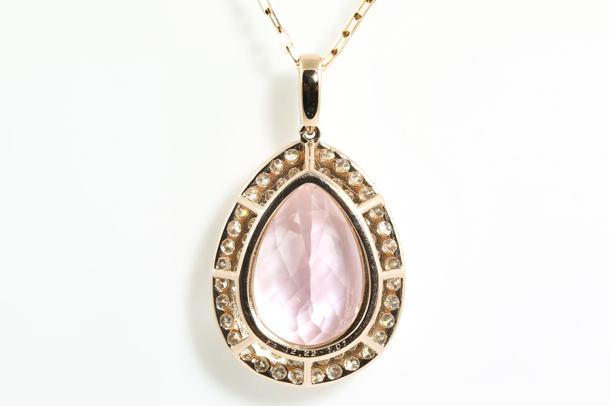Kunzite and Diamond pendant with a pear shape Kunzite of 12.22ct and Diamonds totalling 1.01cts (Estimated grading: H SI). 18ct yellow gold with 18ct gold 45cm adjustable chain. Weight: 8.4g (As New)