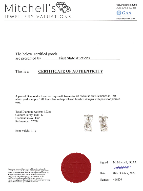 Diamond stud earrings with 2 old cut Diamonds totalling 1.22cts (Estimated grading: H P1-P2). 18ct white gold. Weight: 1.1g. With Certificate #416226. (Pre-owned).