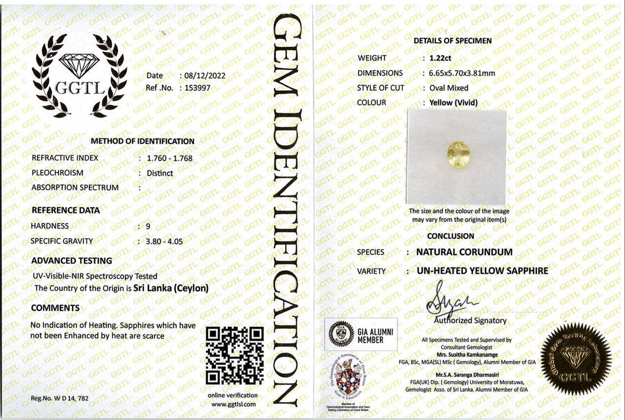 Loose oval cut unheated Ceylon Sapphire of 1.22ct. With gem report. (As New)