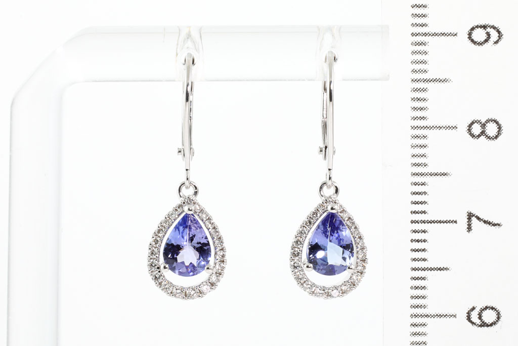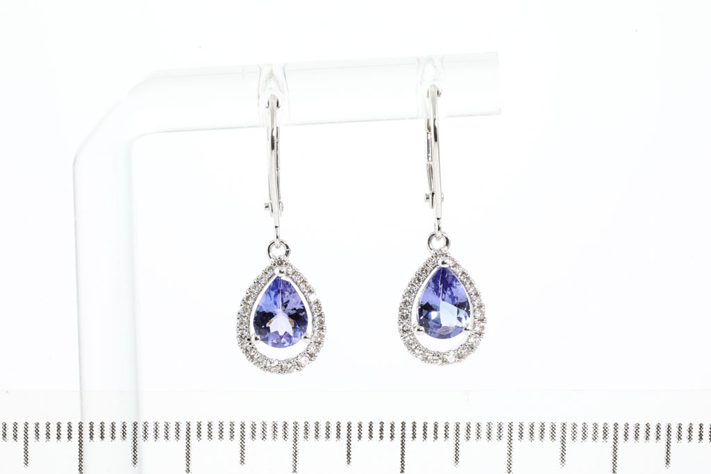 Tanzanite and Diamond leverback drop earrings with pear shape Tanzanite totalling 1.22cts and round Diamonds totalling 0.28cts. 18ct white gold. Weight: 2.7g. (New)