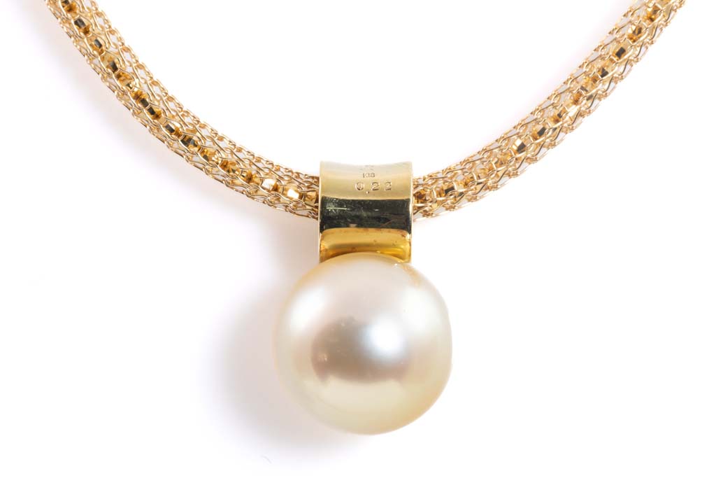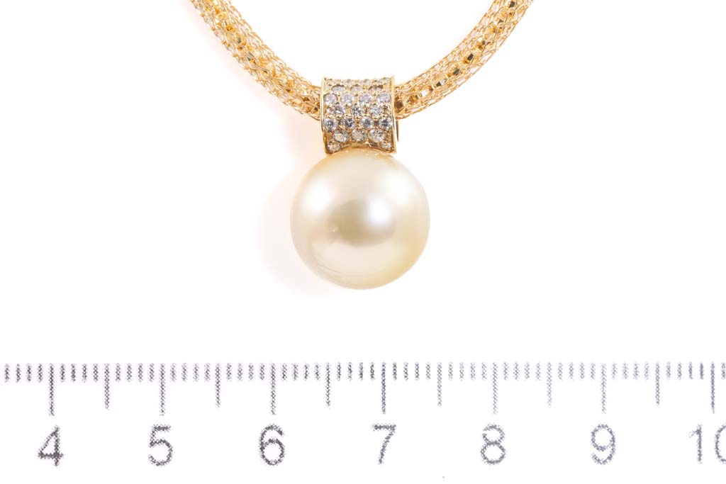 Pearl and Diamond pendant with Golden South Sea Pearl of 12.2mm and Diamonds totalling 0.22cts. 18ct yellow gold. Length: 40.5cm. Weight: 12.7g. (Pre-owned)
