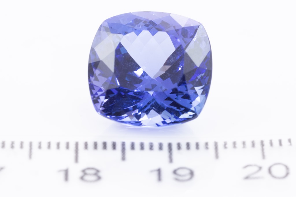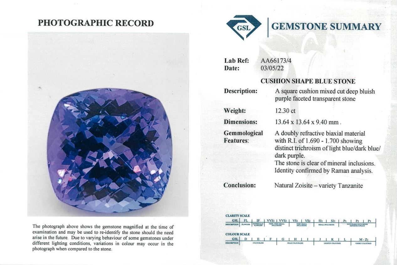 A loose cushion cut Tanzanite of 12.30ct (with GSL summary #AA66173/4). (As new)