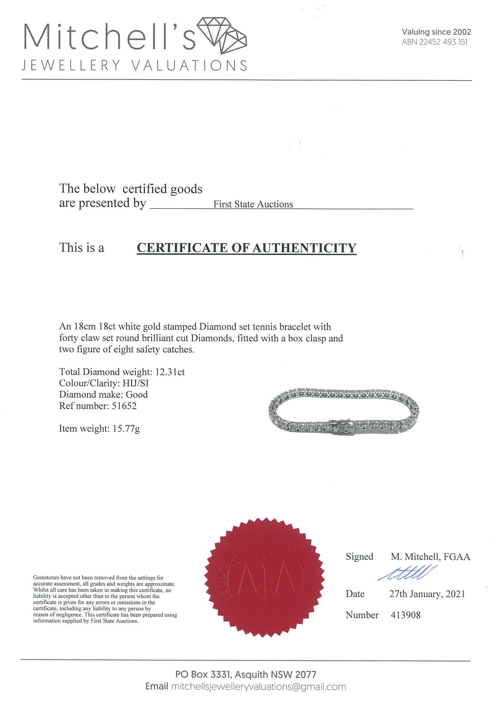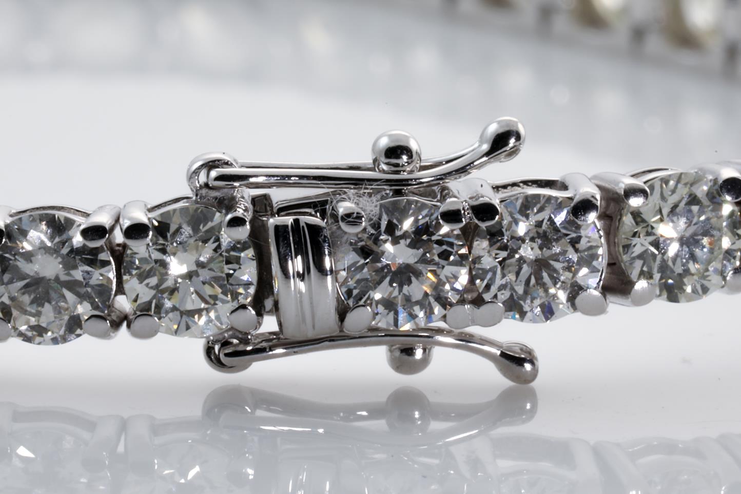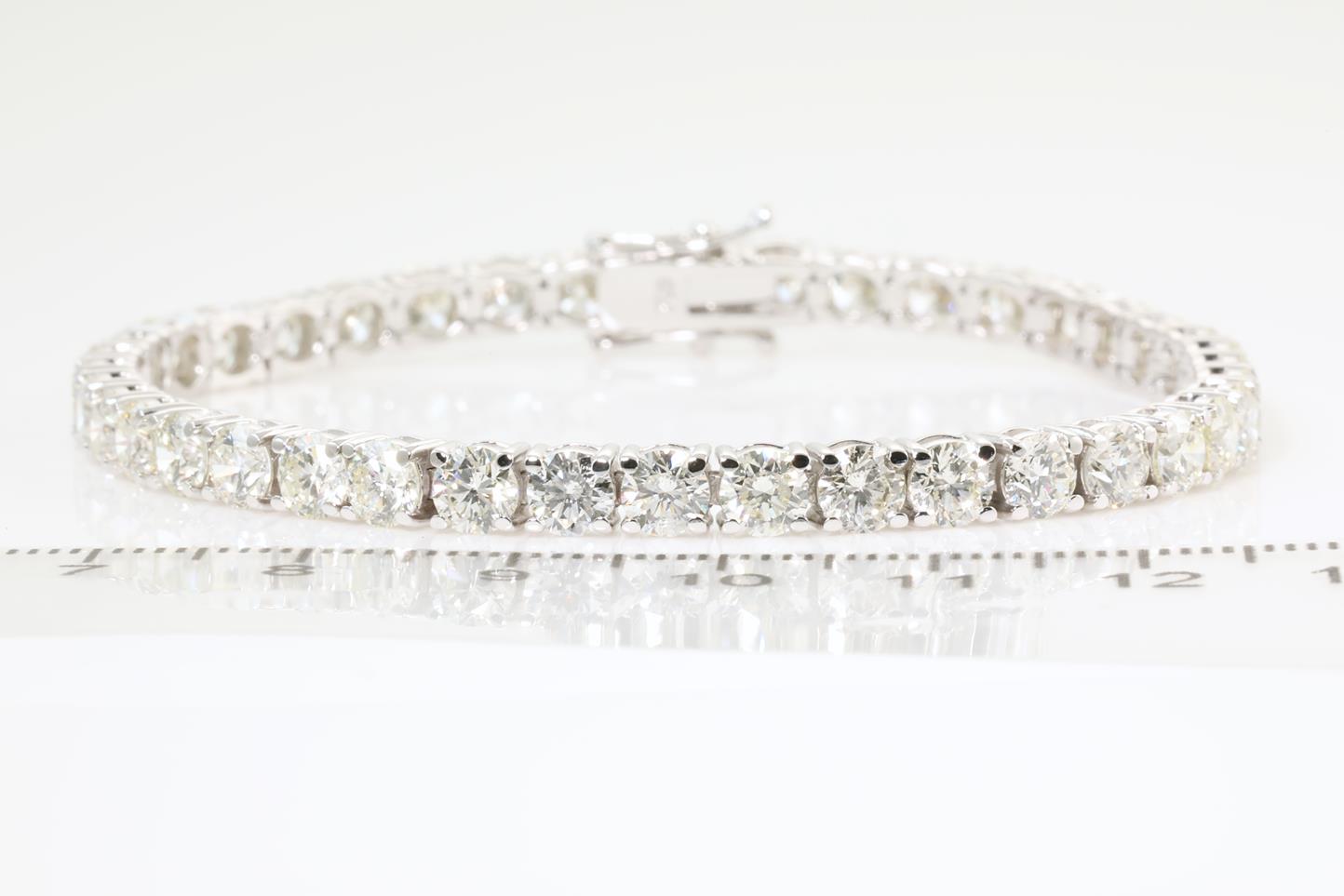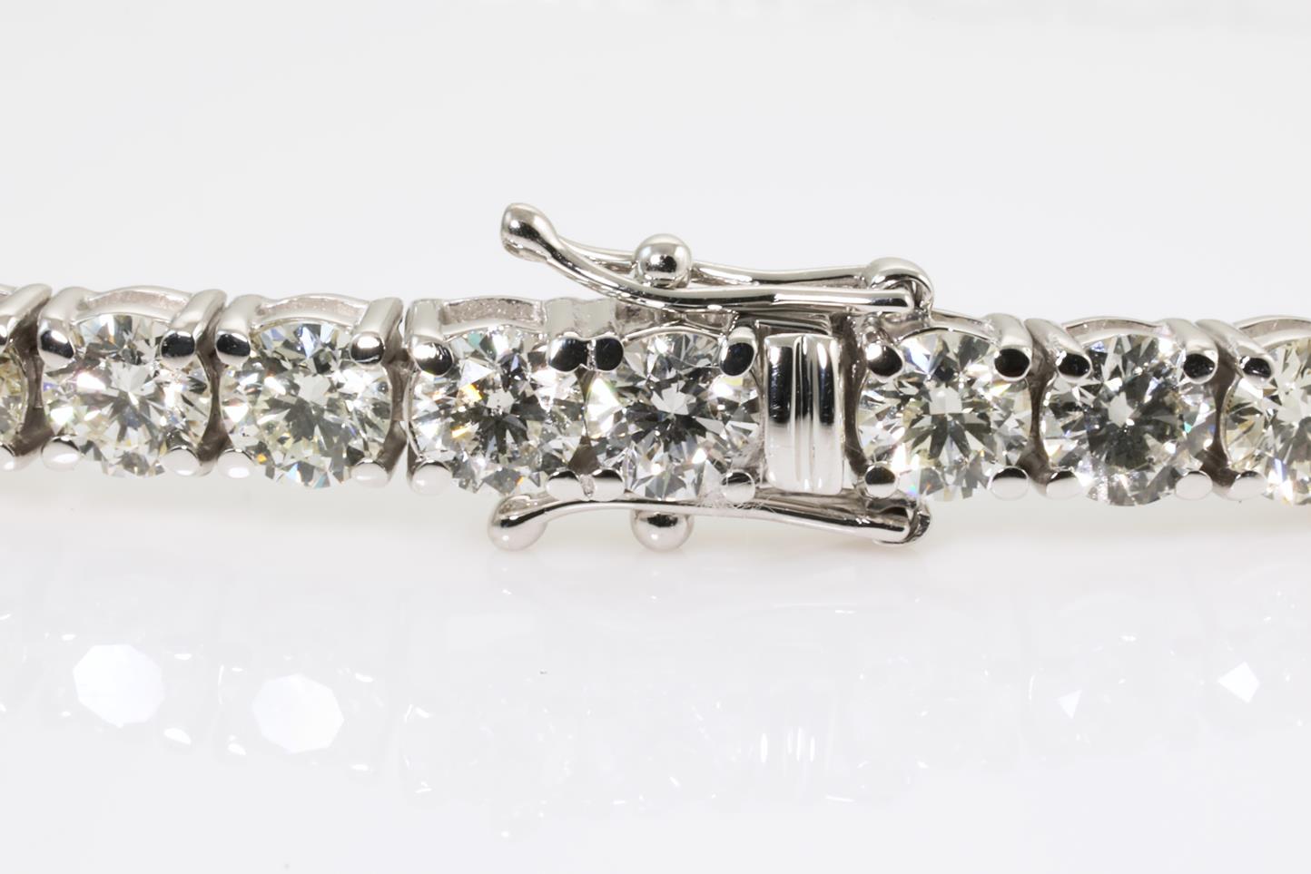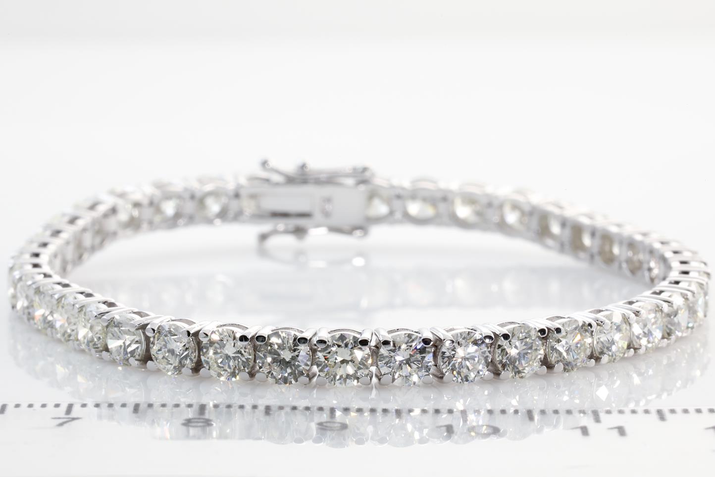 Diamond tennis bracelet with 40 round Diamonds totalling 12.31cts (Estimated grading: HIJ SI). 18ct white gold. Length: 18cm. Certificate #413908. Weight: 15.7g (New)
