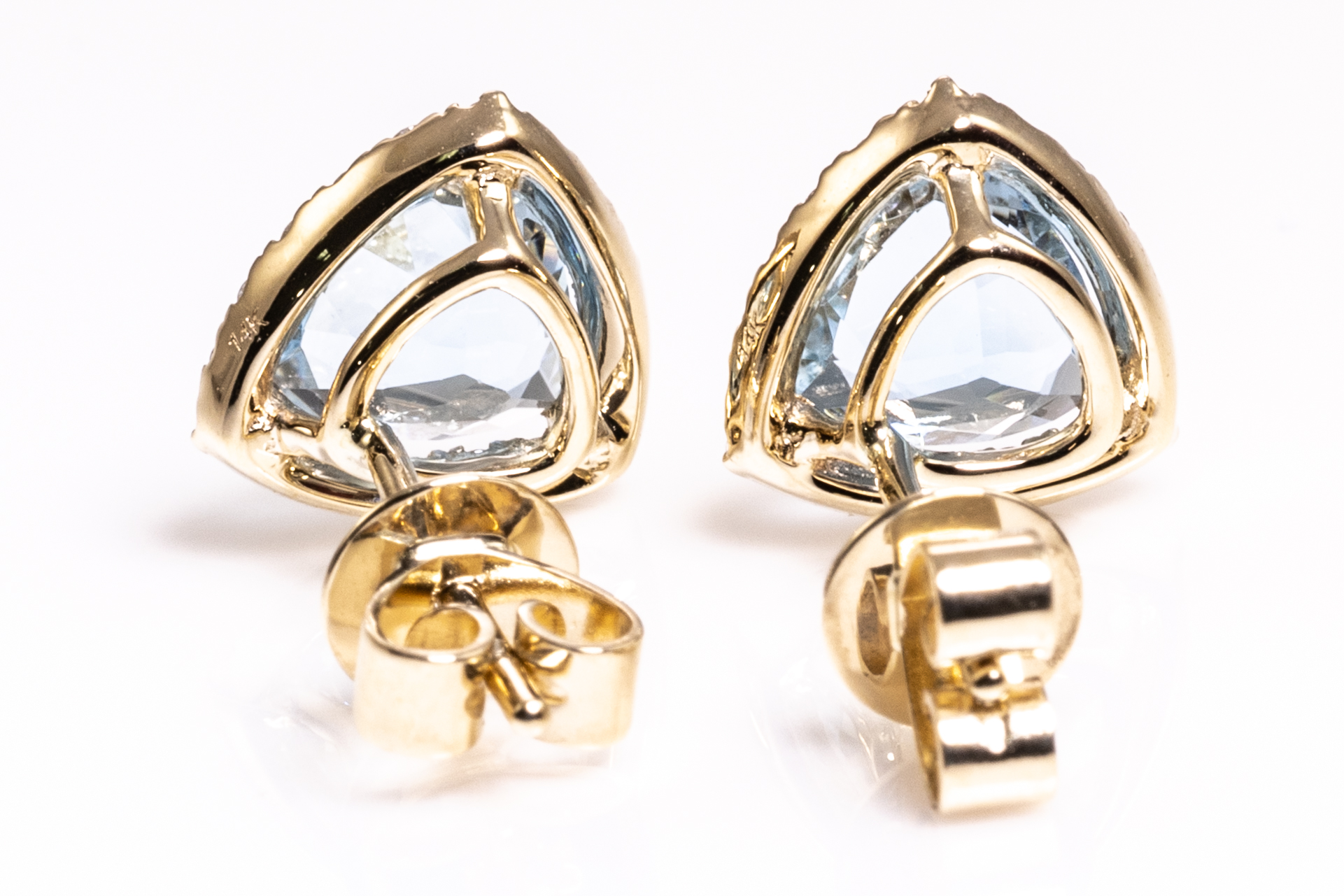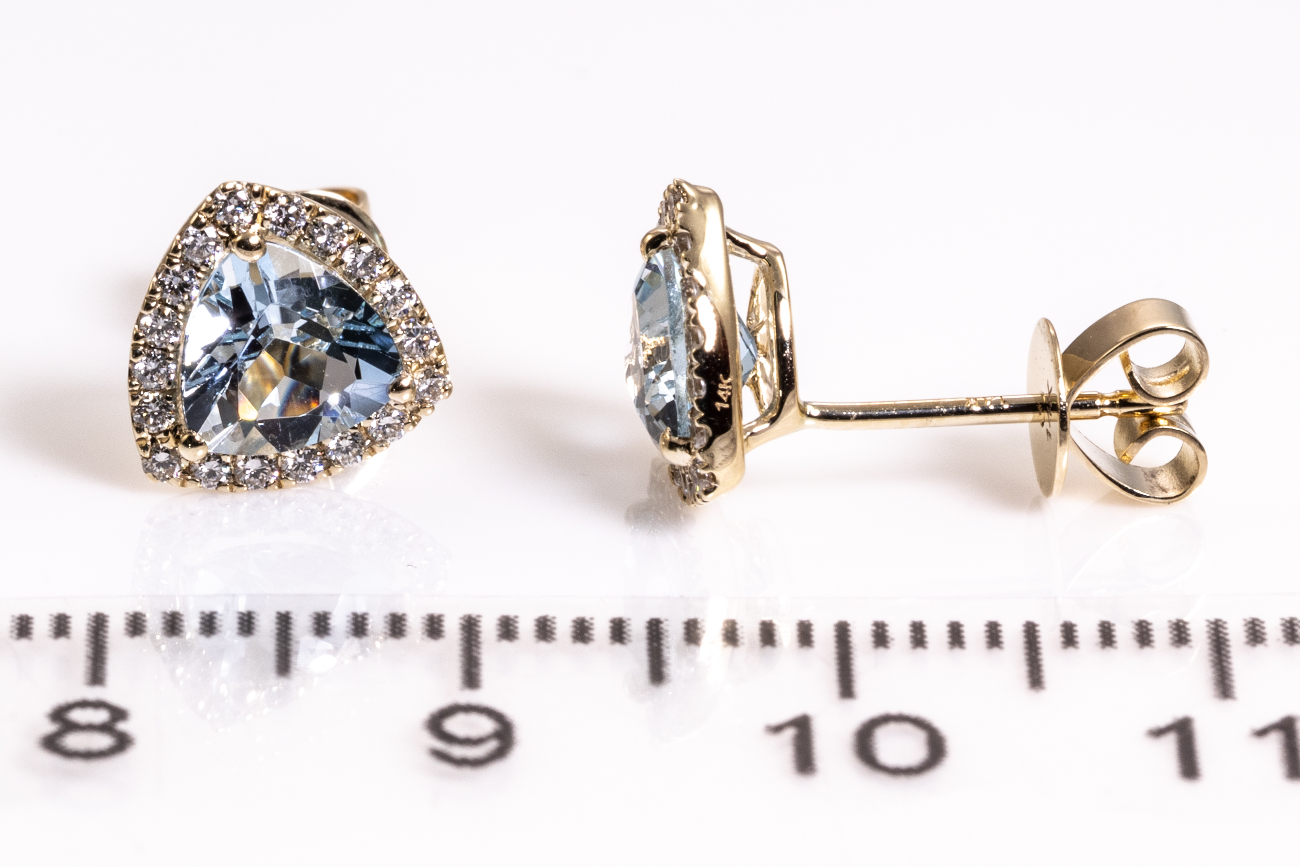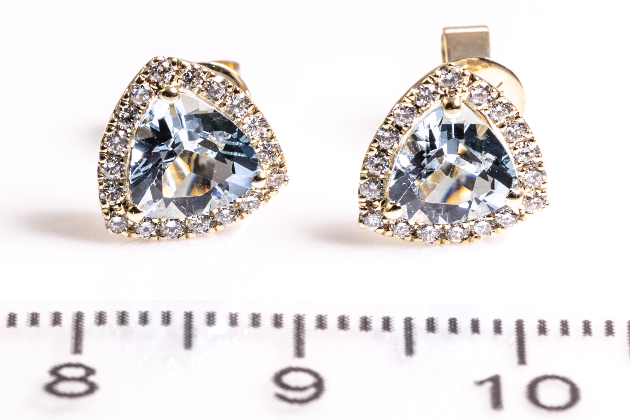 Aquamarine and Diamond earrings with trilliant cut Aquamarine totalling 1.23cts and Diamonds totalling 0.25cts. 14ct yellow gold. Weight: 1.8g. (New)