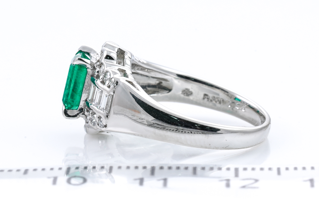 Emerald and Diamond ring with emerald cut Emerald of 1.23ct and baguette cut & round Diamonds totalling 0.67cts (Estimated grading: G-H SI). Platinum. Ring size O. Weight: 8.6g. (Pre-owned)