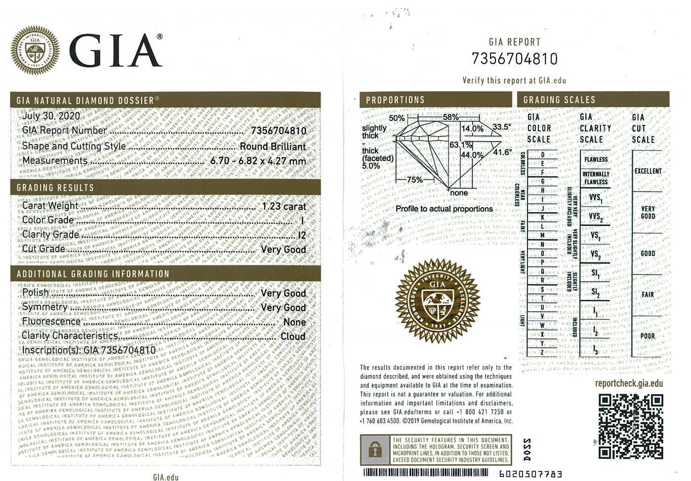 A loose round brilliant cut Diamond of 1.23ct (with GIA report graded as I P2 #7356704810). (New)