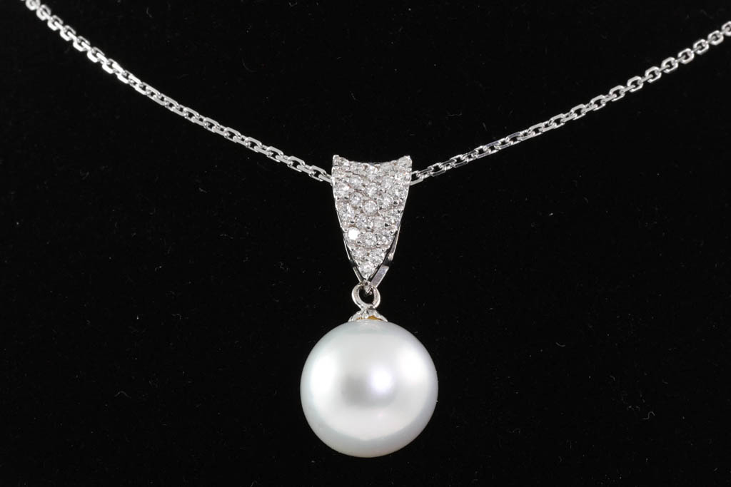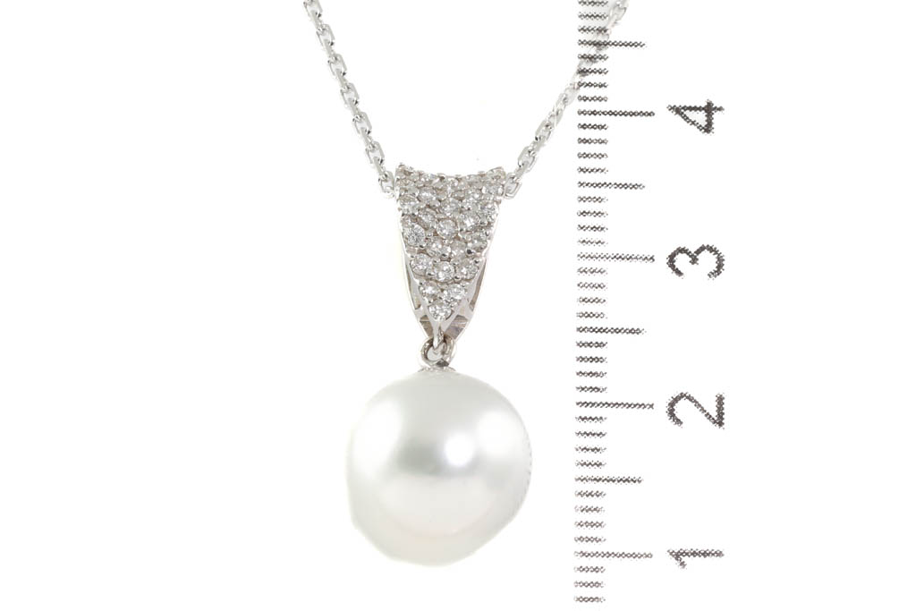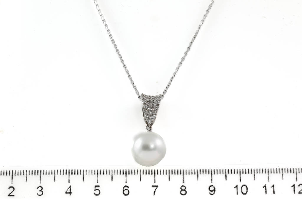 Pearl and Diamond pendant with South Sea Pearl of 12.3mm and round Diamonds totalling 0.30cts (Estimated grading: H SI). 18ct white gold with 18ct white gold 46cm chain. Weight: 7.3g. (Pre-owned)