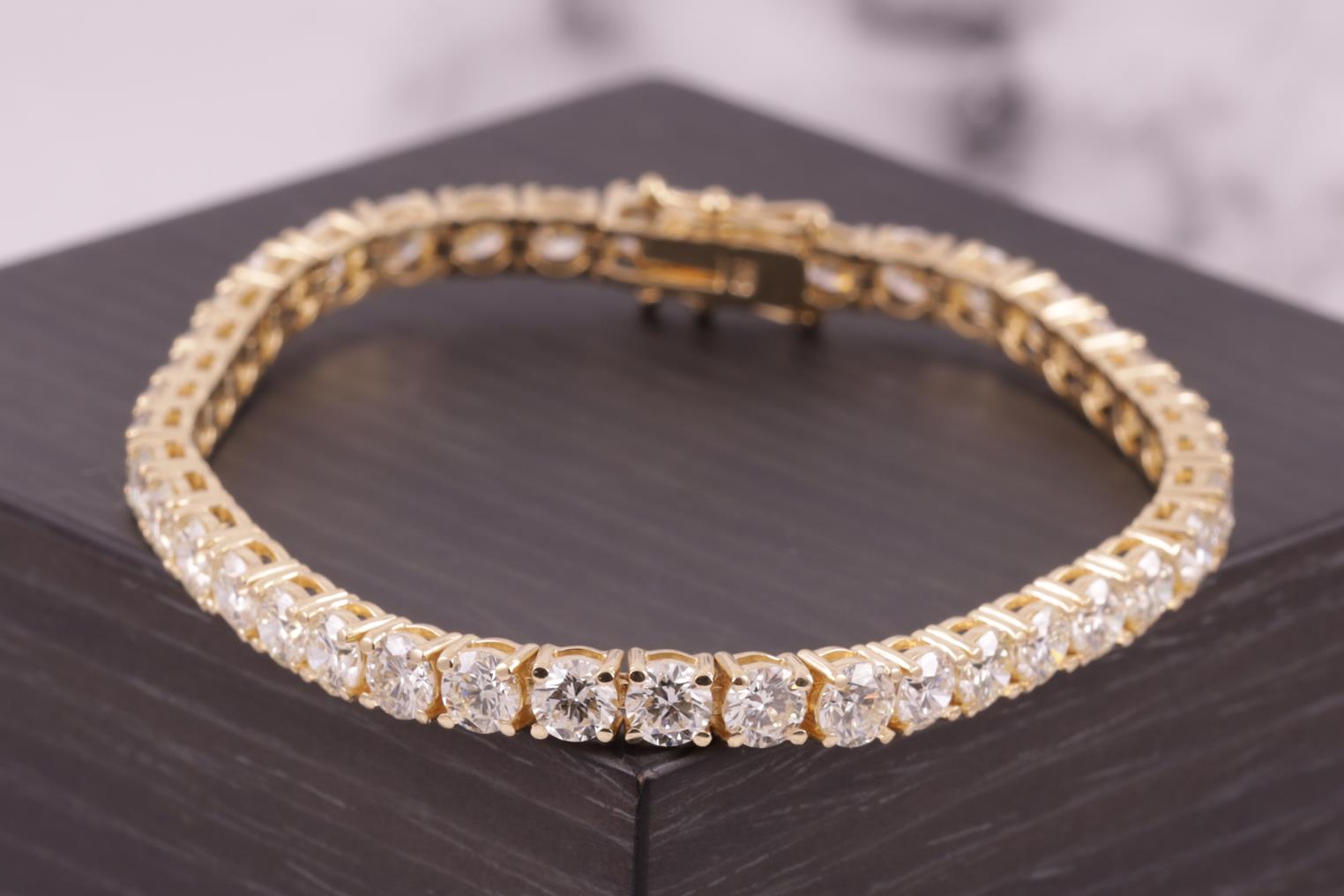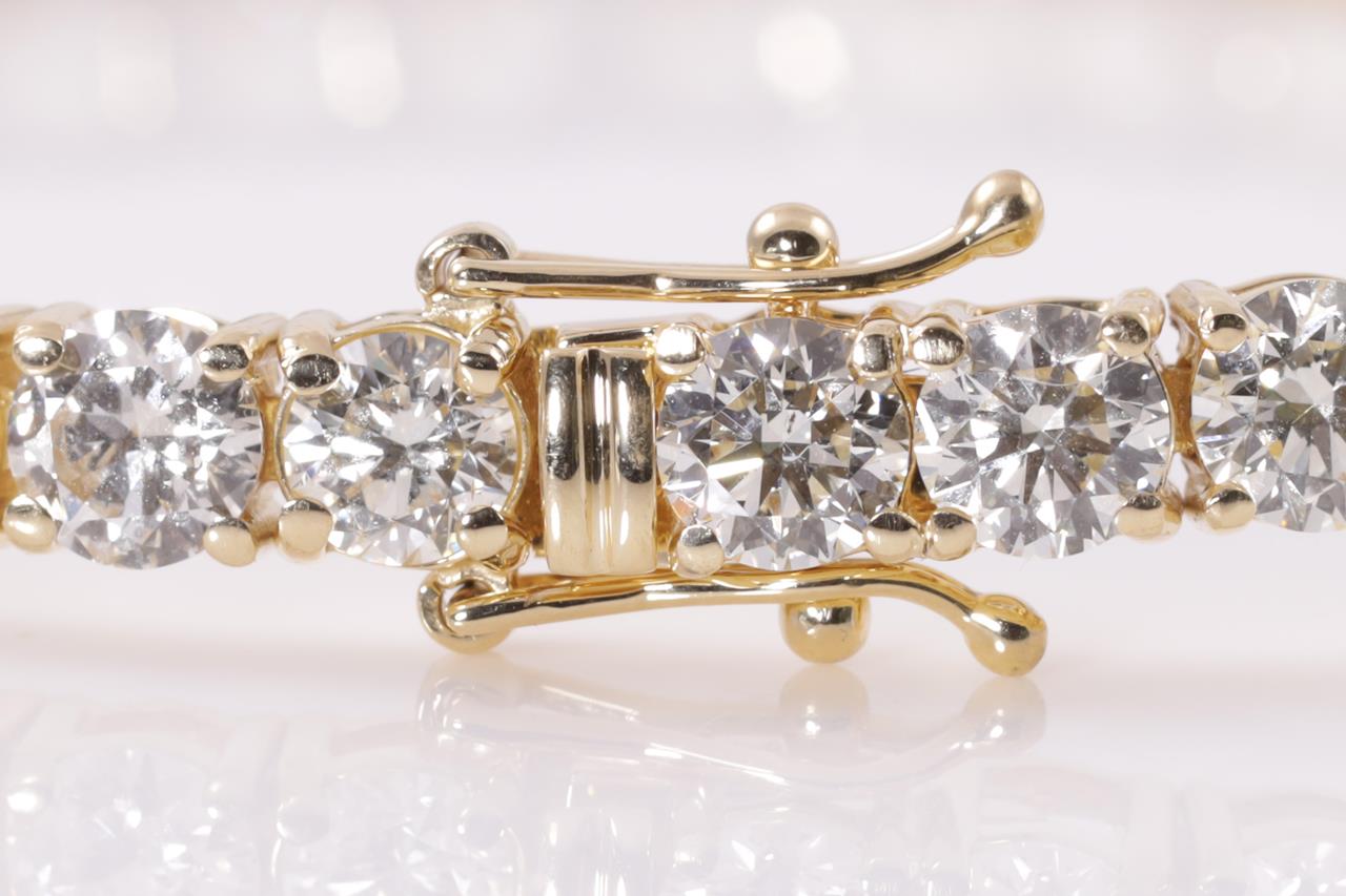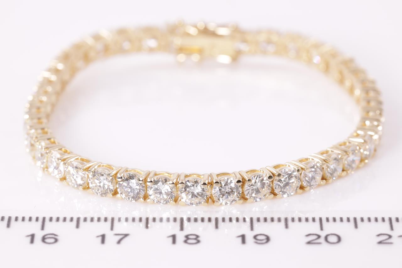 Diamond tennis bracelet with 40 round Diamonds totalling 12.42cts (Estimated grading: K VS-SI). 18ct yellow gold. Length: 18cm. Weight: 16.5g. With certificate #414884. (New)