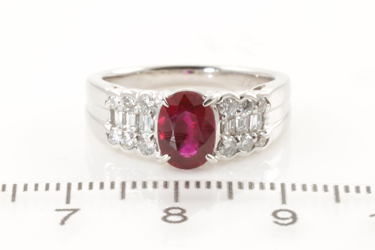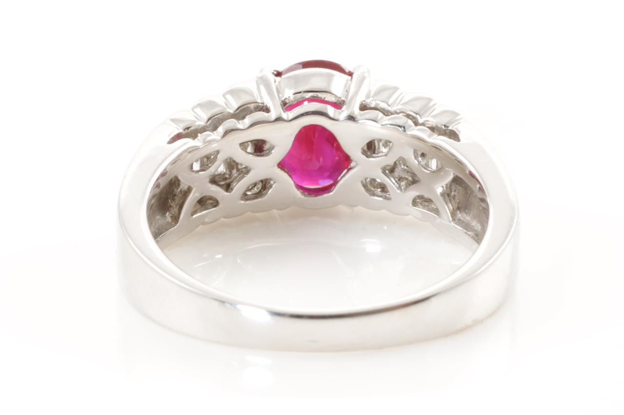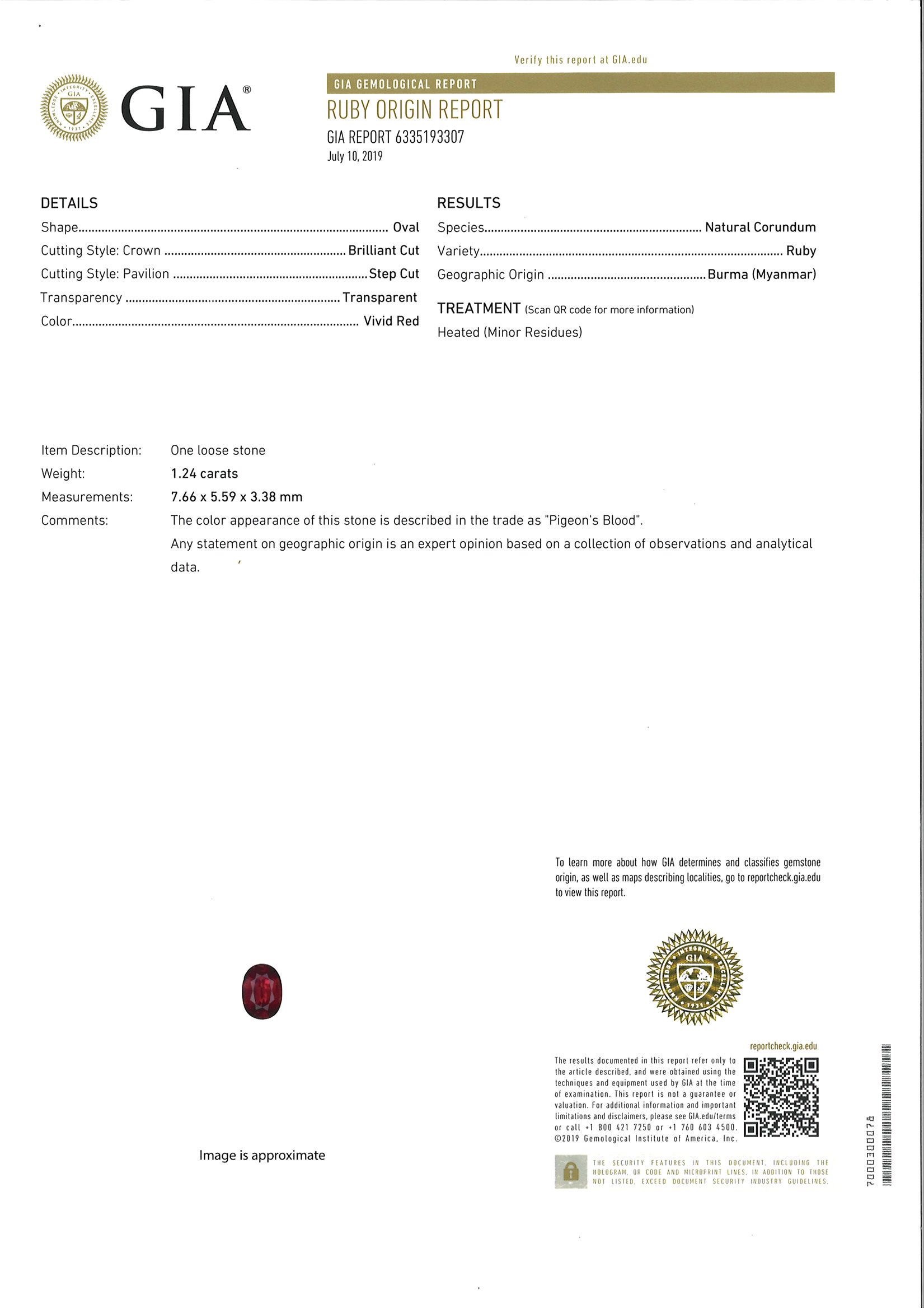 Ruby and Diamond ring with an oval Burmese Pigeon's Blood Ruby of 1.24ct (With GIA report #6335193307) and Diamonds totalling 0.49cts (Estimated grading: F-G VS-SI). Platinum. Ring size M. Weight: 7.8g. (Pre-owned)
