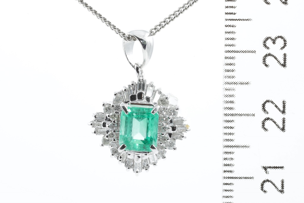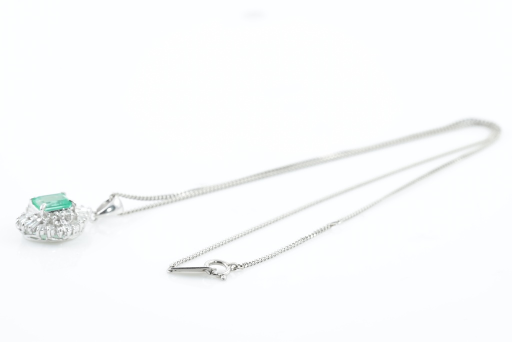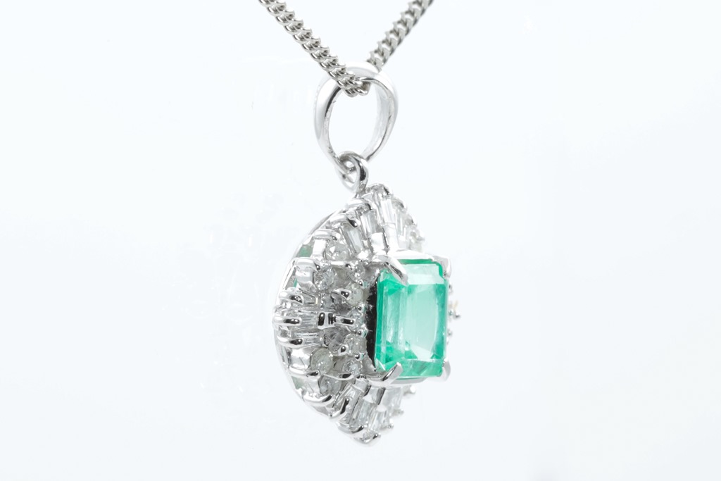 Emerald and Diamond pendant with emerald cut Emerald of 1.24ct and round & baguette cut Diamonds totalling 0.48cts (Estimated grading: G-H SI-P1). Platinum with adjustable 40cm chain. Weight: 7.4g. (Pre-owned)
