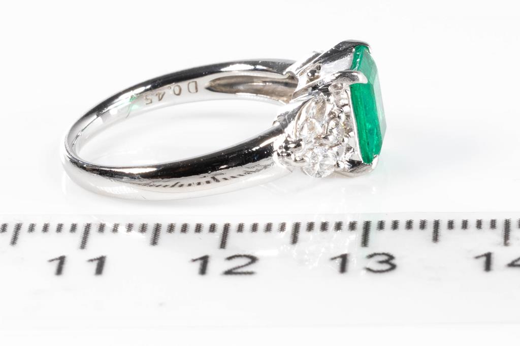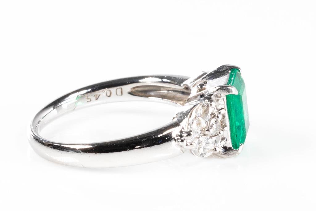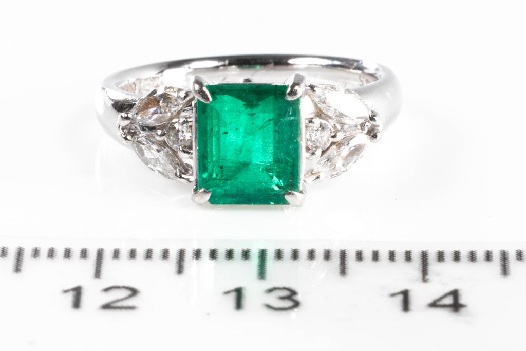 Emerald and Diamond ring with octagonal step cut Emerald of 1.24ct and round & marquise cut Diamonds totalling 0.45cts (Estimated grading: G VS). Platinum. Ring size M. With copy of certificate #413303. Weight: 5.95g (Pre-owned)