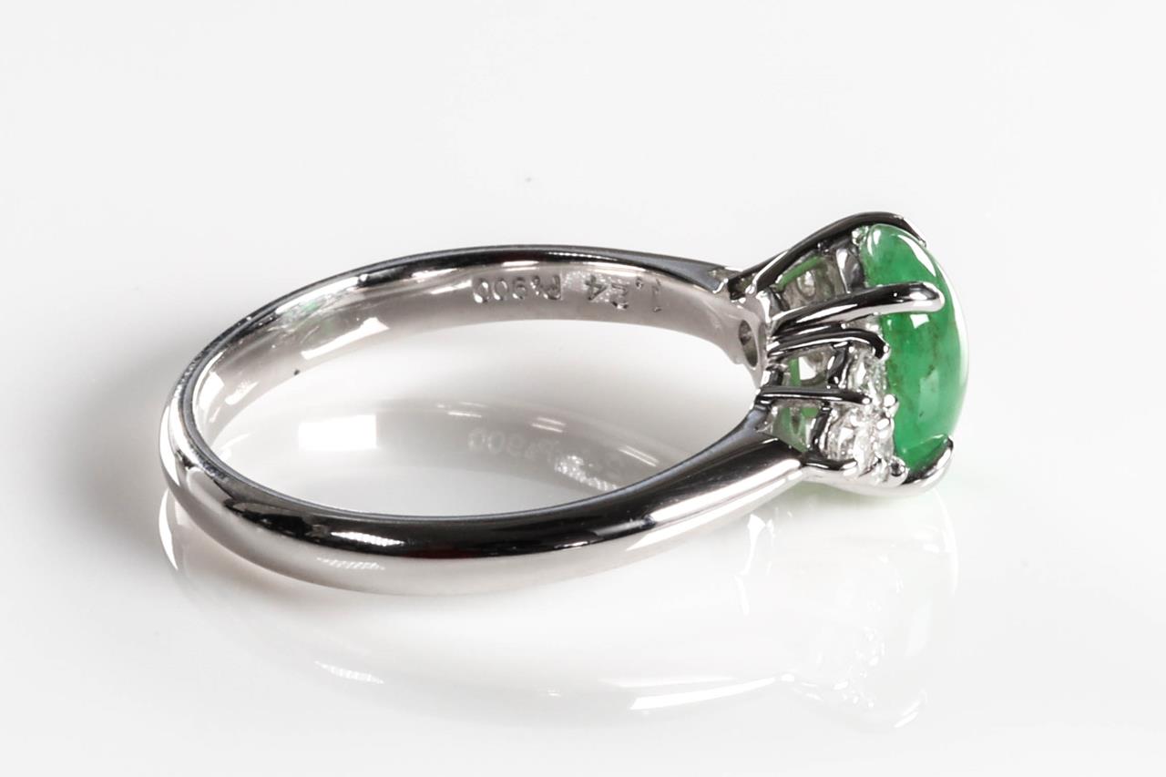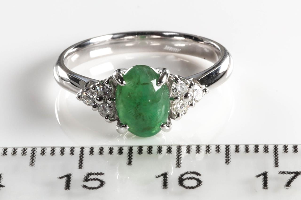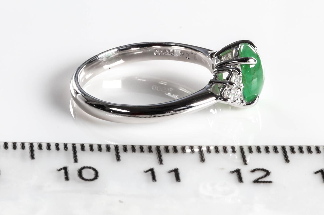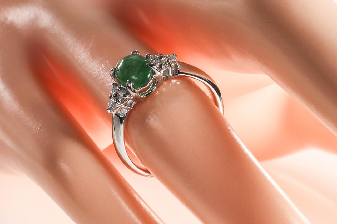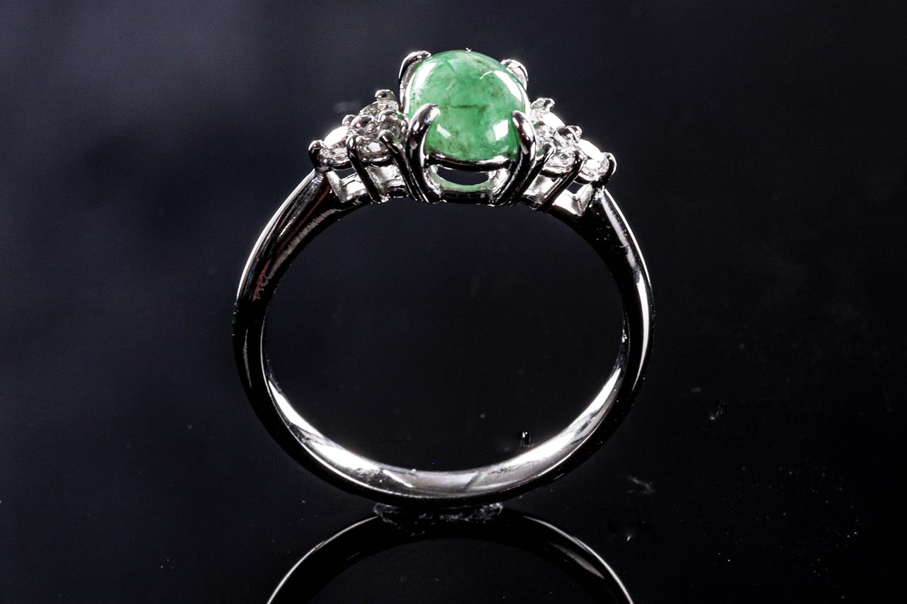Jade and Diamond ring with centre oval cabochon cut natural Jadeite jade of 1.24cts and surrounding round Diamonds totalling 0.21cts. Platinum. Ring size: L. Weight: 4.2g. (Pre-owned)