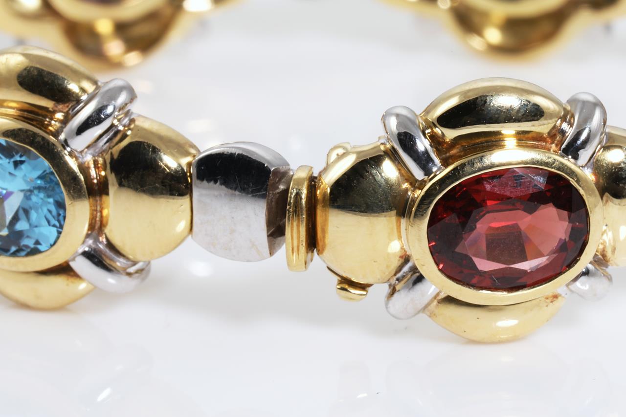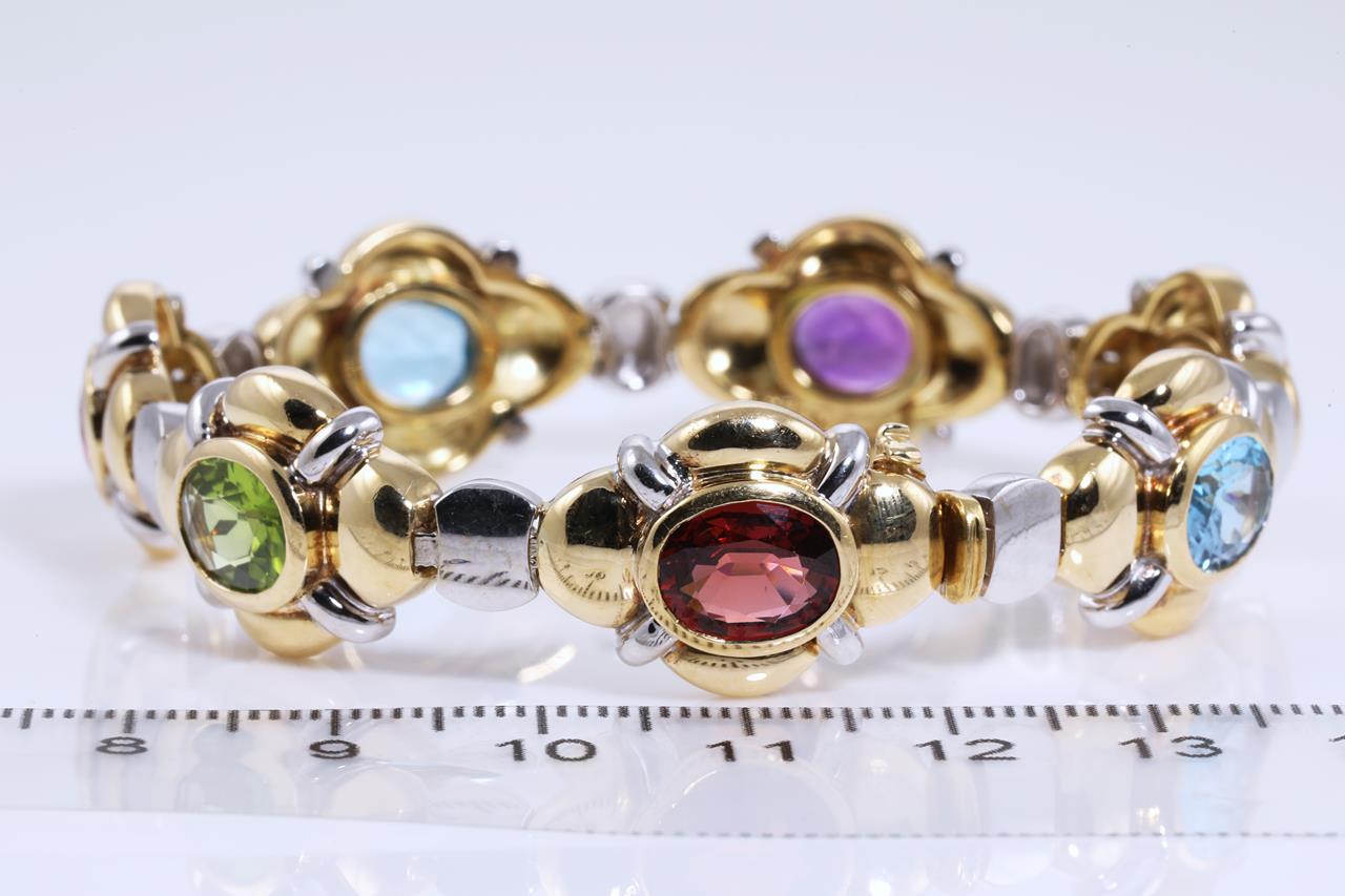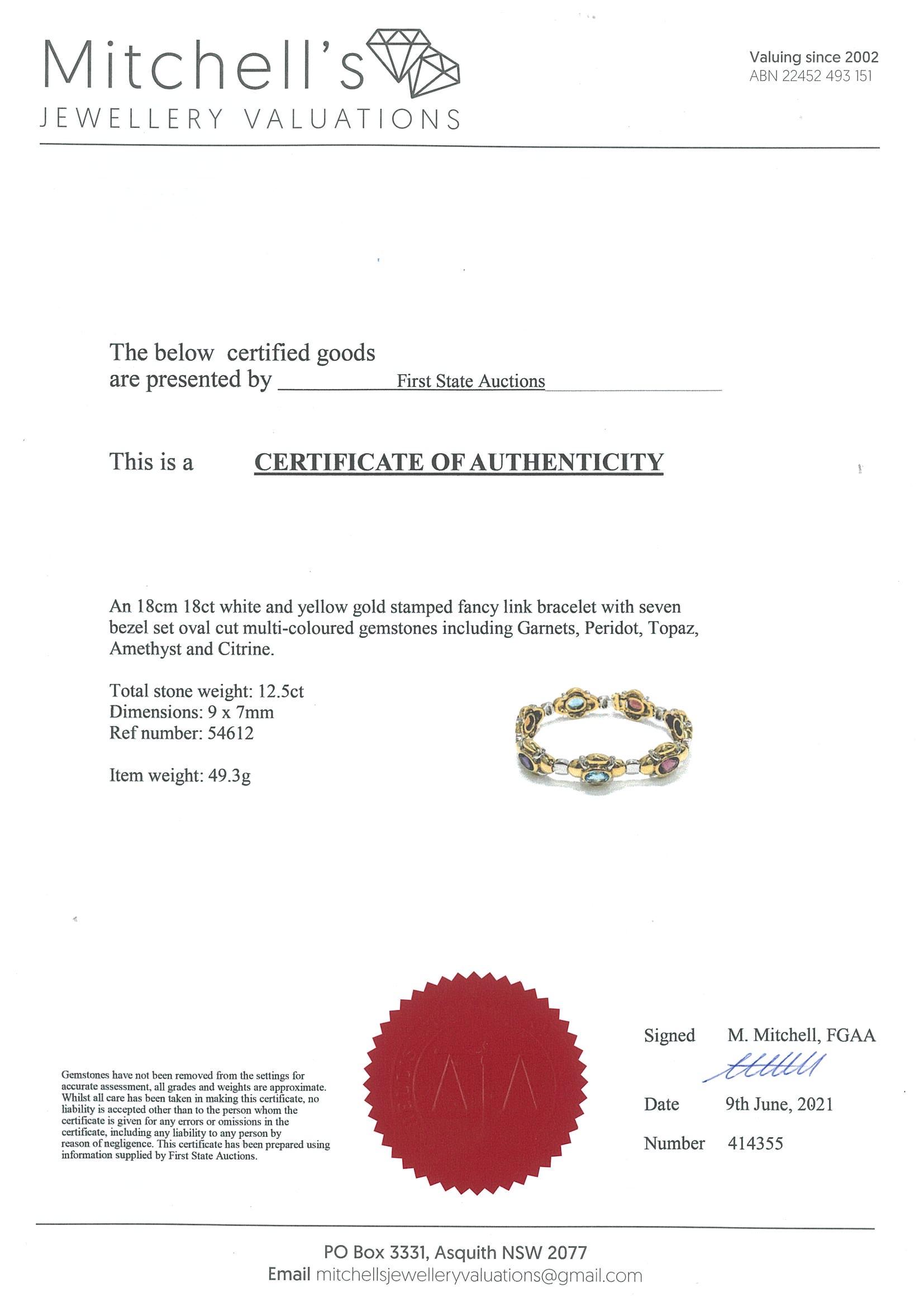 Mixed gemstones bracelet with oval Garnet, Peridot, Topaz, Amethyst & Citrine totalling approximately 12.50cts. 18ct yellow & white gold. Length: 18cm Weight: 49.3g. With certificate #414355. (Pre-owned)