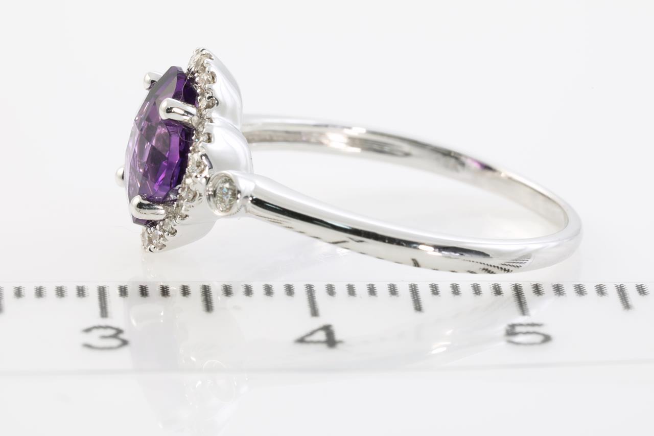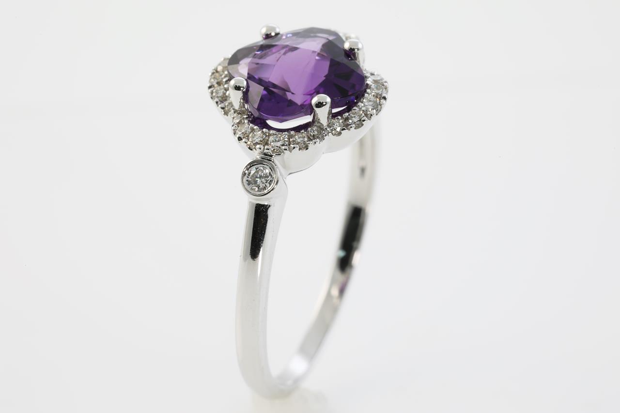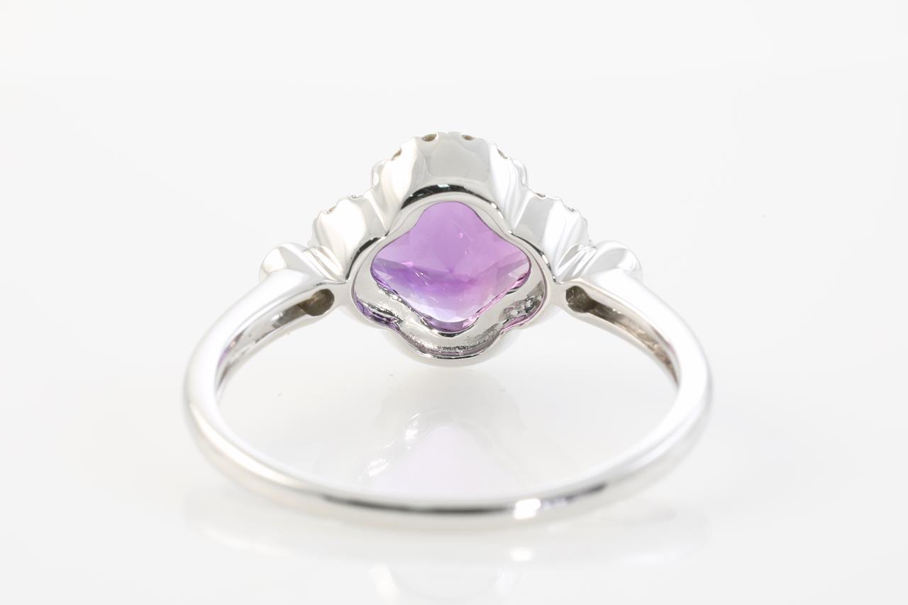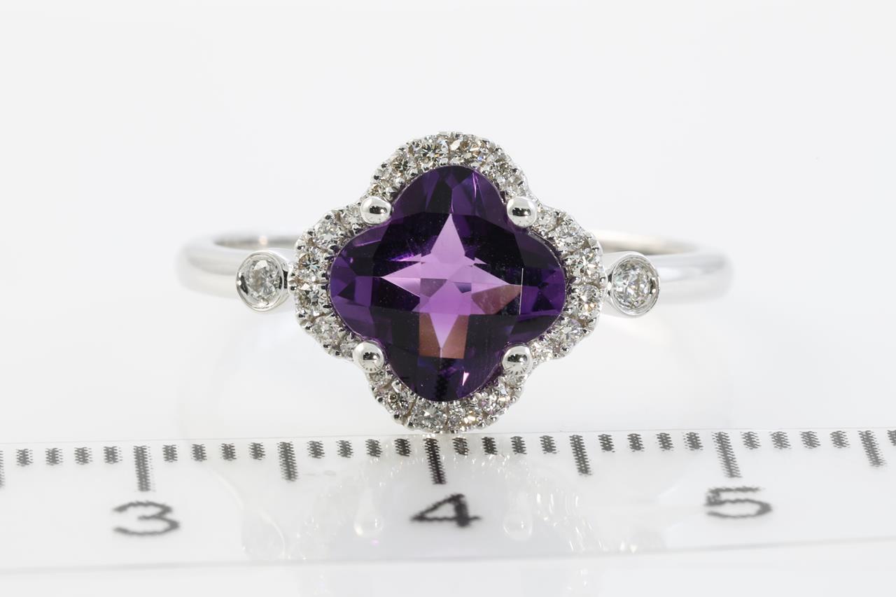 Amethyst and Diamond ring with fancy shape Amethyst of 1.25ct and Diamonds totalling 0.18cts. 14ct White gold. Ring size N1/2. Weight: 2.6g (New)