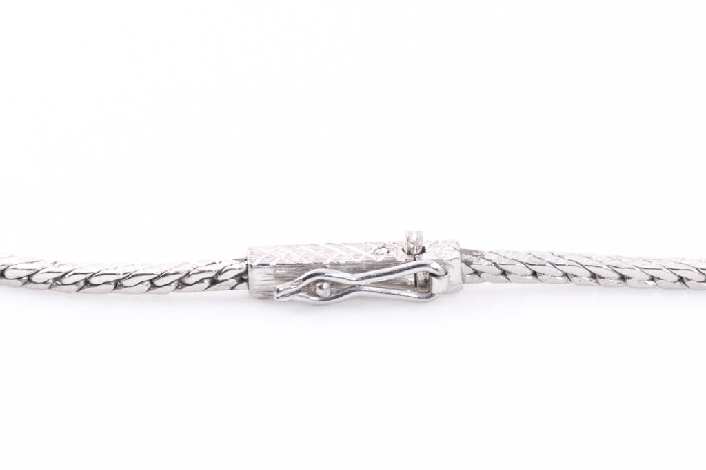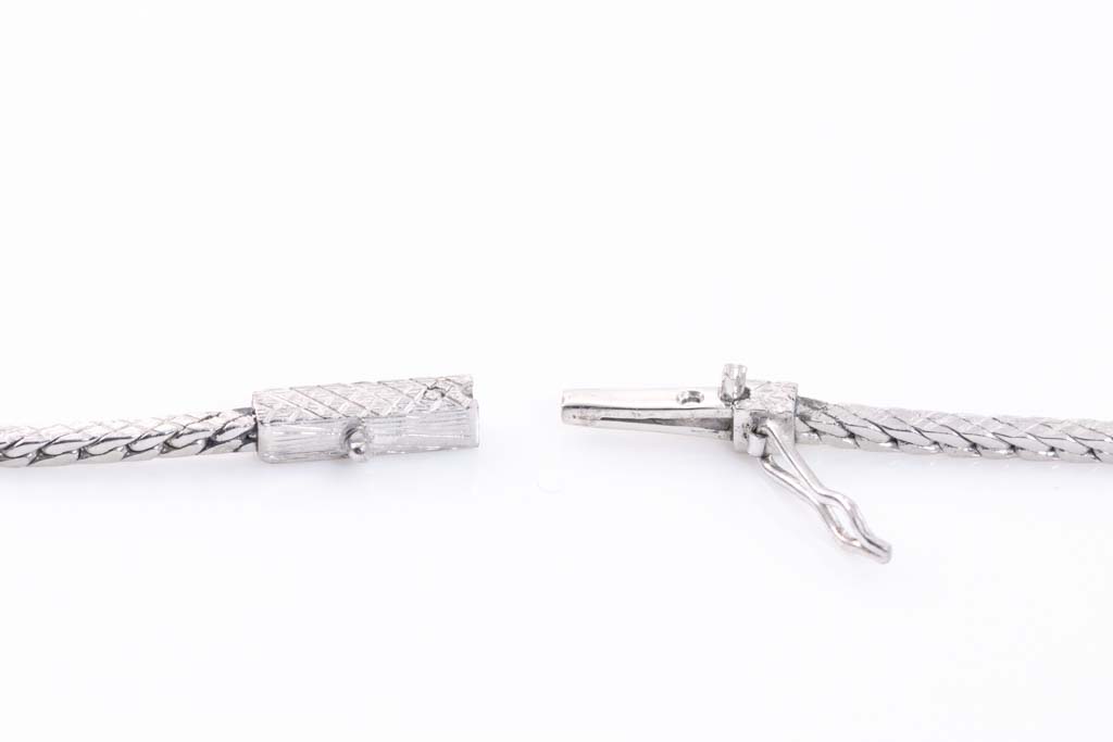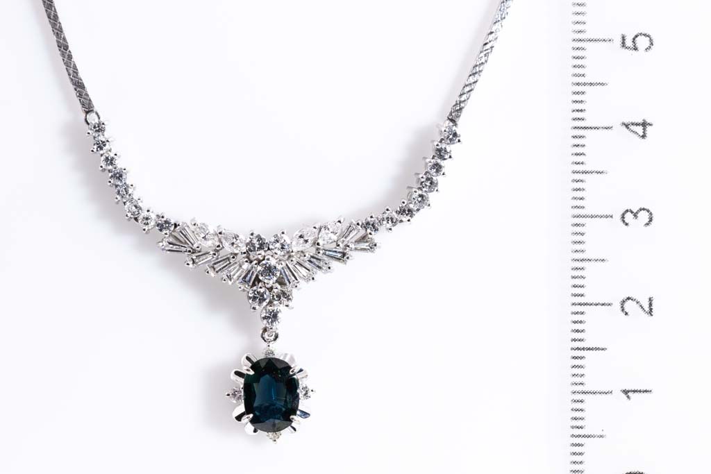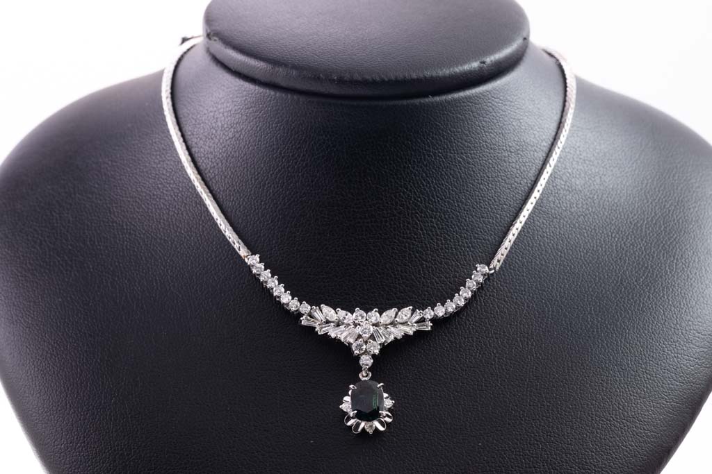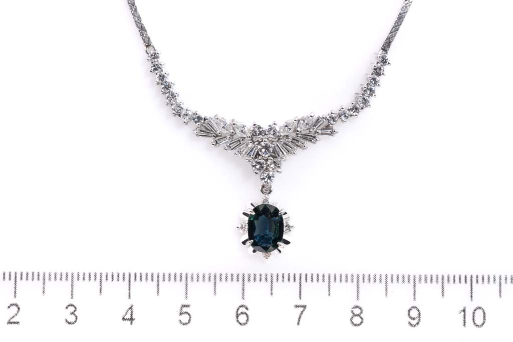 Sapphire and Diamond necklace with oval shape blue Sapphire of 1.25ct and round, baguette & marquise cut Diamonds totalling 1.93cts (Estimated grading: H-I SI). Platinum-850 and 18ct white gold with platinum-900 chain. Length: 39cm. Weight: 18.3g. (Pre-owned)