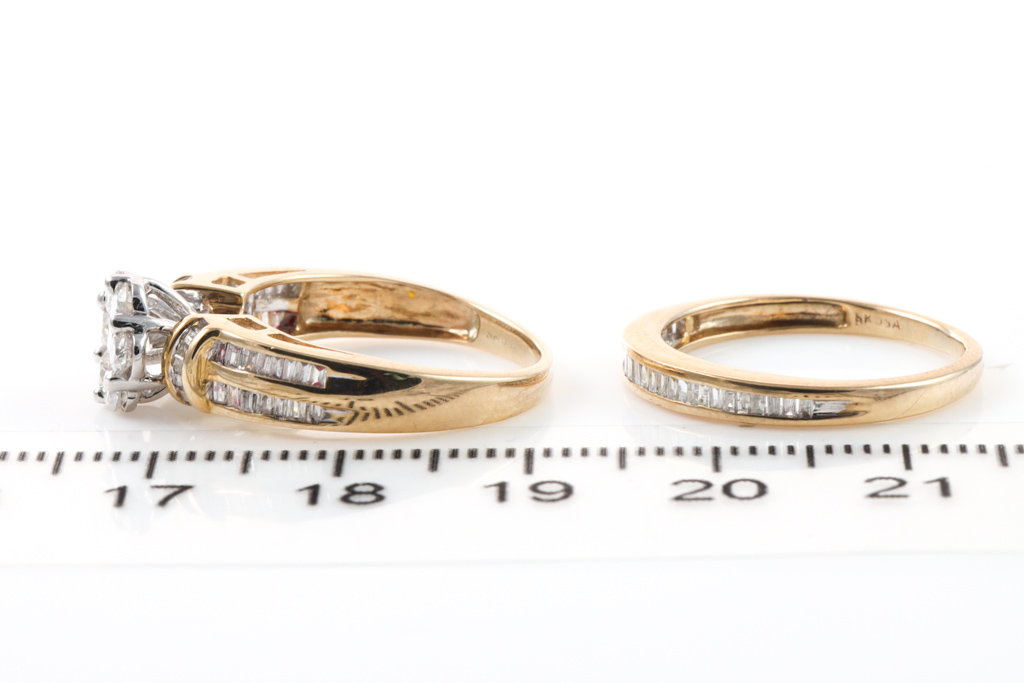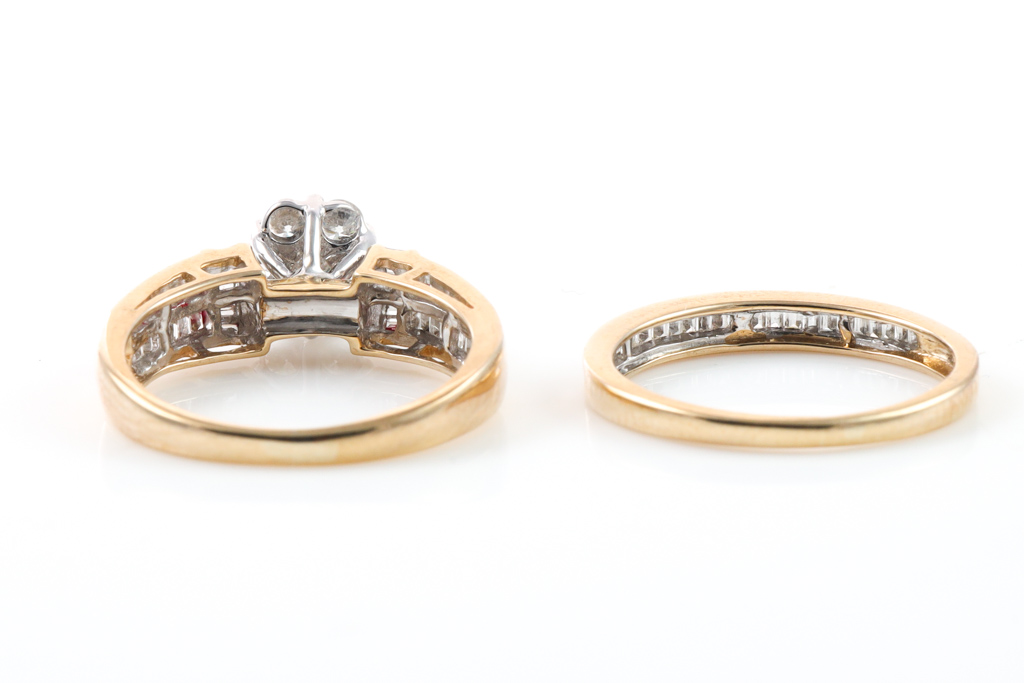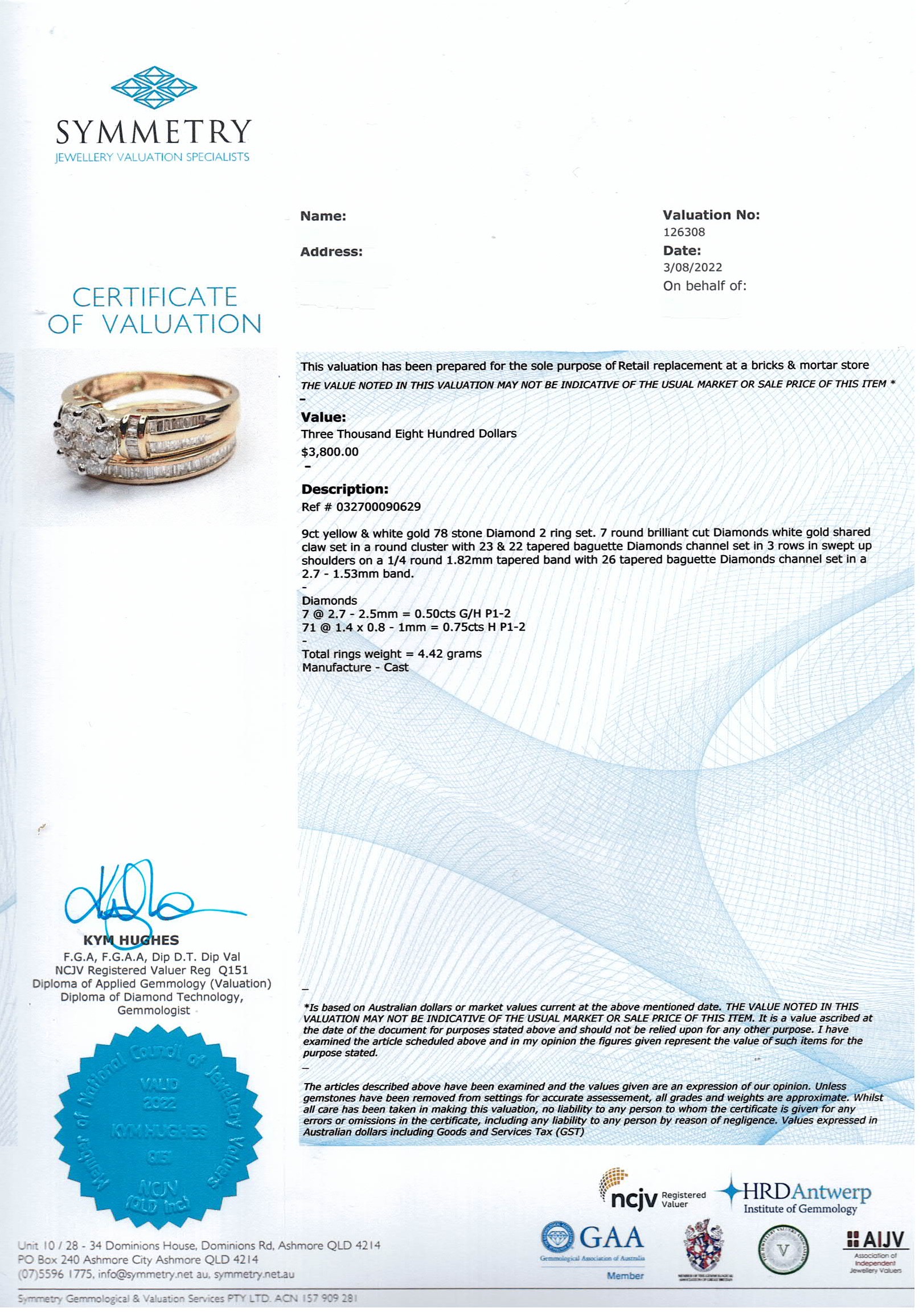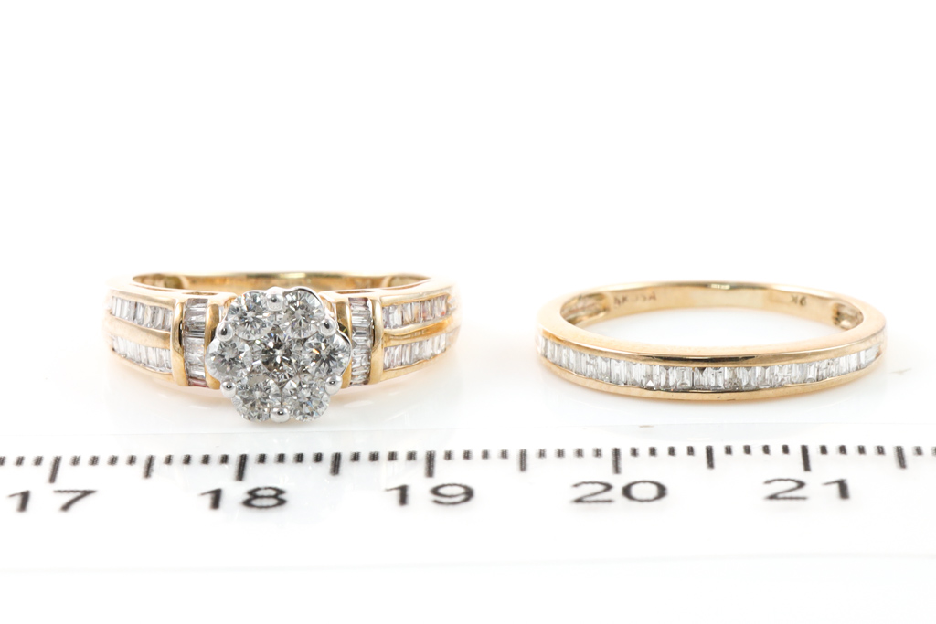 Set of 2 diamond rings. Main ring with round and baguette Diamonds of 0.75ct and diamond eternity ring baguette cut diamonds totalling 0.50cts. 9ct yellow and white gold. Ring size L. Combined weight: 4.4g. With Valuation Certificate #032700090629.