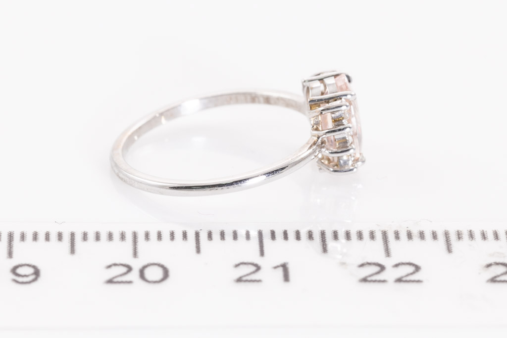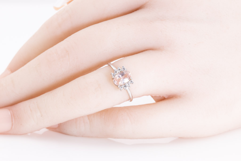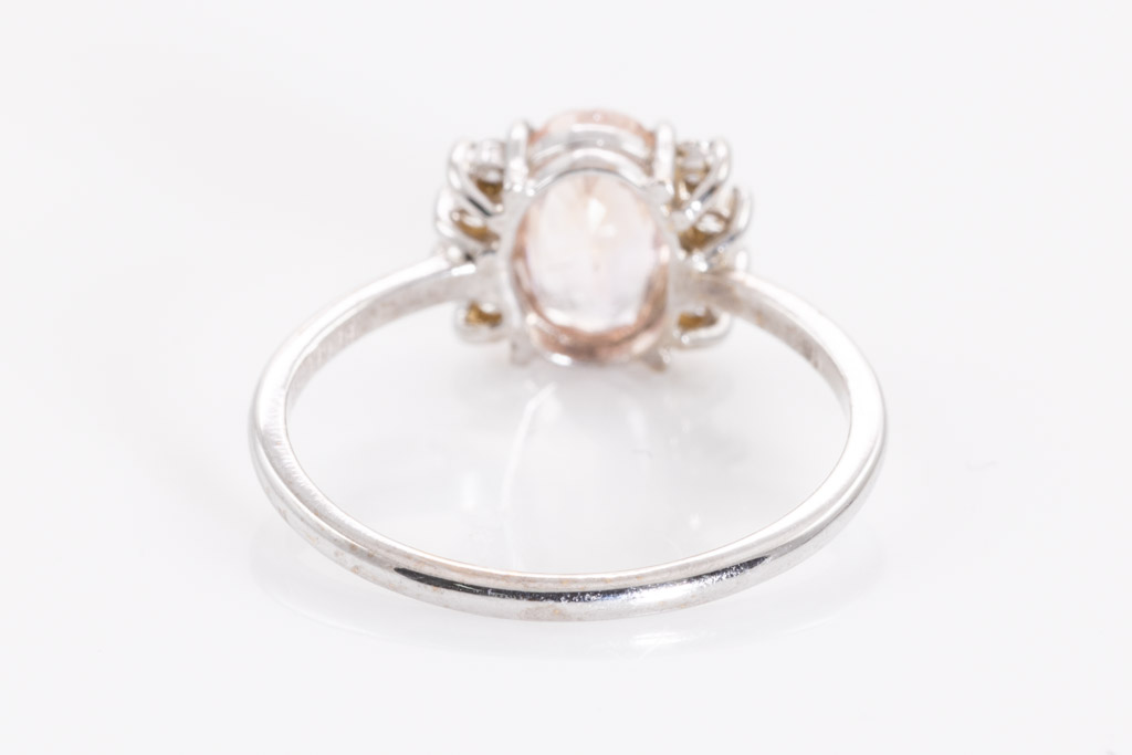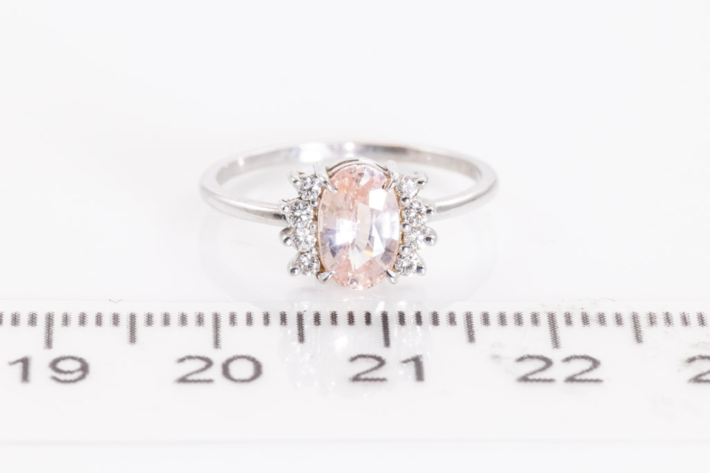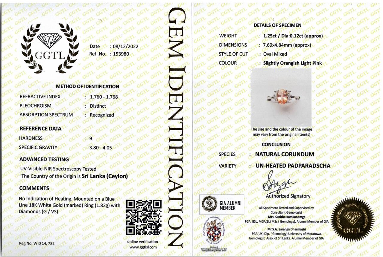 Sapphire and Diamond ring with oval cut un-heated Ceylon Padparadscha Sapphire of 1.25ct and round Diamonds totalling approximately 0.12cts. 18ct white gold. Ring size J 1/2. weight 1.8g. With Gem report #153980. (As New)