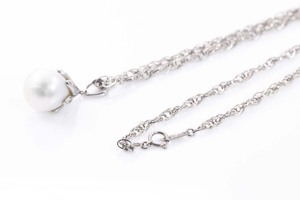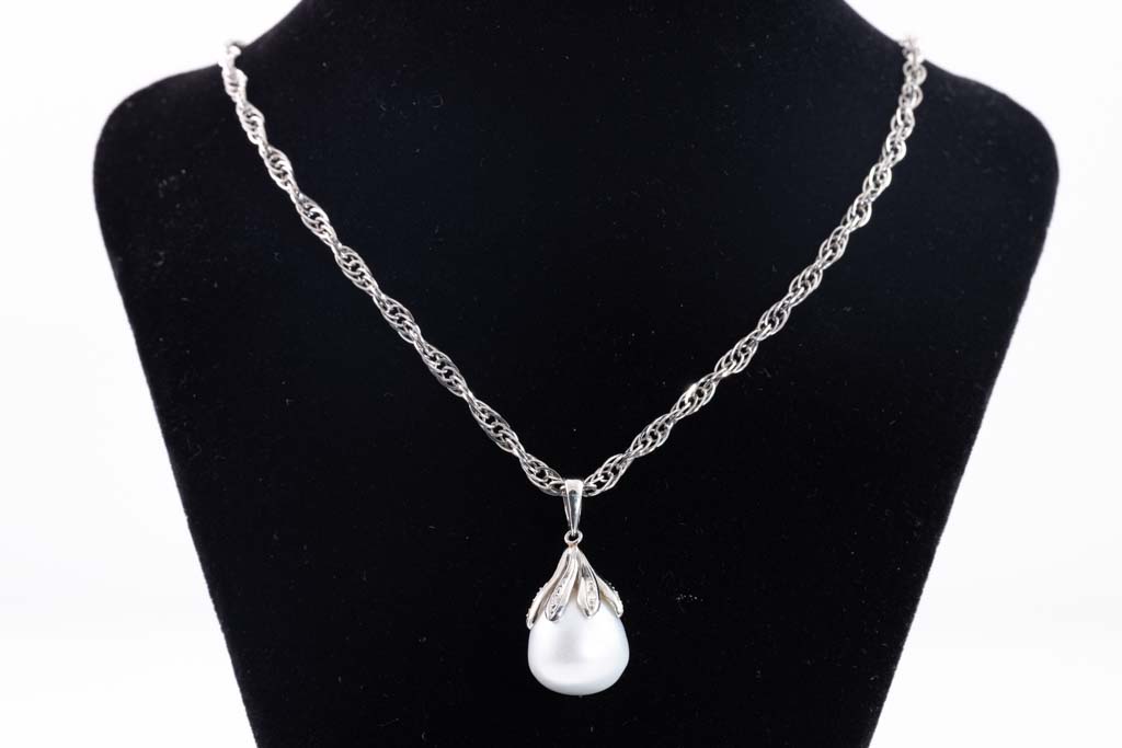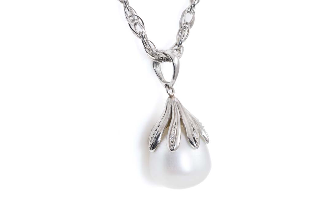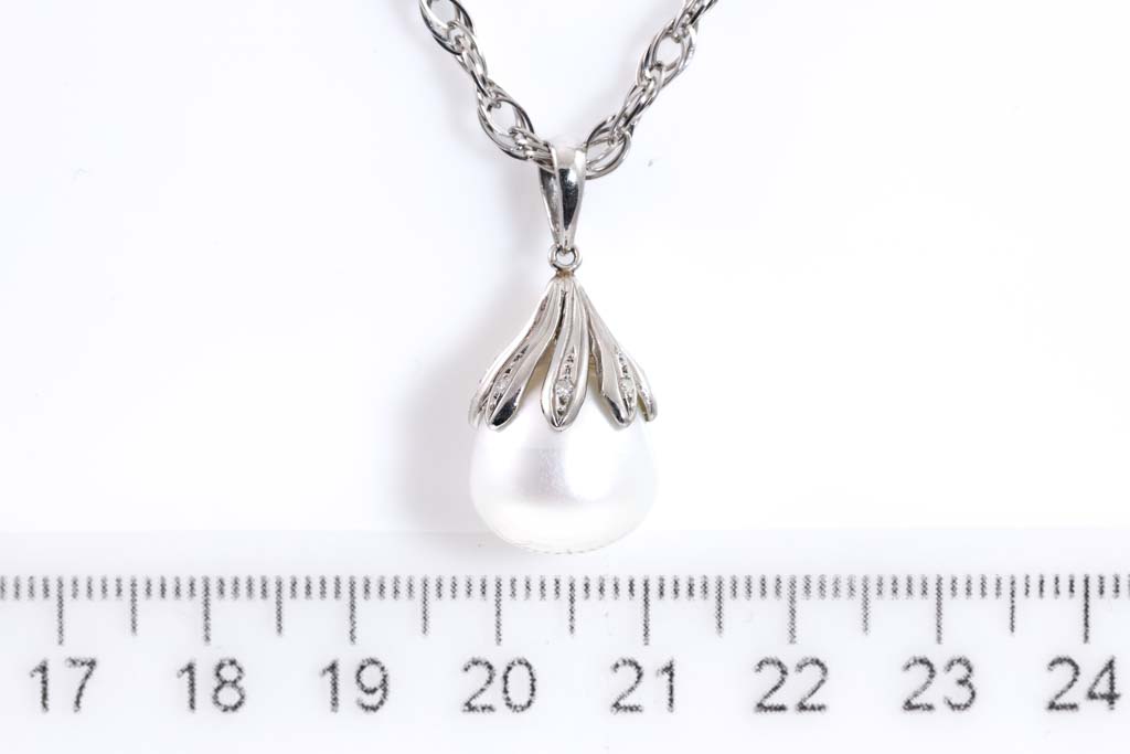 Pearl and Diamond pendant with dropped shape South Sea Pearl of 12.5mm and Diamonds totalling 0.04cts. Platinum - 900 with platinum - 850, 44cm chain. Weight: 13.9. (Pre-owned)