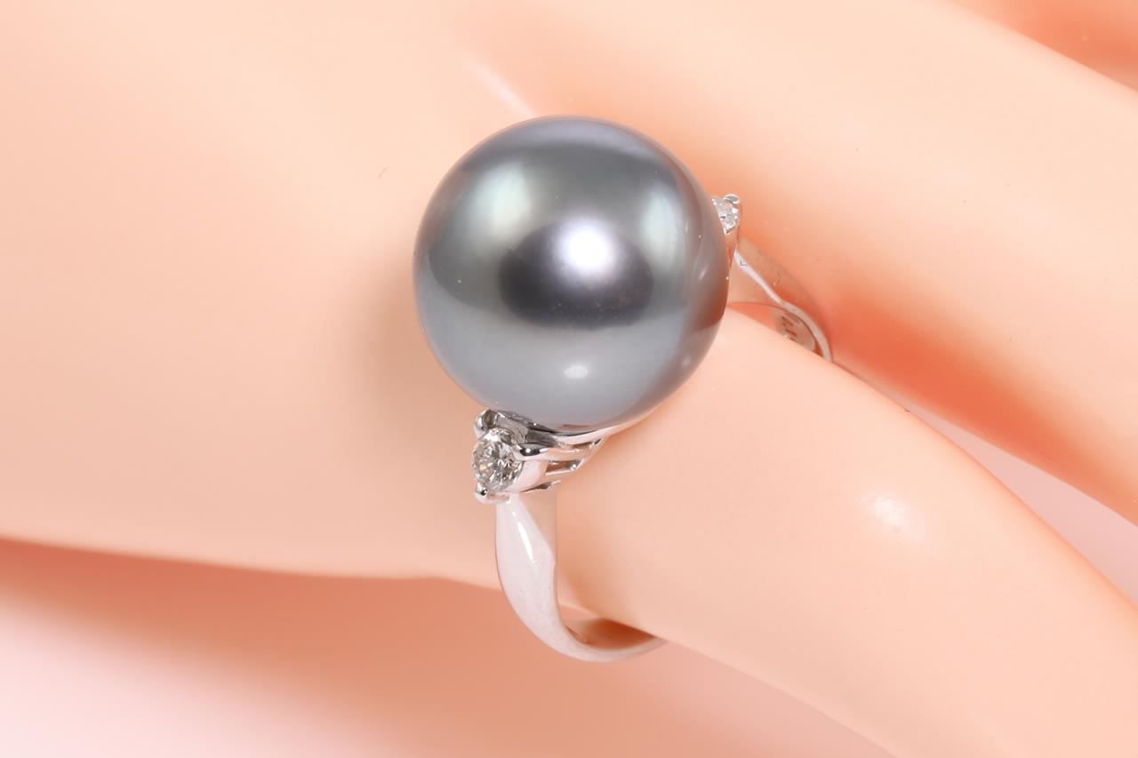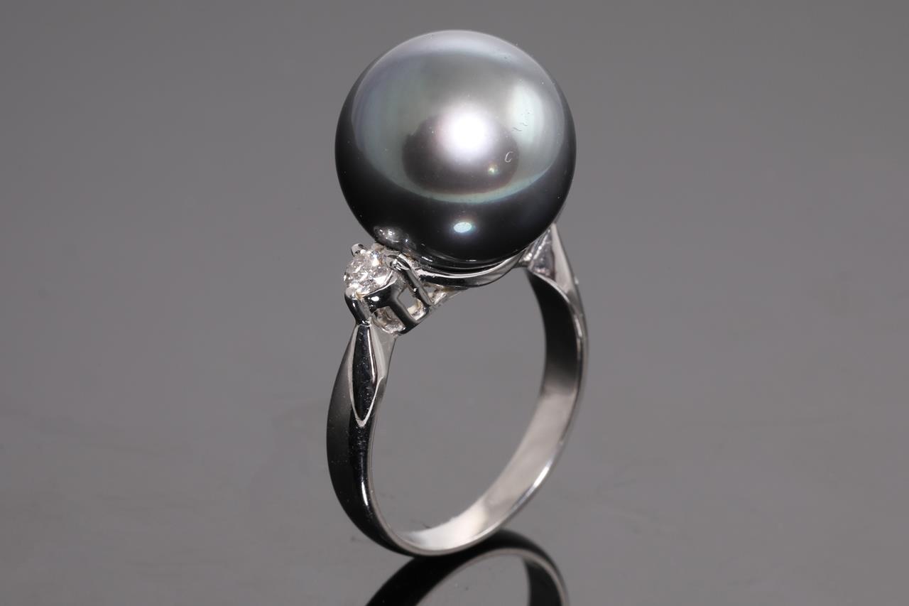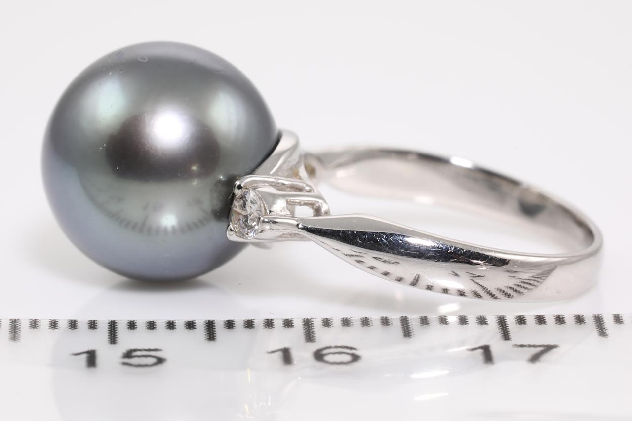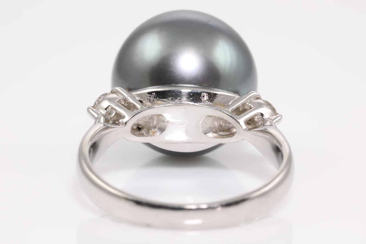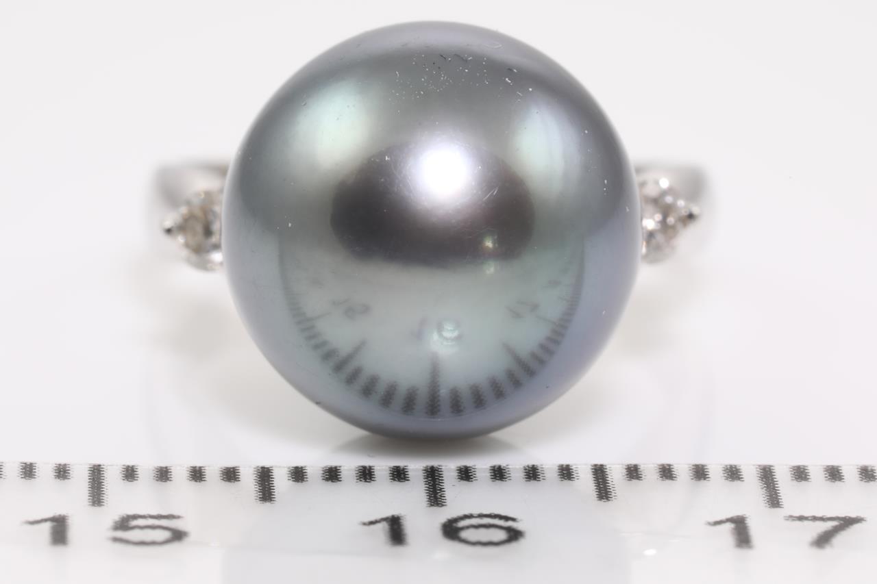 Pearl and Diamond ring with a Tahitian Pearl of 12.5mm and Diamonds totalling 0.14cts. Platinum. Ring size J - ring resizing is not recommended. weight: 6.6g (Pre-owned)