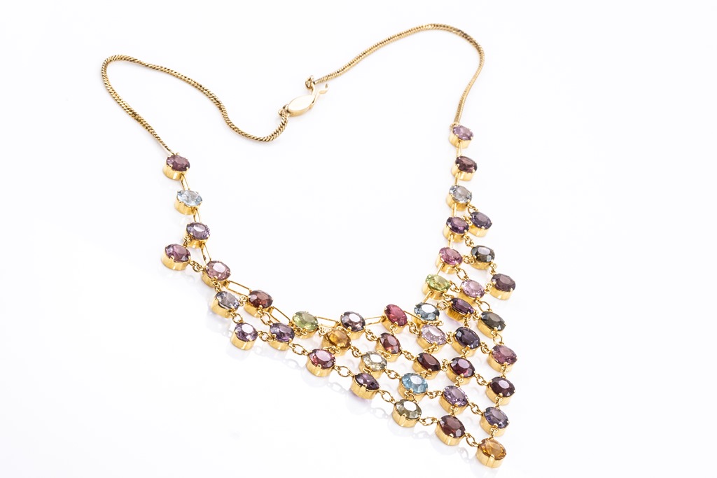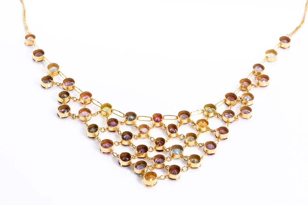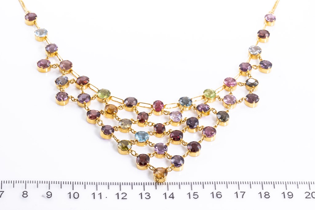 Necklace with mixed oval and round semi-precious gemstones including Garnets, Aquamarine, Quartz, Topaz, totalling approximately 12.60cts. 14ct yellow gold. Length 40cm. Weight 22.4g. (Pre-owned)