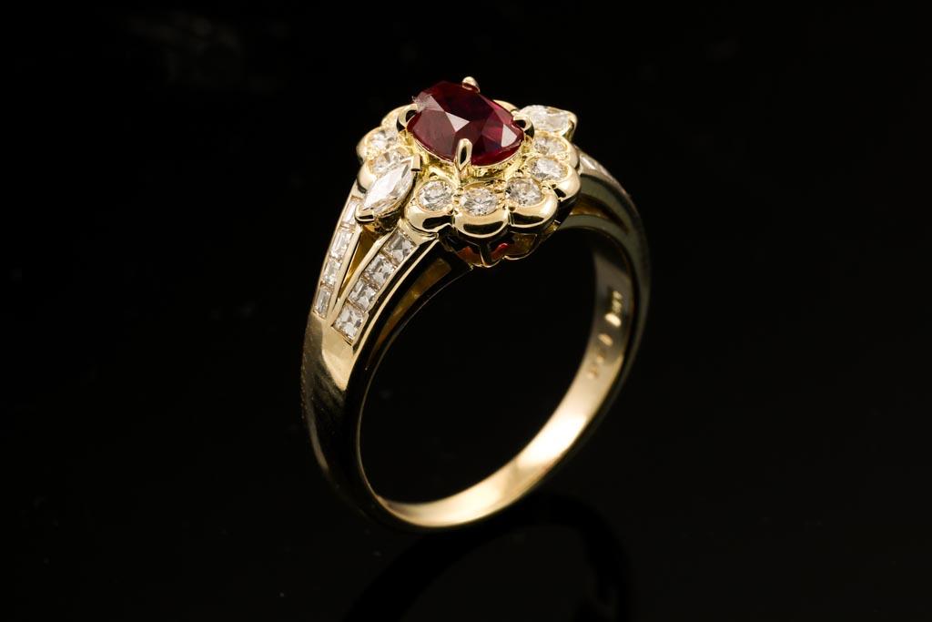Ruby and Diamond ring with oval Ruby of 1.26ct and round/marquise/carre cut Diamonds totalling 0.75cts (Estimated grading: H VS-SI). 18ct yellow gold. Ring size O Weight: 6.6g (Pre-owned)