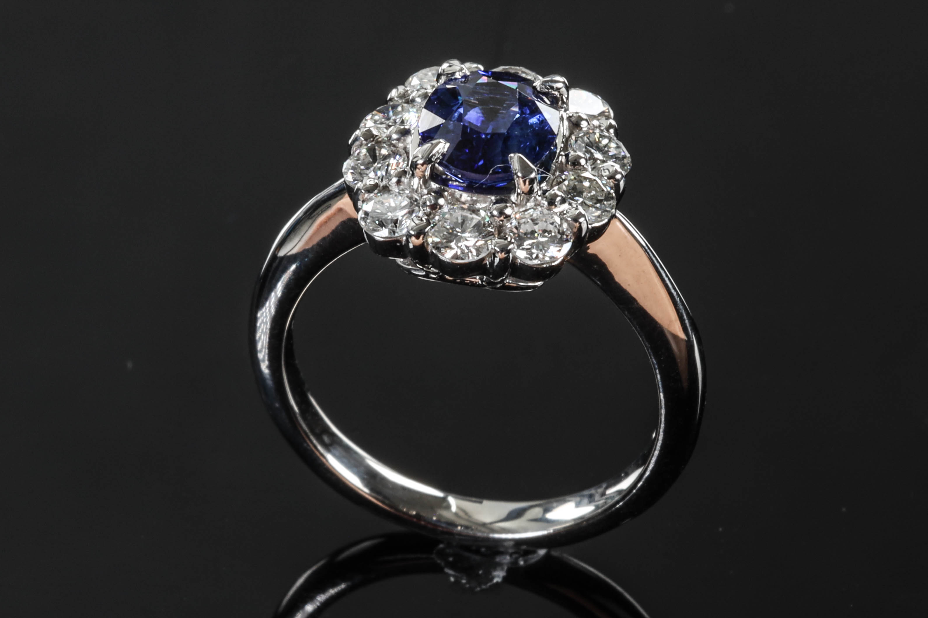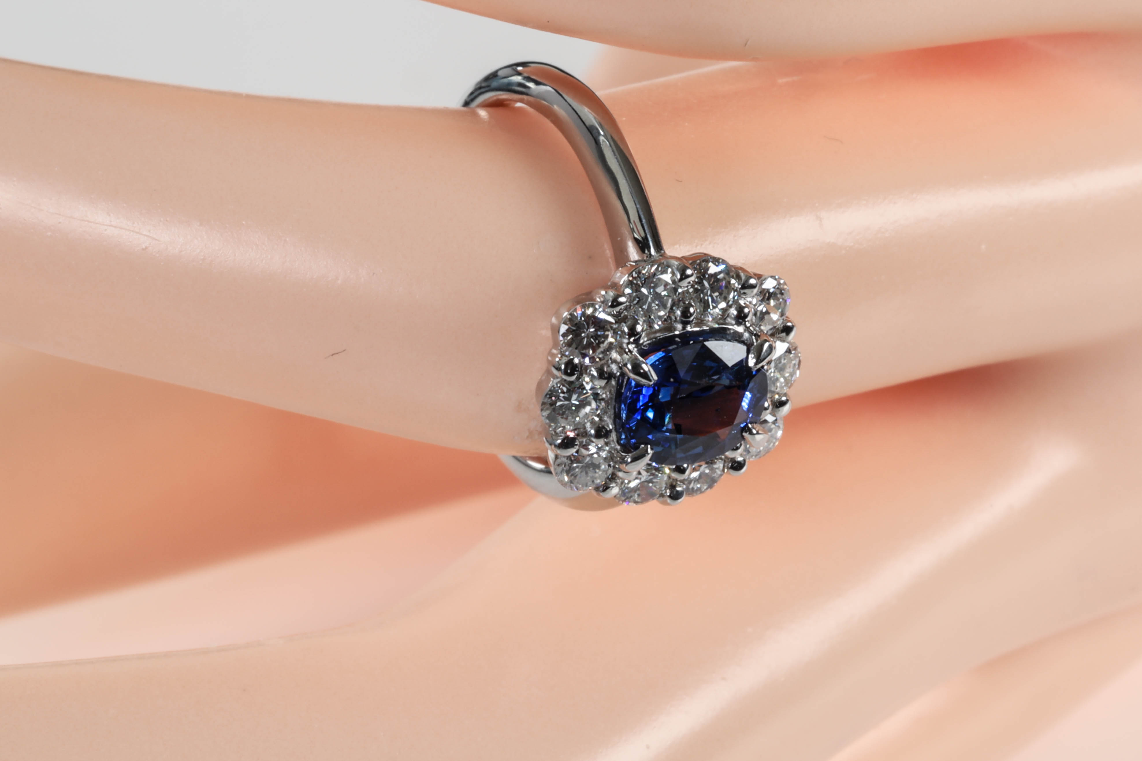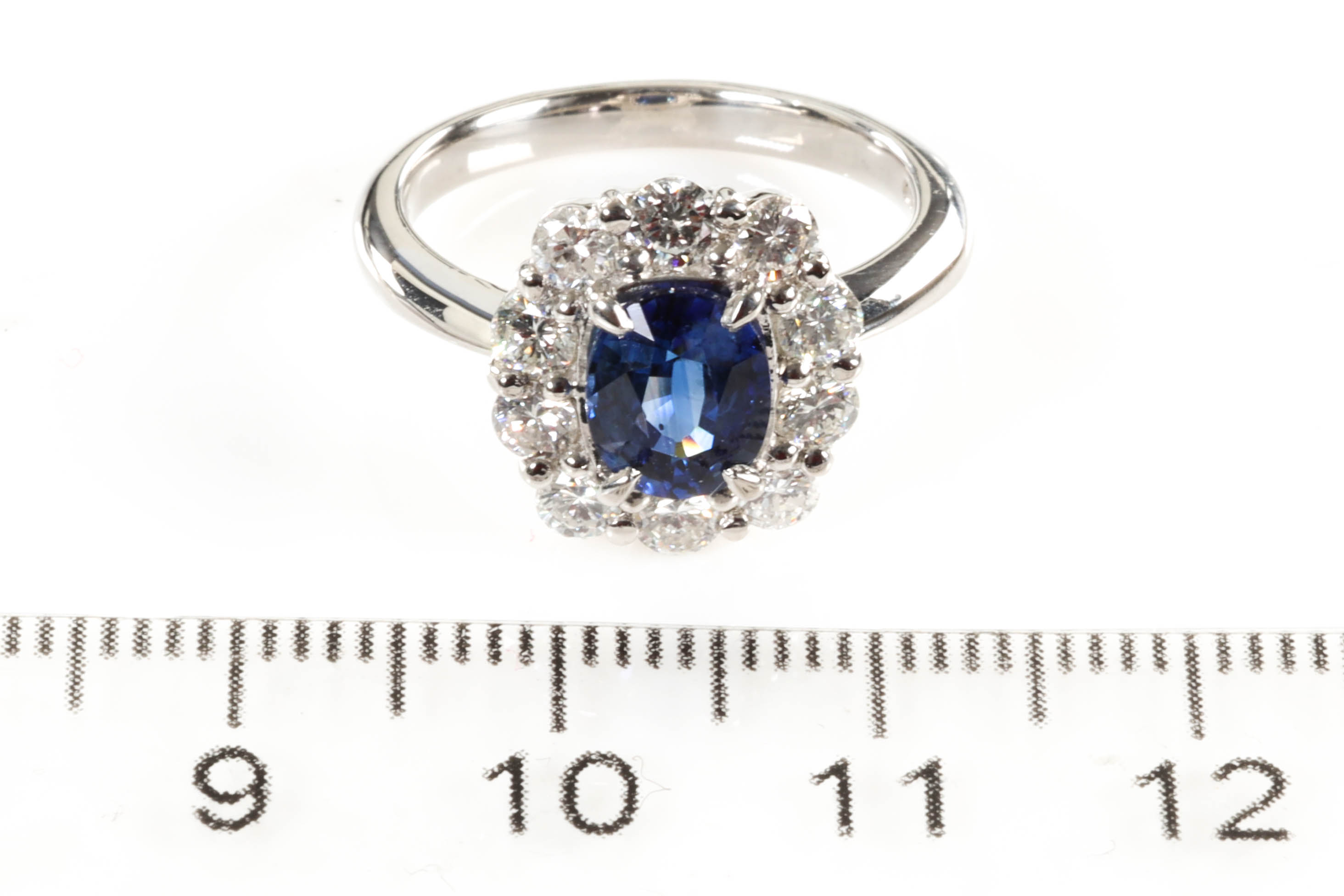 Sapphire and Diamond ring with an oval blue Sapphire of 1.26ct and round Diamonds totalling 0.86cts (Estimated grading: G SI). Platinum. Ring size K1/2. Weight: 6.8g (Pre-owned)