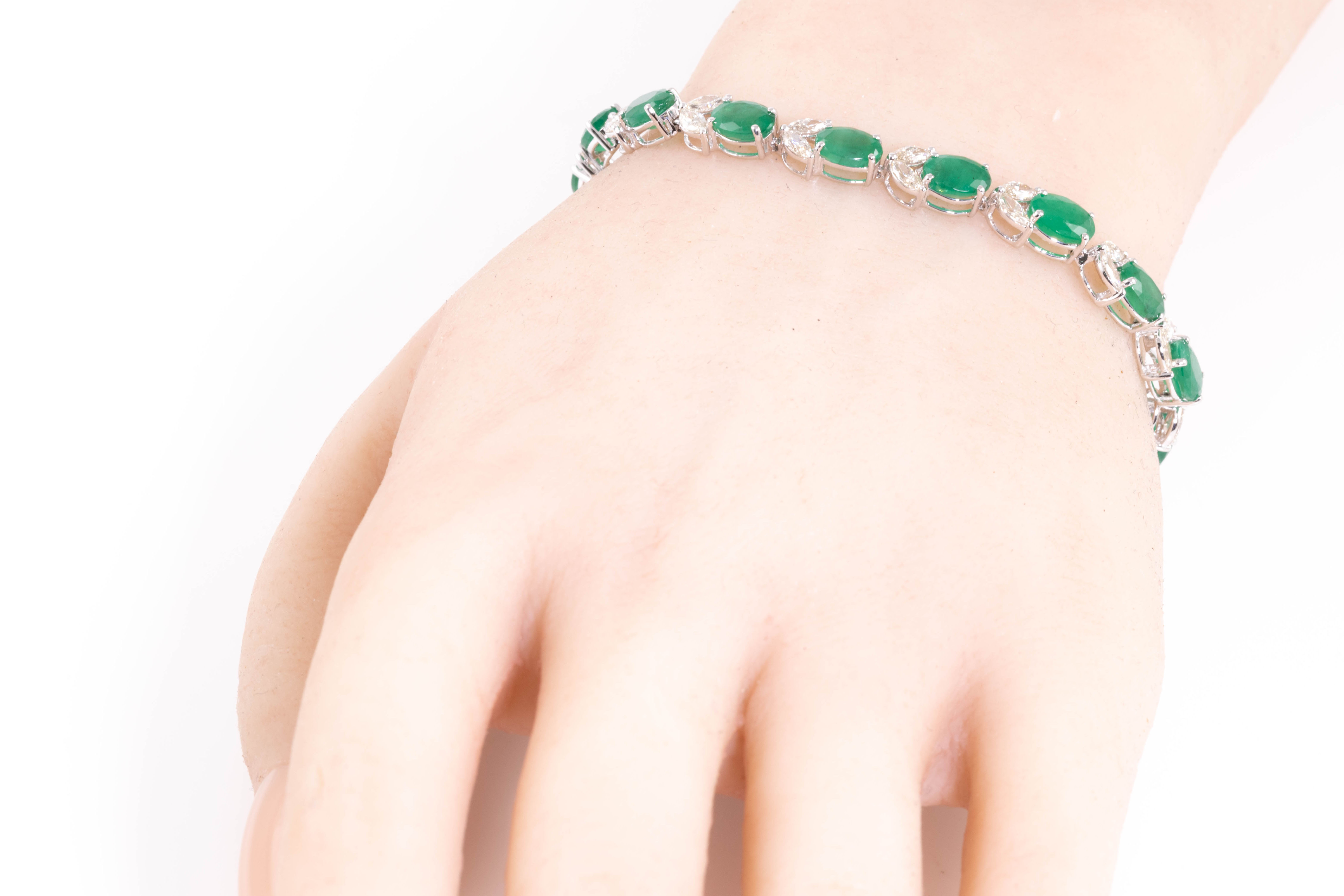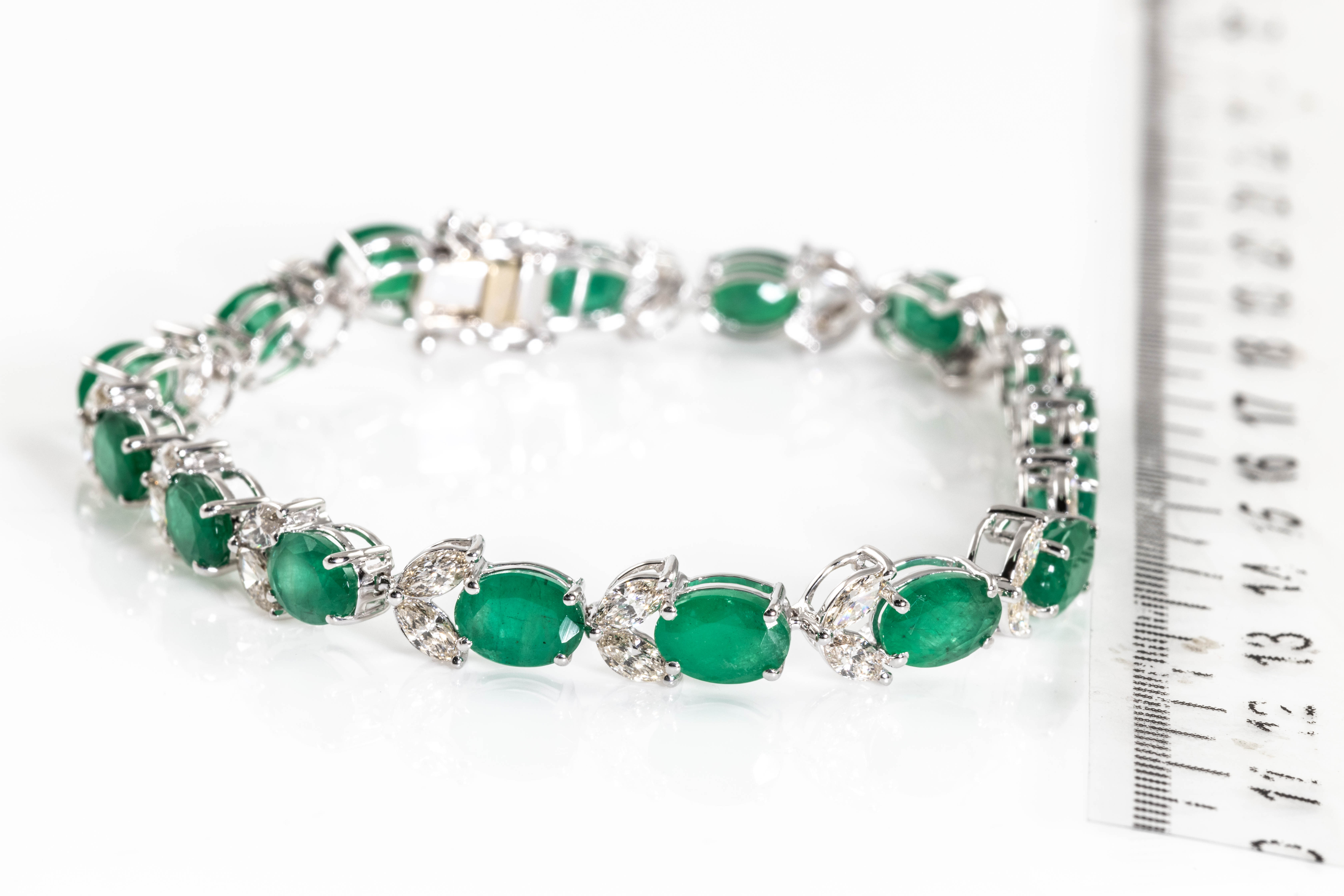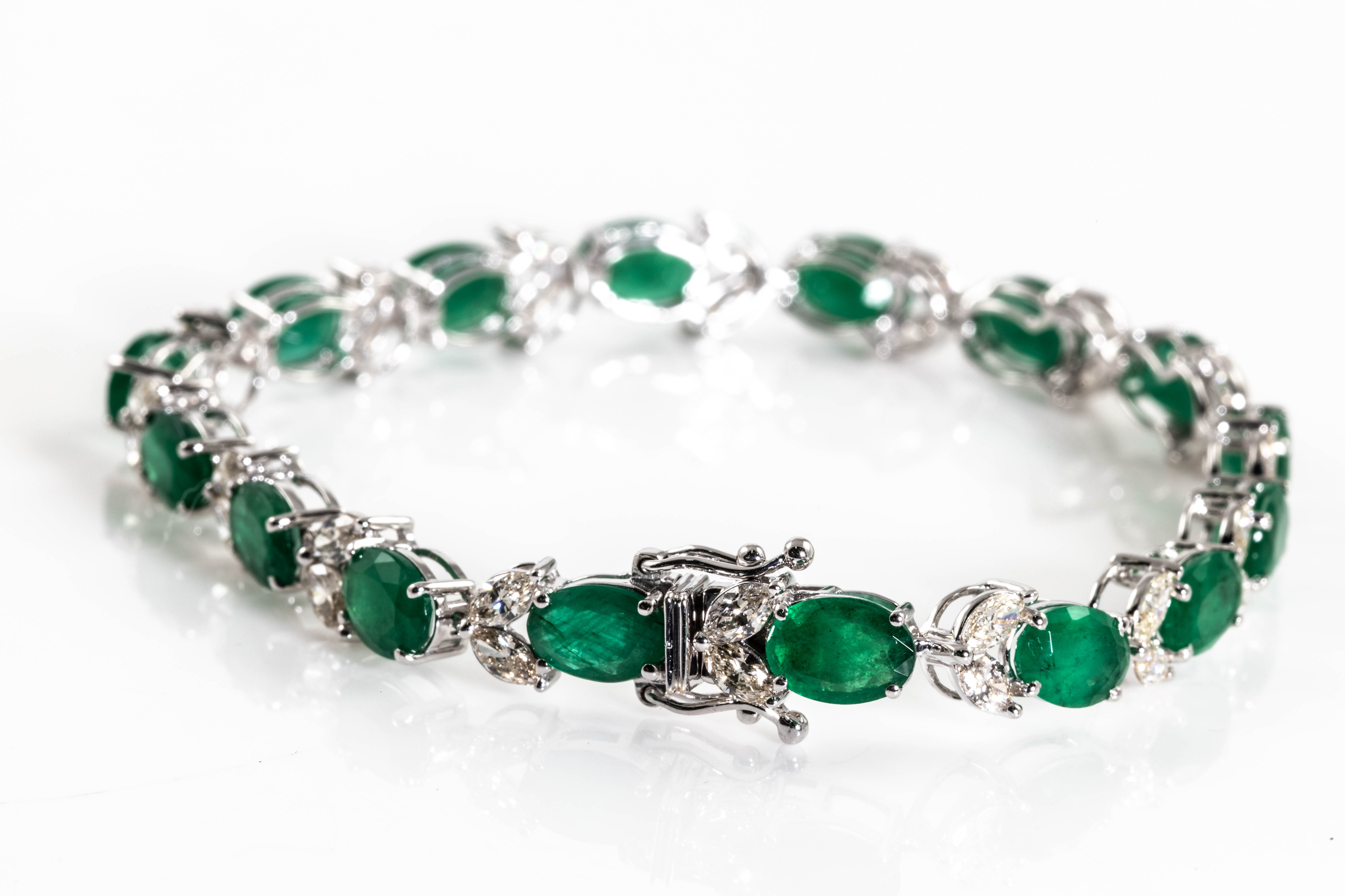 Emerald and Diamond bracelet with oval shape Emeralds totalling 12.70cts and marquise cut Diamonds totalling 2.75cts (Estimated grading: I-J SI). 18ct white gold. Length: 17cm. Weight: 12.3g. With Certificate #416316. (Pre-owned)