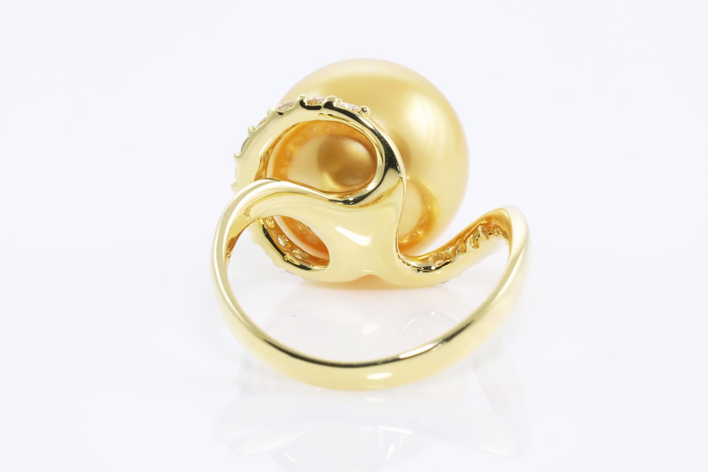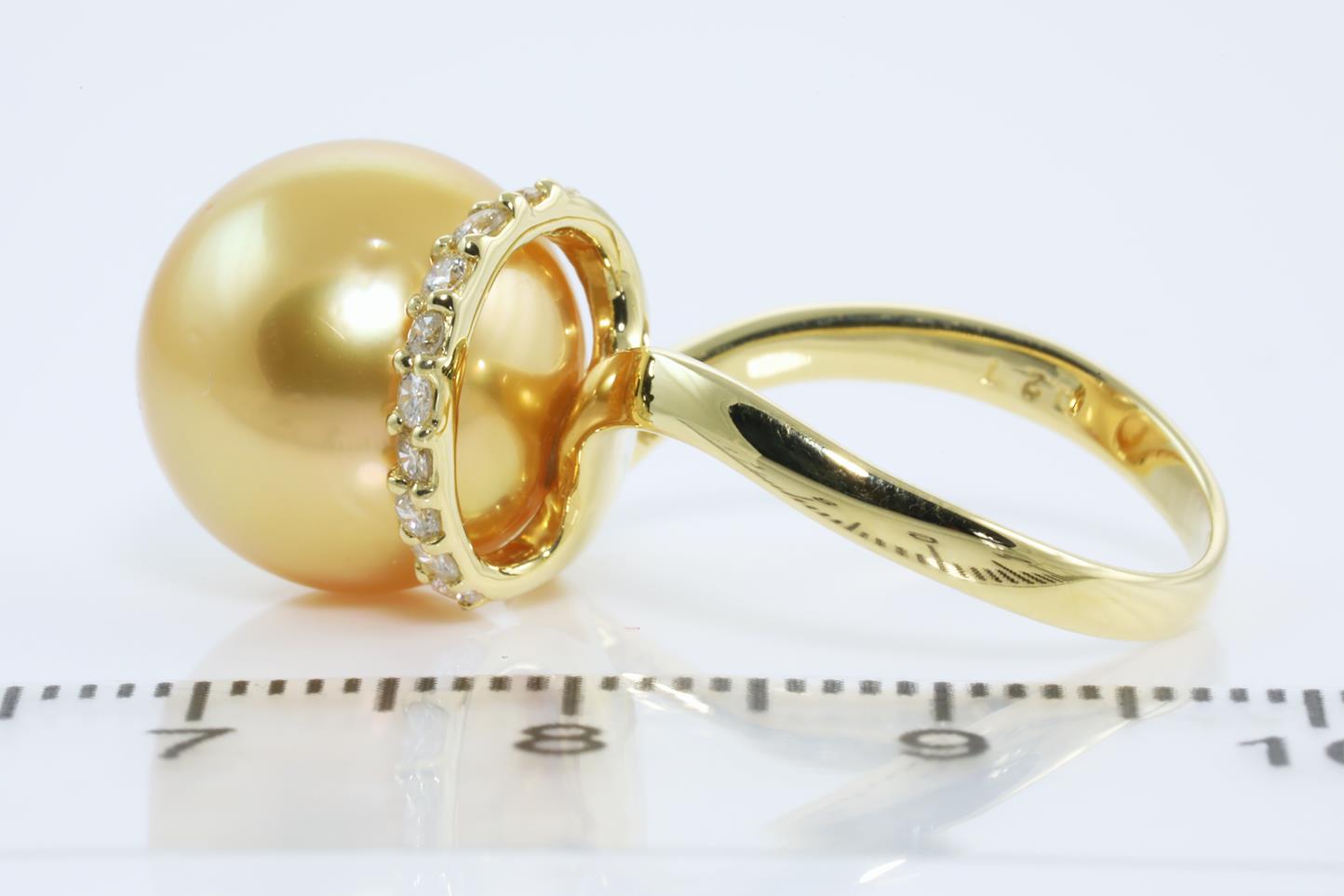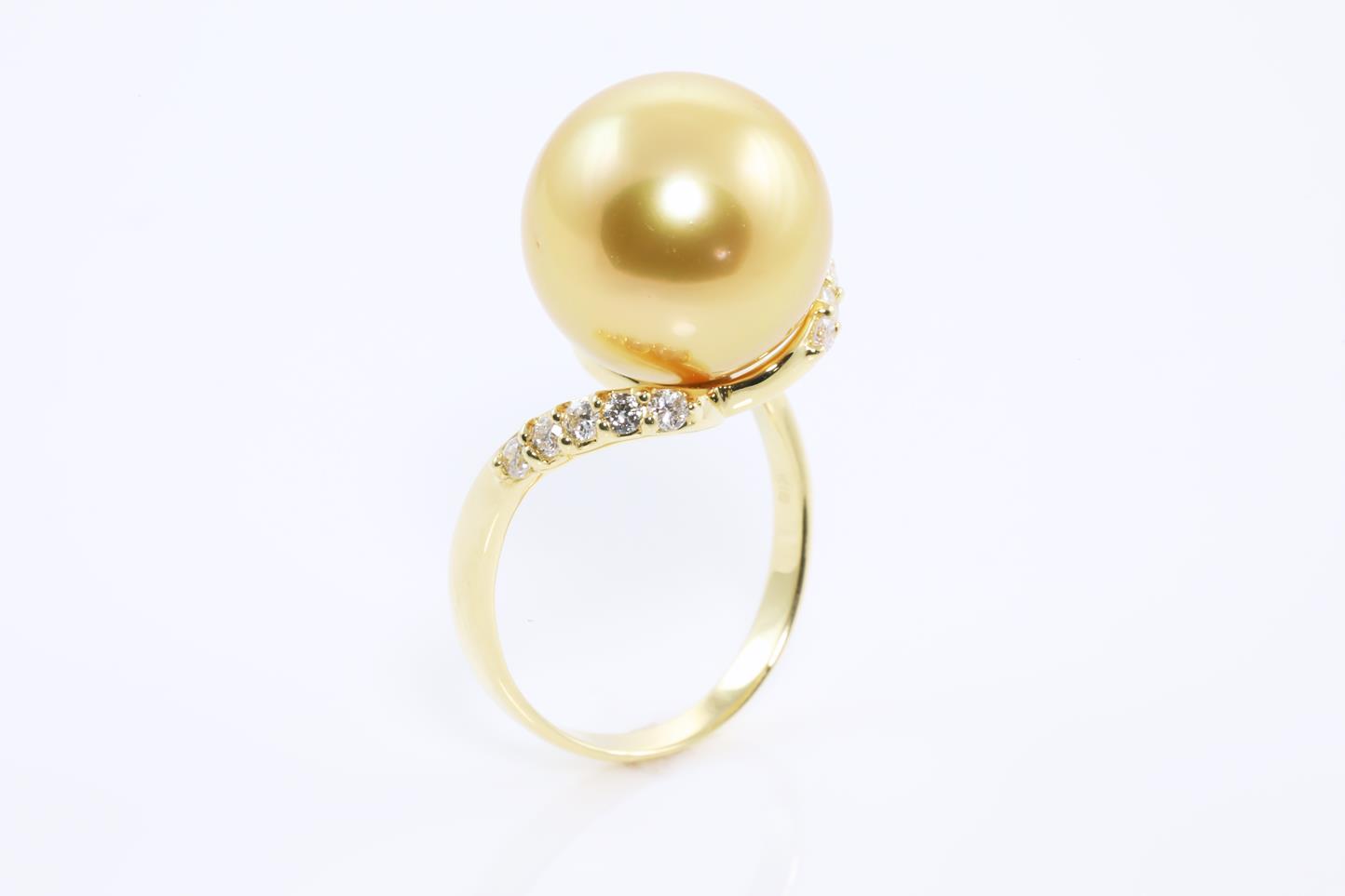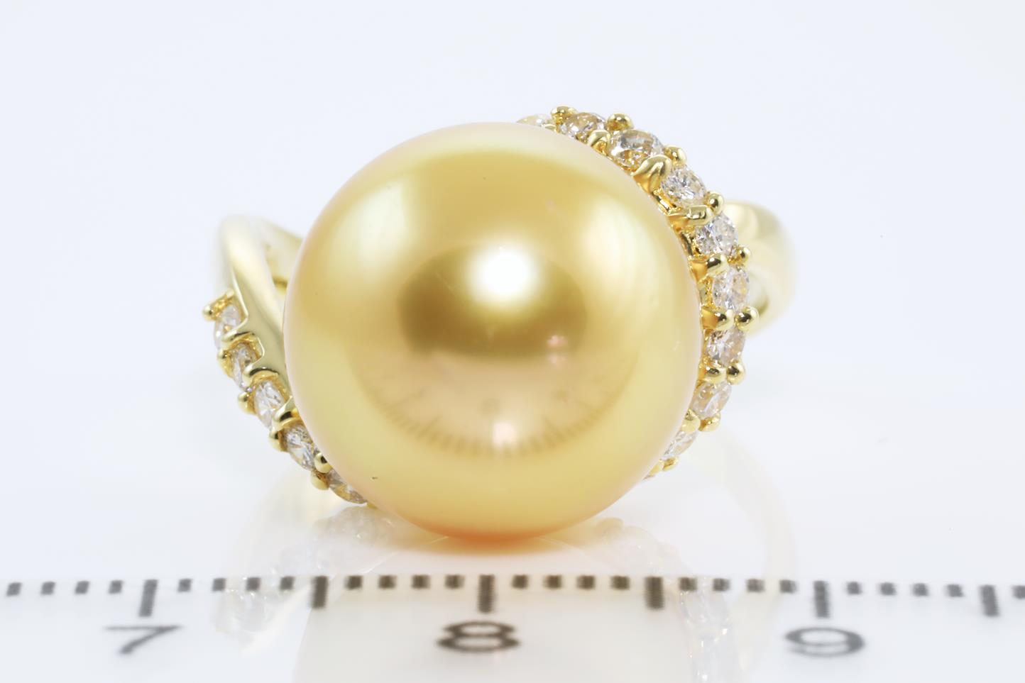 South Sea Pearl and Diamond ring with Golden South Sea Pearl of 12.7mm and Diamonds totalling 0.27cts. 18ct yellow gold. Ring size: K - It is not recommened to resize this ring. Weight: 6.4g (Pre-owned)