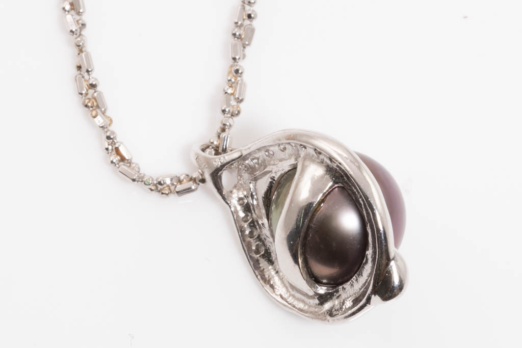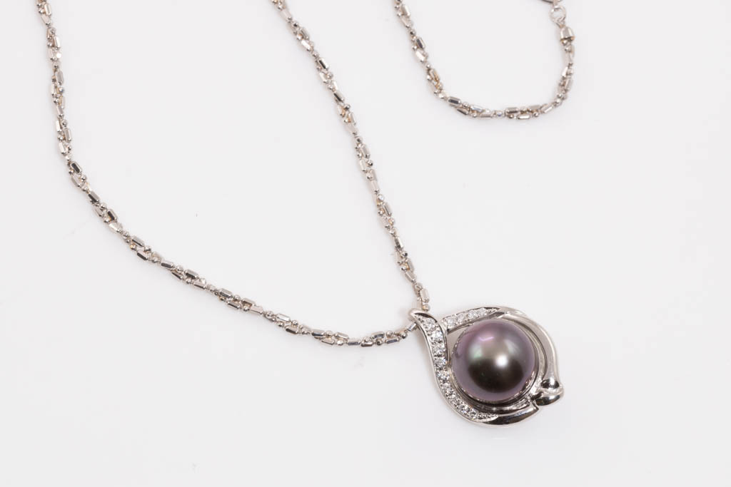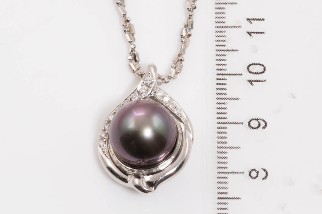 Pearl and Diamond pendant with Tahitian Pearl of 12.7mm and round Diamonds totalling 0.21cts. Platinum with platinum 42cm chain. Weight: 16.1g. (Pre-owned)