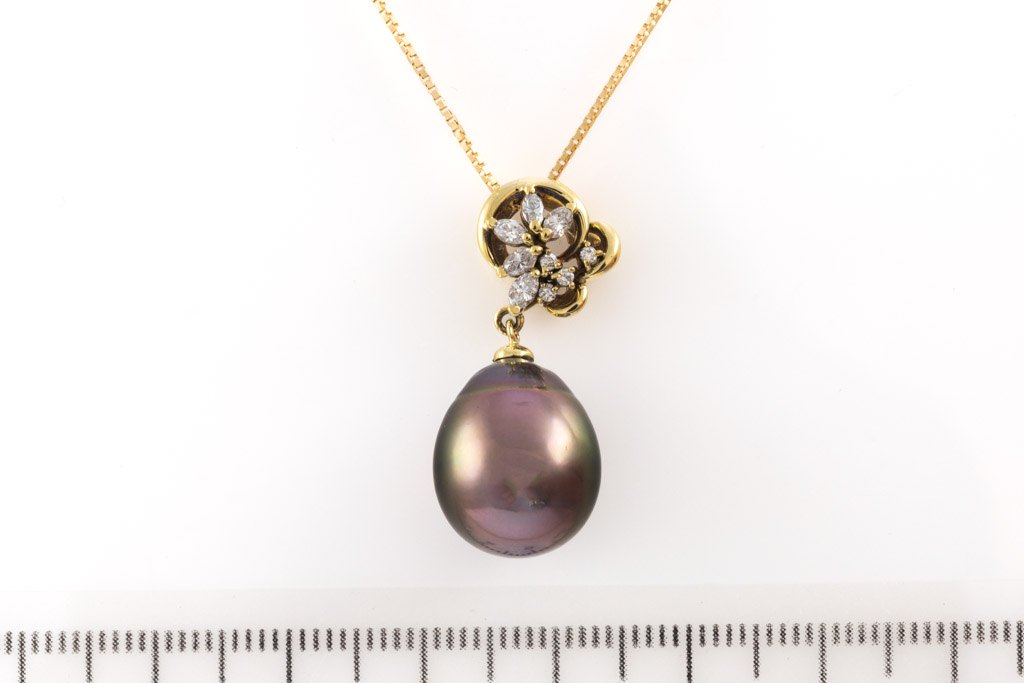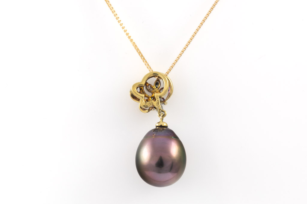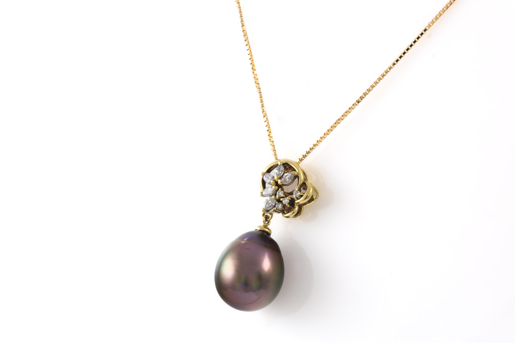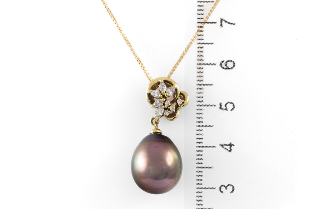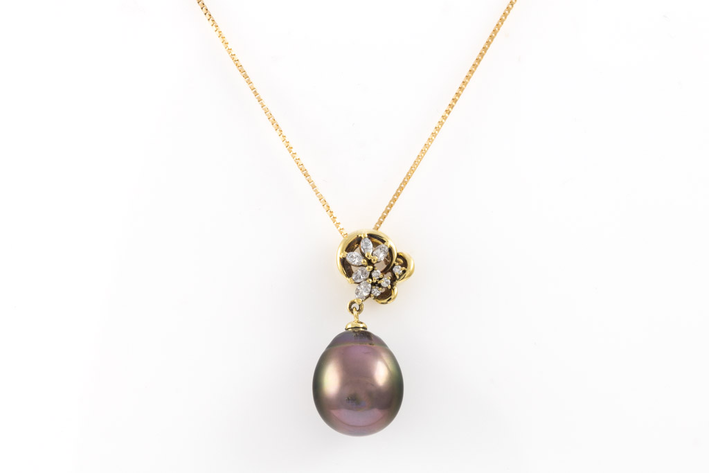 Pearl and Diamond pendant with drop shape Tahitian Pearl of 12.7mm and round & marquise cut Diamonds totalling 0.27cts. 18ct yellow gold with 44cm 18ct yellow gold adjustable chain. Weight: 7.1g. (Pre-owned)