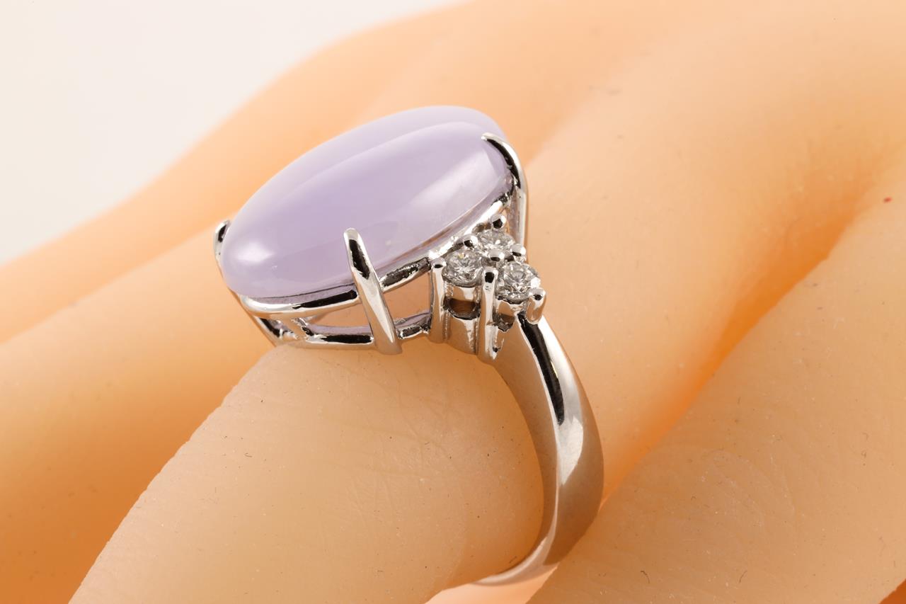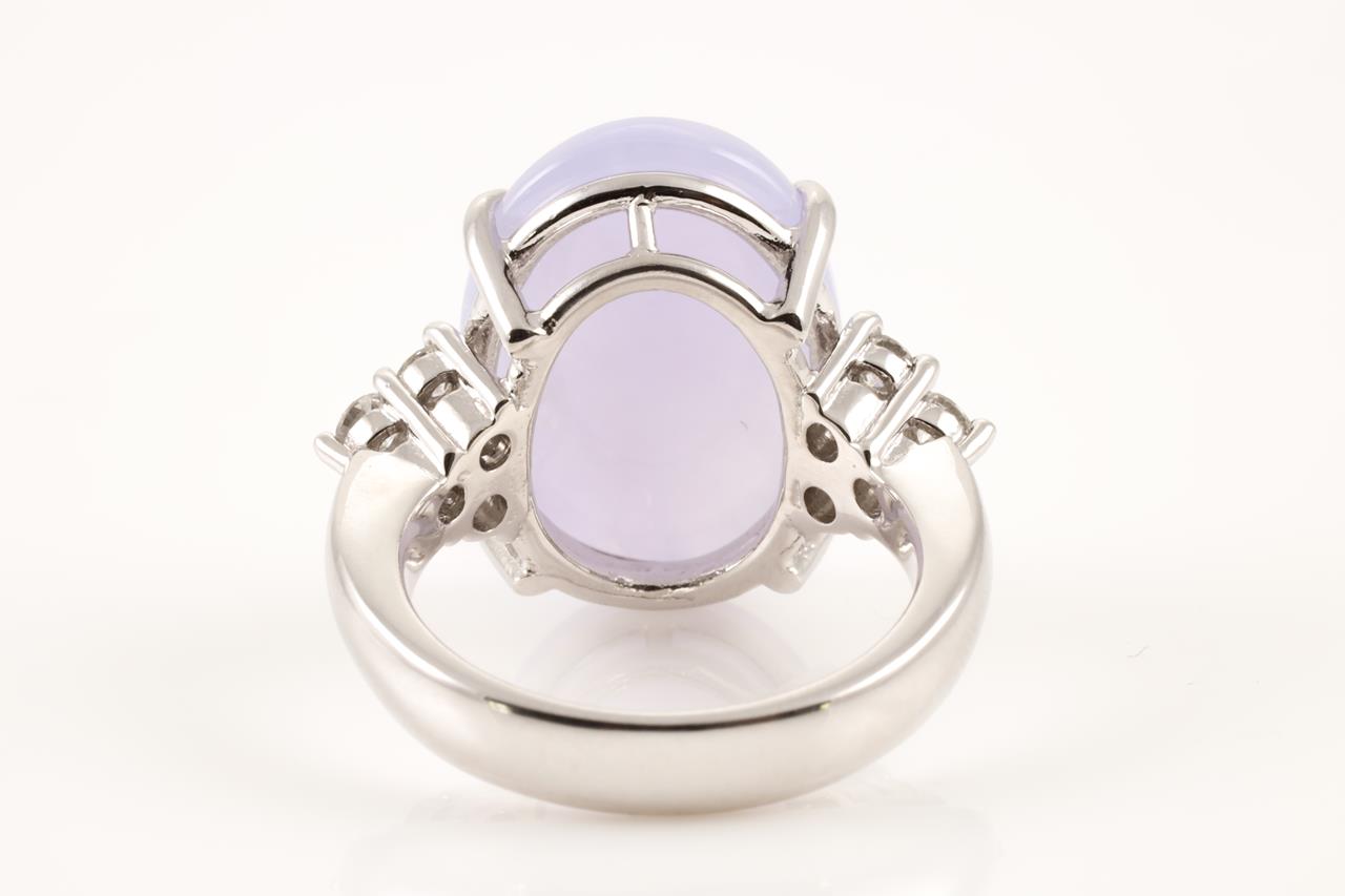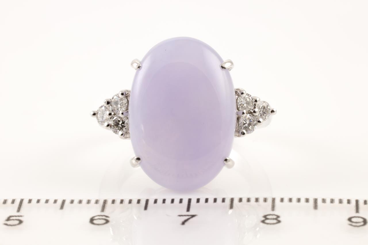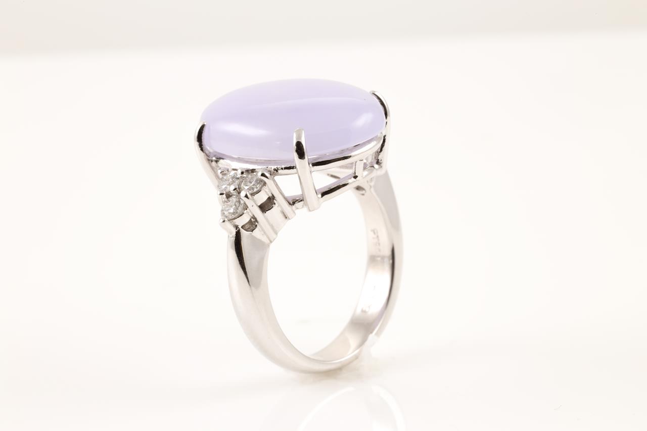 Jade and Diamond ring with oval cabochon cut natural translucent lavender Jadeite Jade of 12.86ct (with GEM identification report #DB7545) and Diamonds totalling 0.38cts (Estimated grading: G-H VS-SI). Platinum. Ring size L1/2 - cannot be resized up, down only with ring clip. Weight: 13g (Pre-owned)