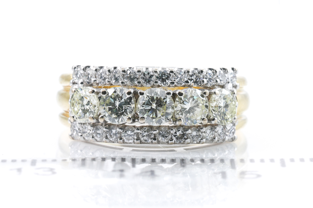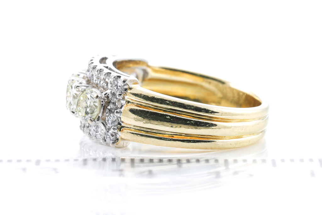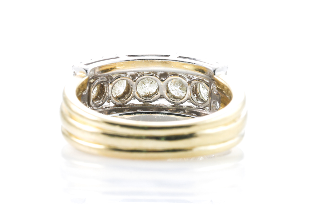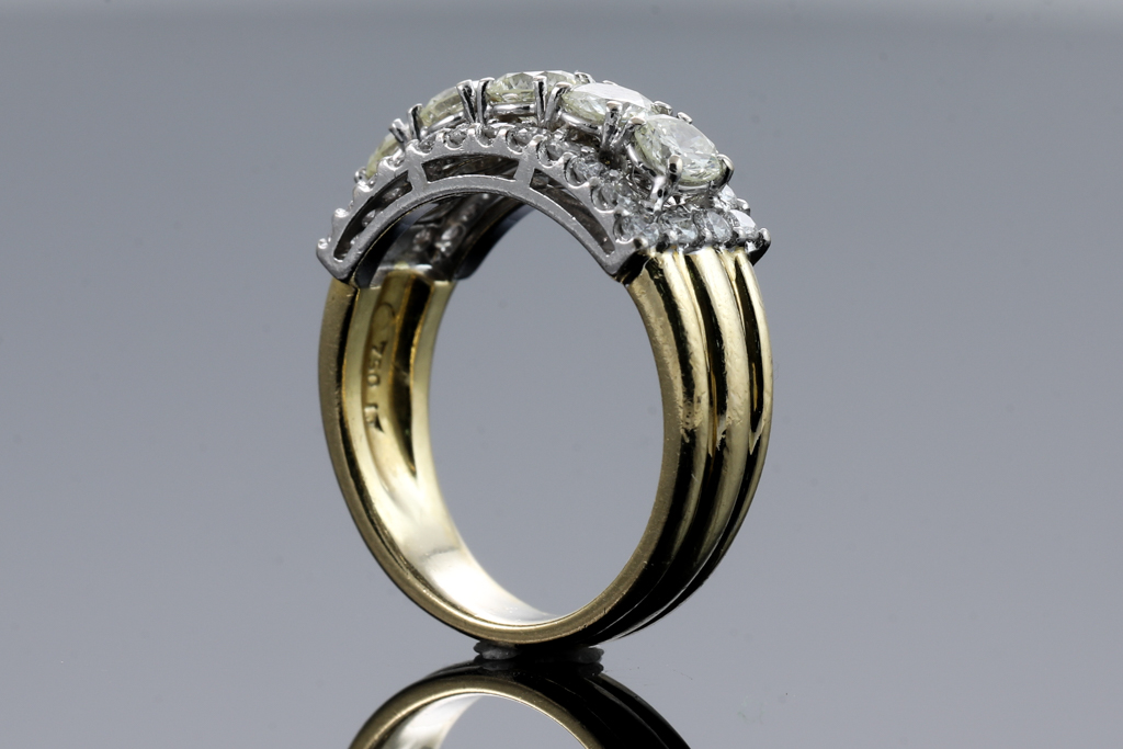 Diamond dress ring with 5 round cut Diamonds totalling approximately 1.00cts (Estimated grading: L-M SI) and rest of round Diamonds totalling approximately 0.28cts (Estimated grading G-H SI). 18ct yellow and white gold. Ring size L - resizing not recommended. Weight 6.7g. (Pre-owned)