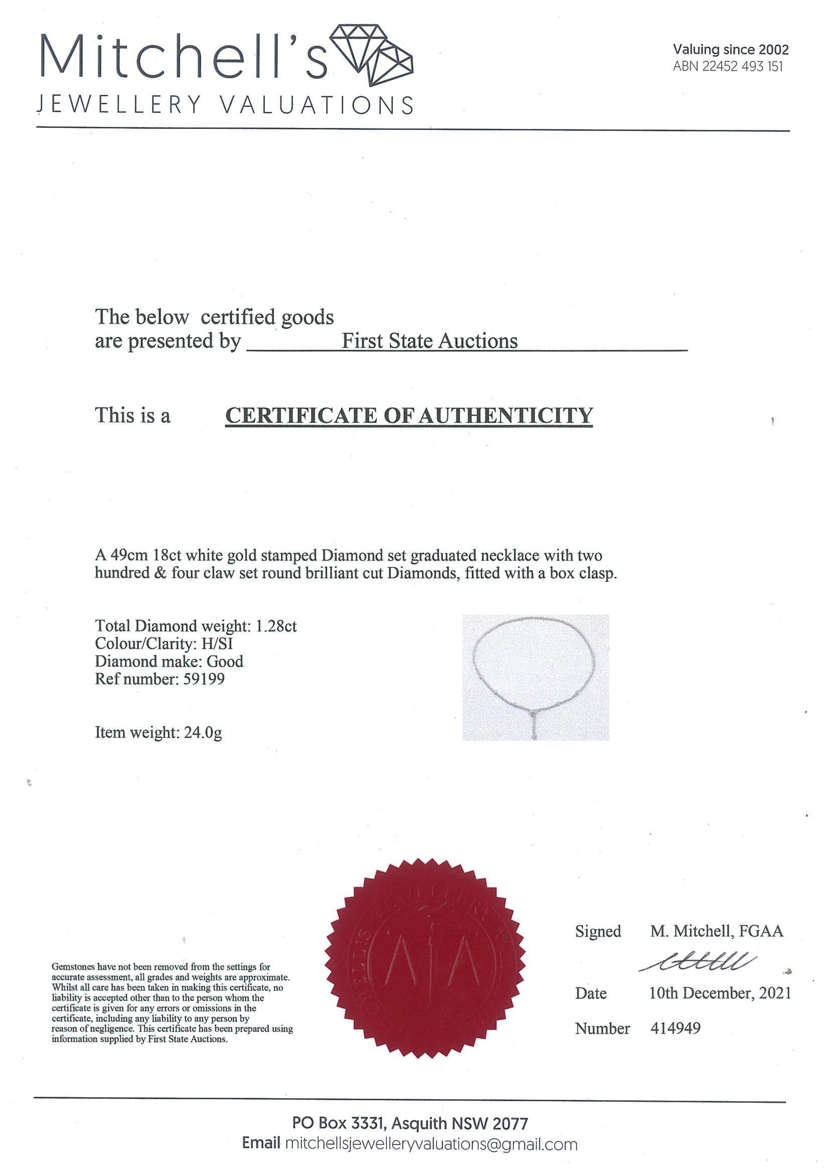 Diamond Necklace with Diamonds totalling 1.28cts (Estimated grading: H SI). 18ct white gold. Length: 49m. Weight: 24.0g. With certificate #414949. (Pre-owned)