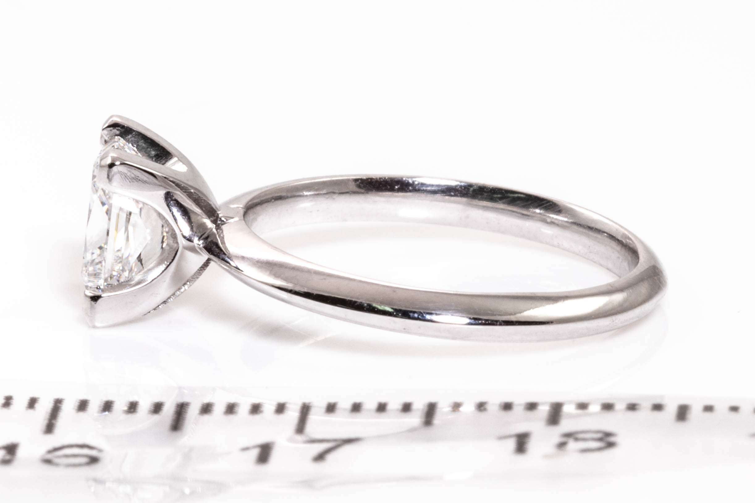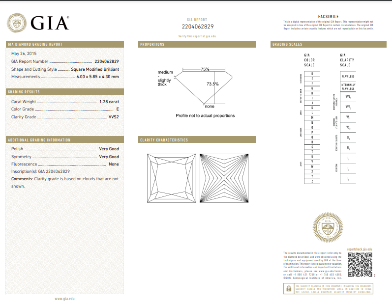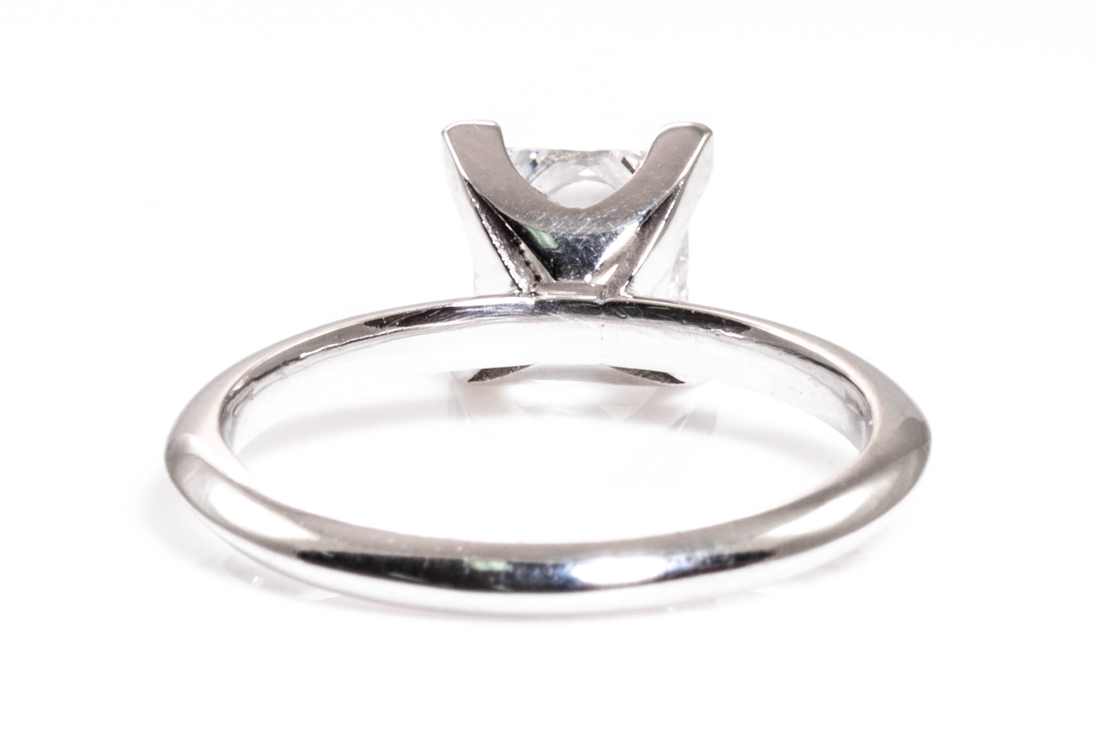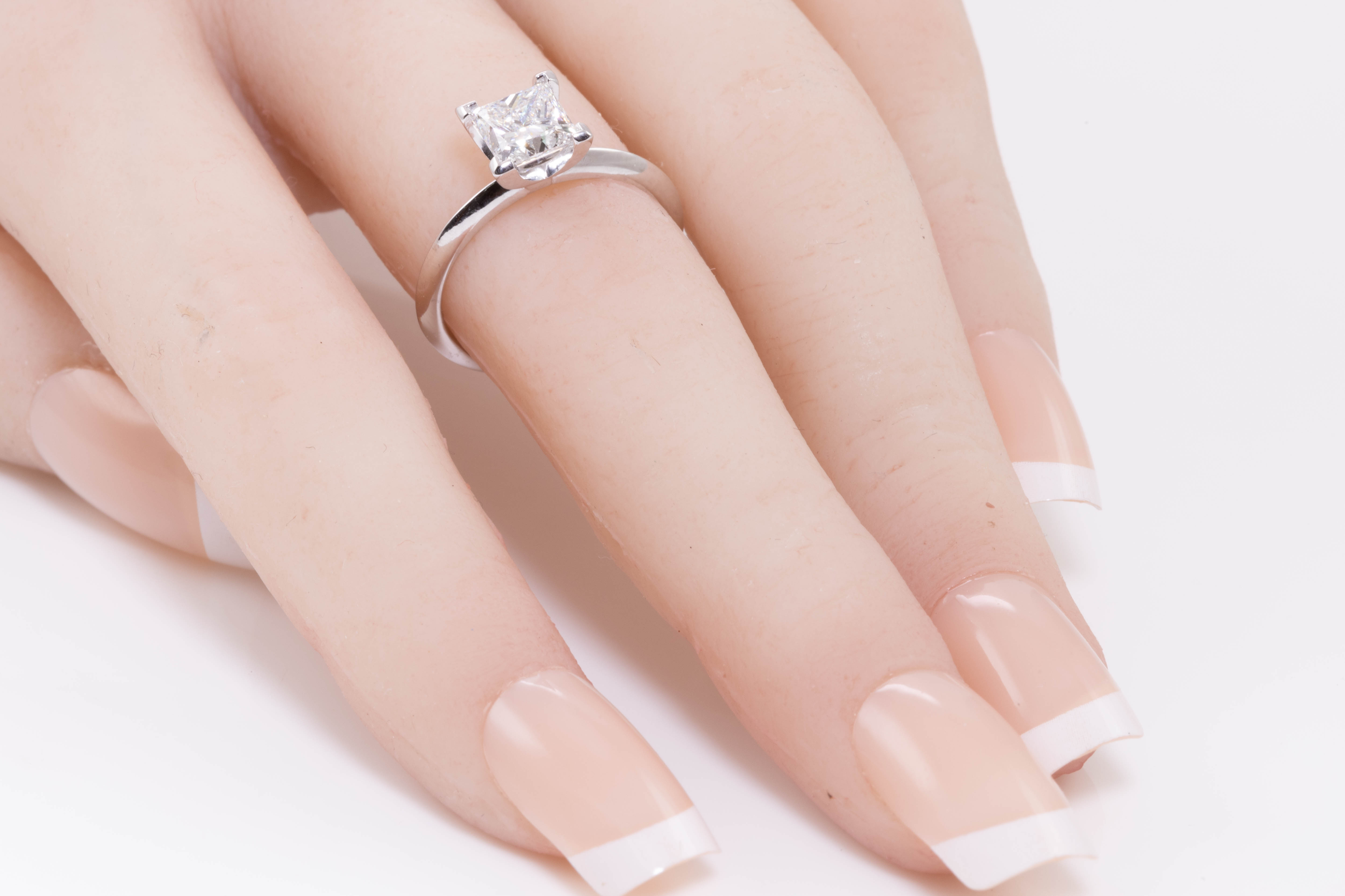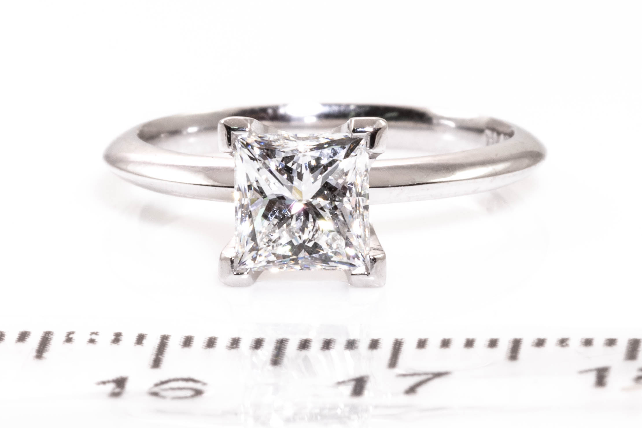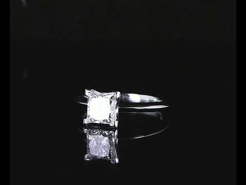 Diamond solitaire ring with princess cut Diamond of 1.28ct (With GIA certificate graded at E VVS2 #2204062829). Platinum. Ring size J 1/2. Weight 4.1g. (Pre-owned)