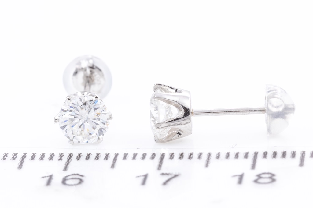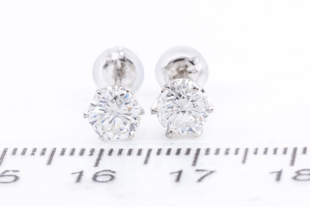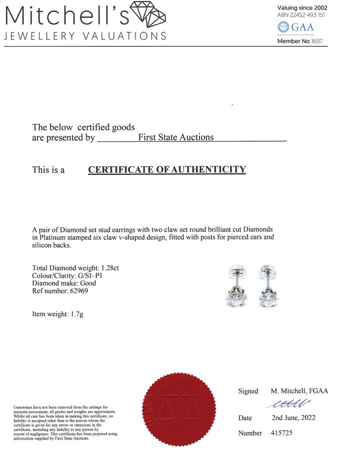 Diamond Stud Earrings with 2 round brilliant cut Diamonds totalling 1.28cts (Estimated grading: G SI-P1). Platinum with platinum & silicon backs. Weight: 1.7g With Certificate #415725. (Pre-owned)
