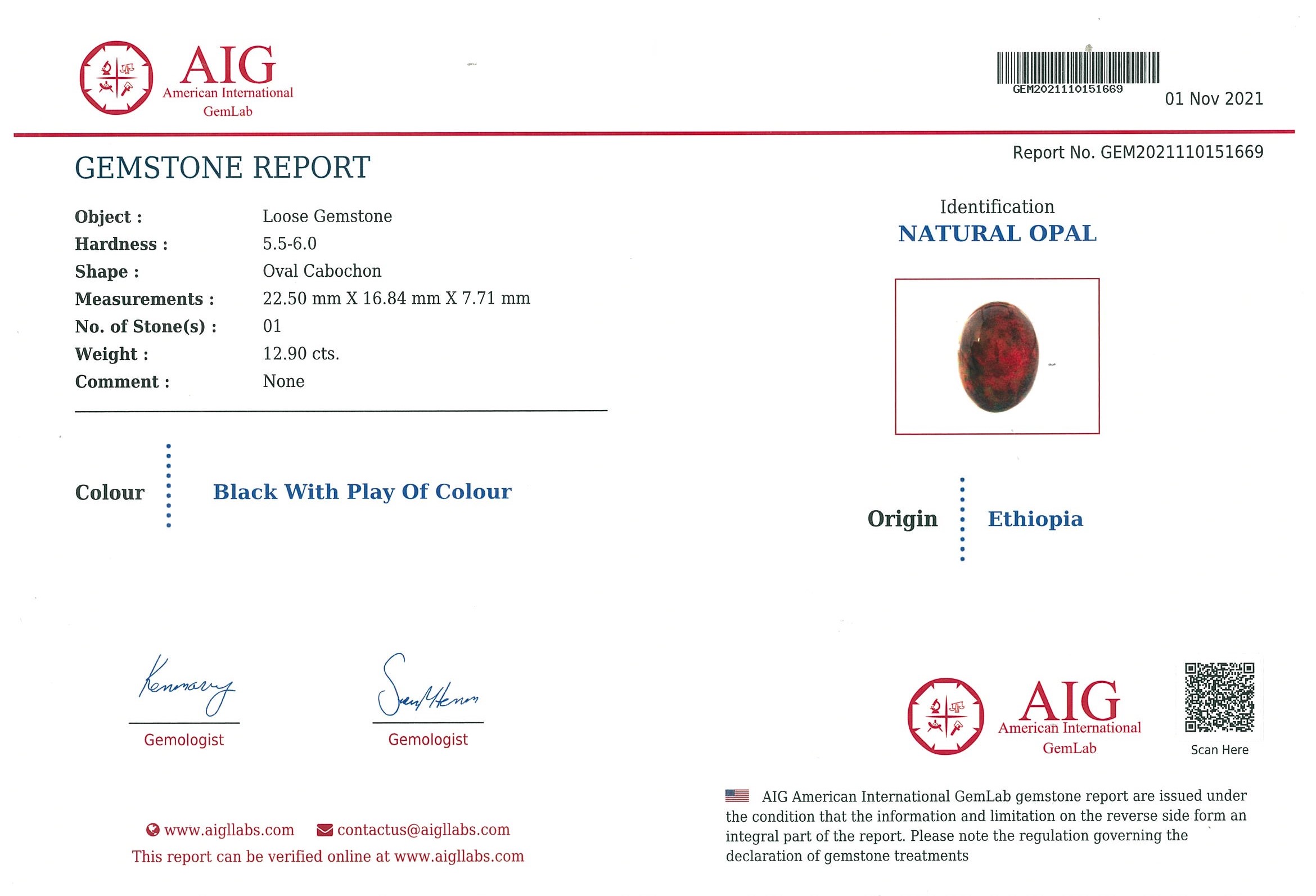 A loose oval cabochon cut Opal of 12.90ct. Dimensions: 22.50 x 16.84 x 7.71mm. With AIG report #GEM2021110151669. (As New)