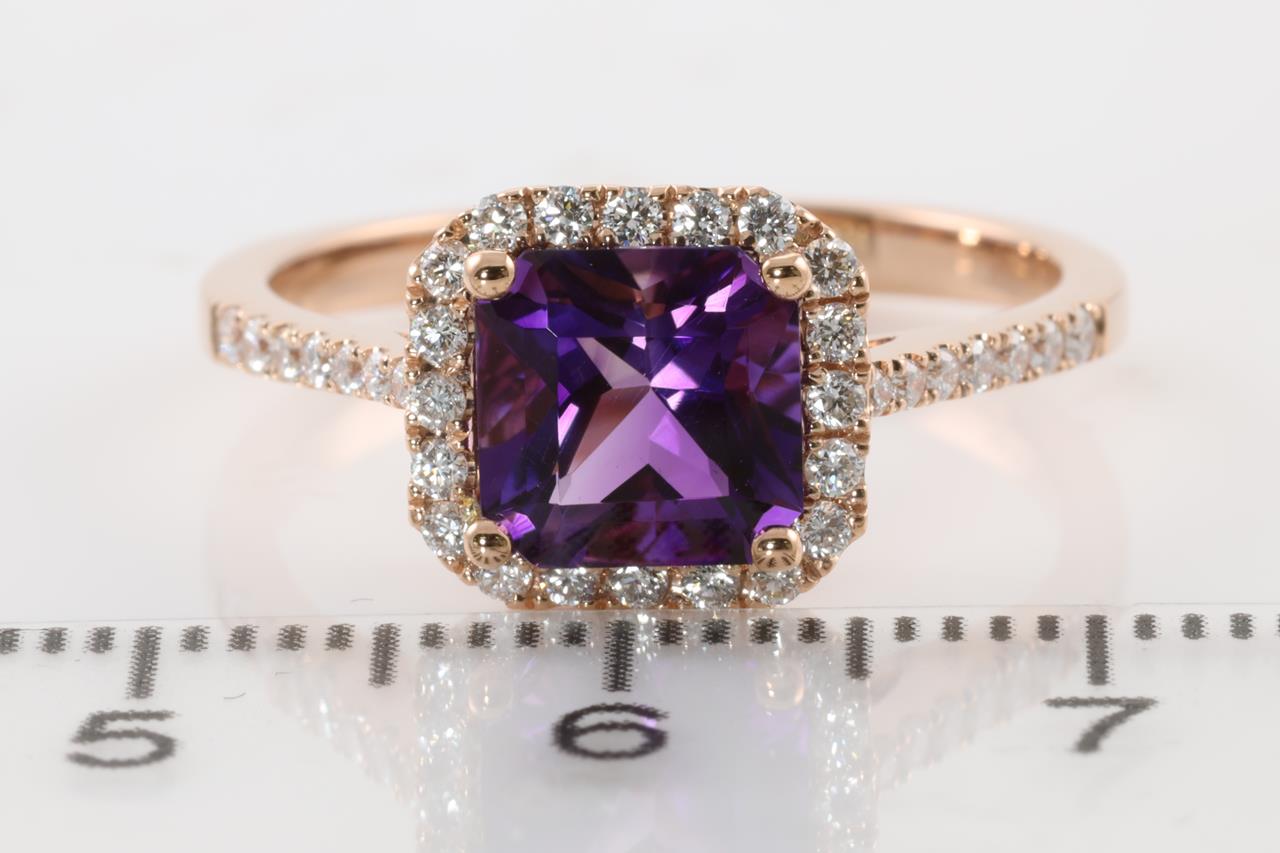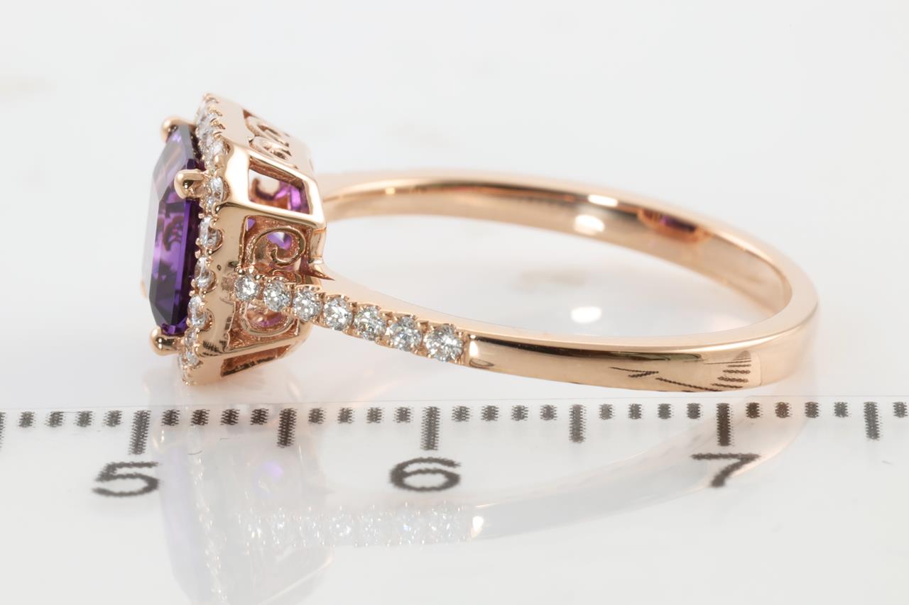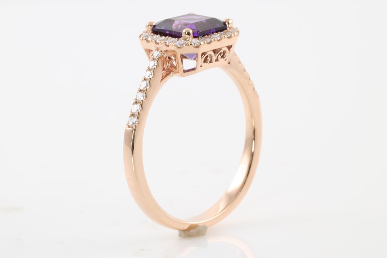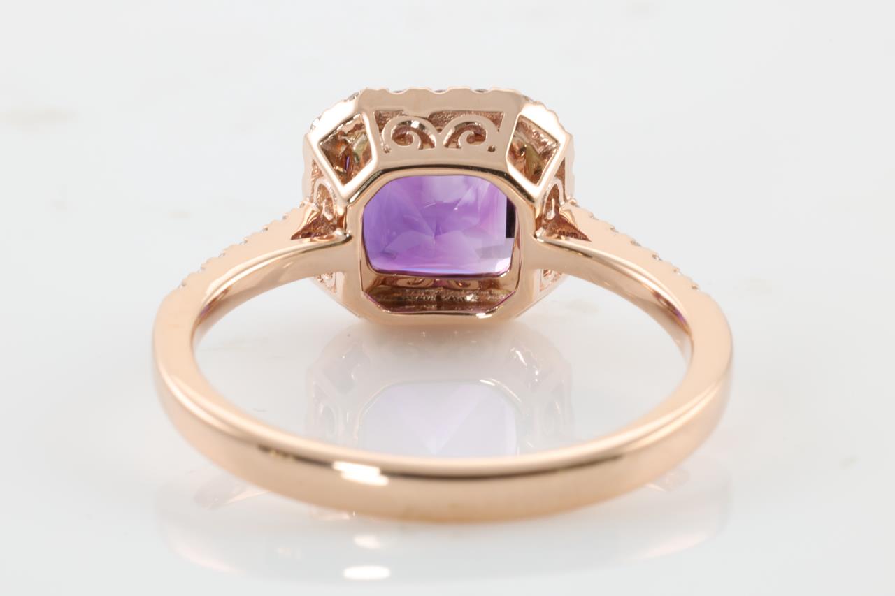 Amethyst and Diamond ring with emerald cut Amethyst of 1.29ct and Diamonds totalling 0.27cts (Estimated grading: H SI). 14ct Rose gold. Ring size N1/2. Weight: 2.8g (New)