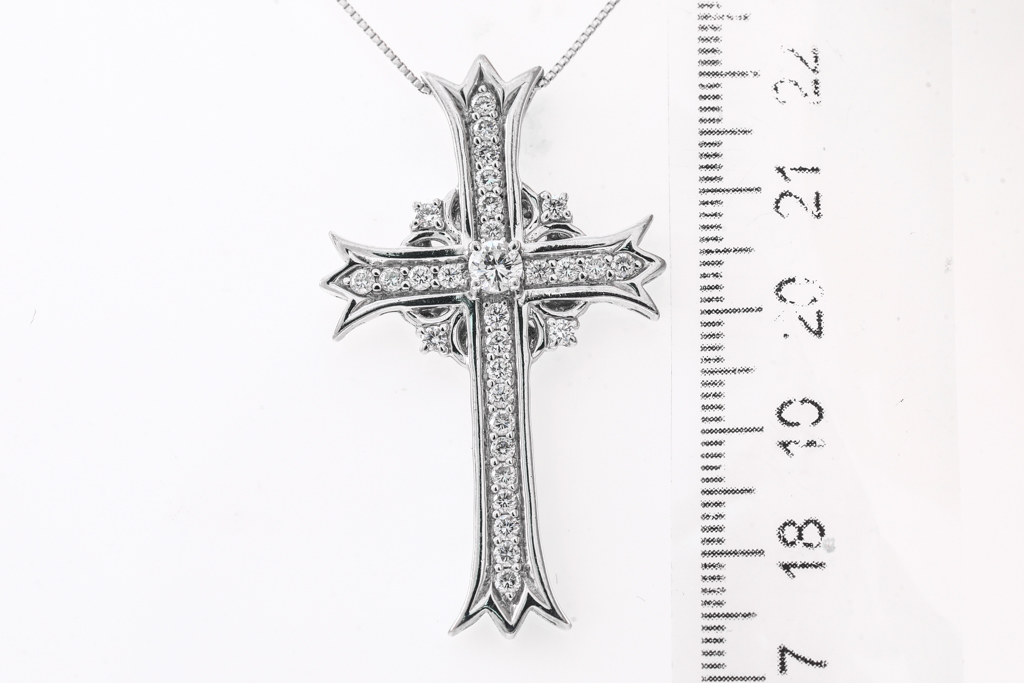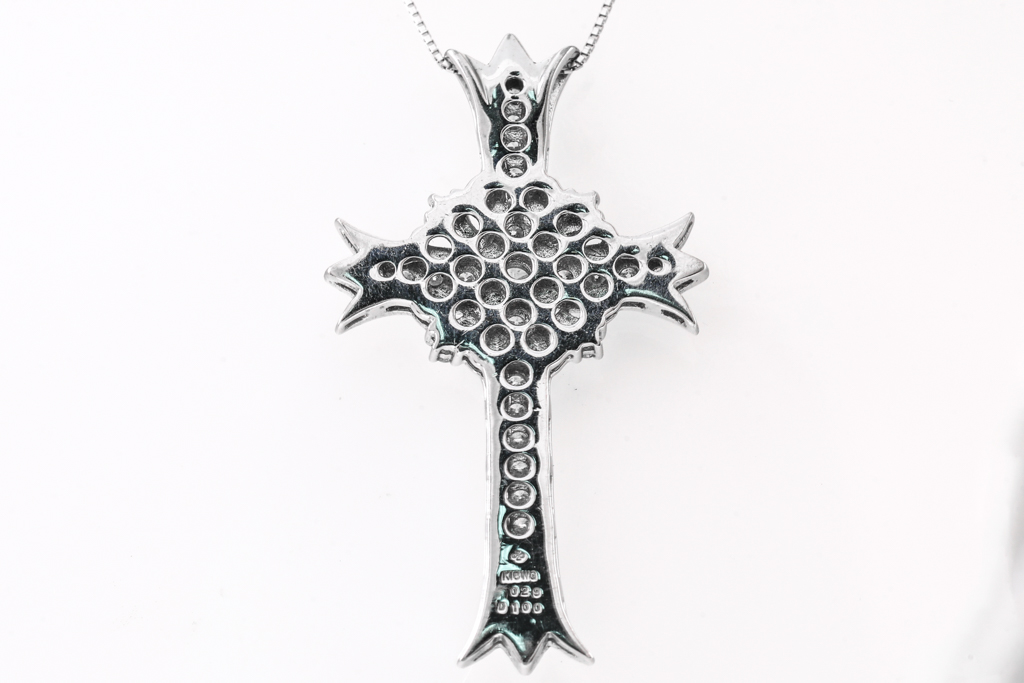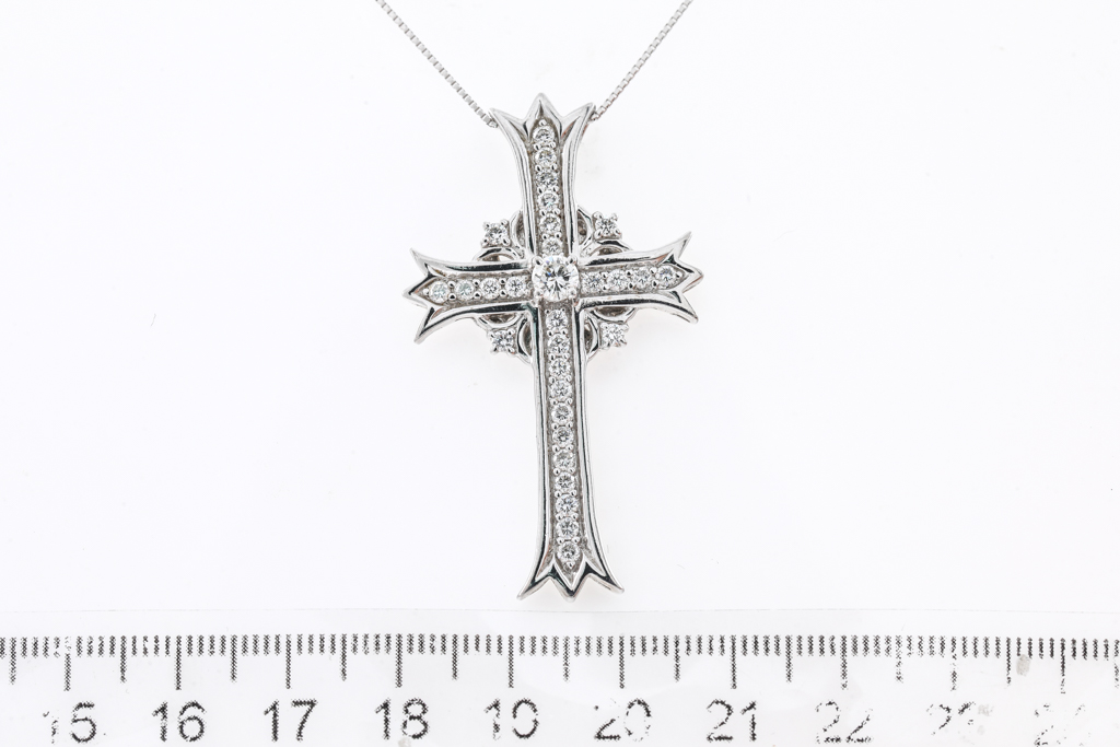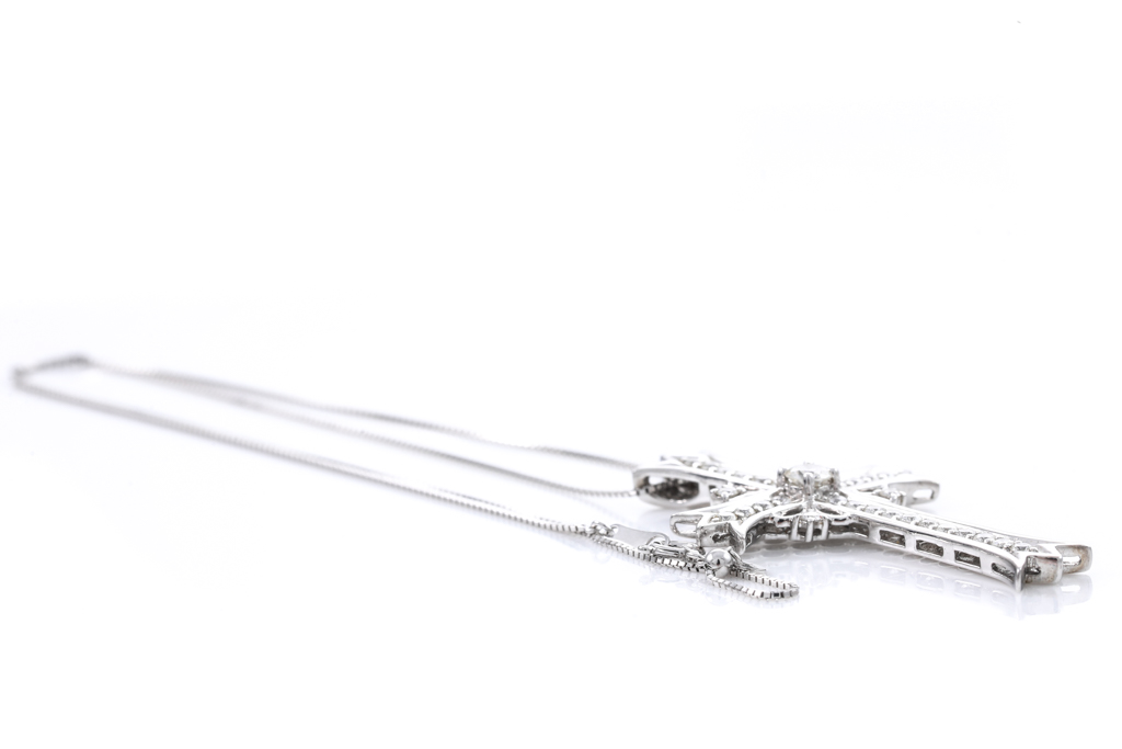 Diamond cross pendant with round Diamonds totalling 1.29cts (Estimated grading: G-H SI-P1). 18ct white gold with 18ct white gold 44cm adjustable chain. Weight: 10.9g. (Pre-owned)