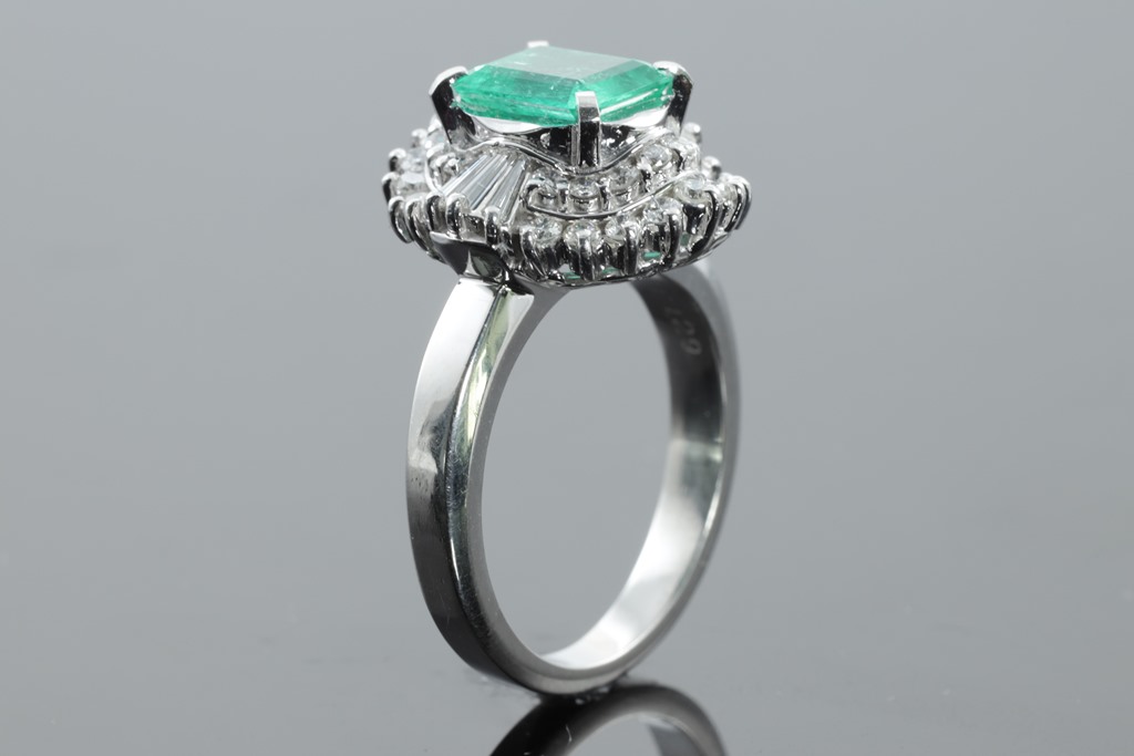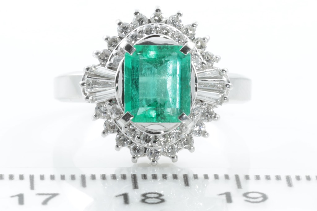 Emerald and Diamond Ring with emerald cut Emerald of 1.29ct and round & baguette cut Diamonds totalling 0.58cts (Estimated grading: G-H SI-P1). Platinum. Ring size K1/2. Weight: 9.5g (Pre-owned)