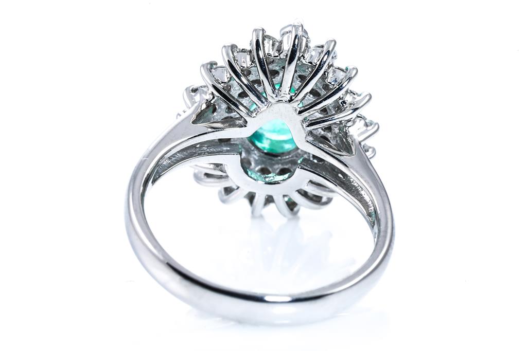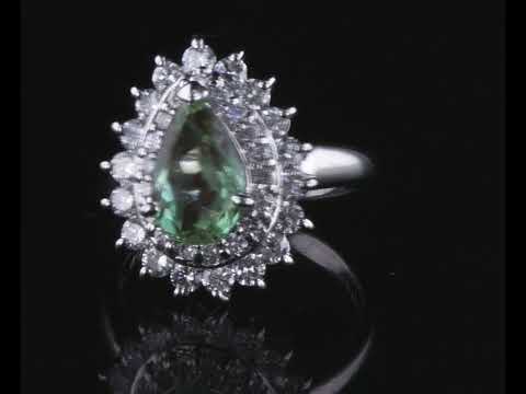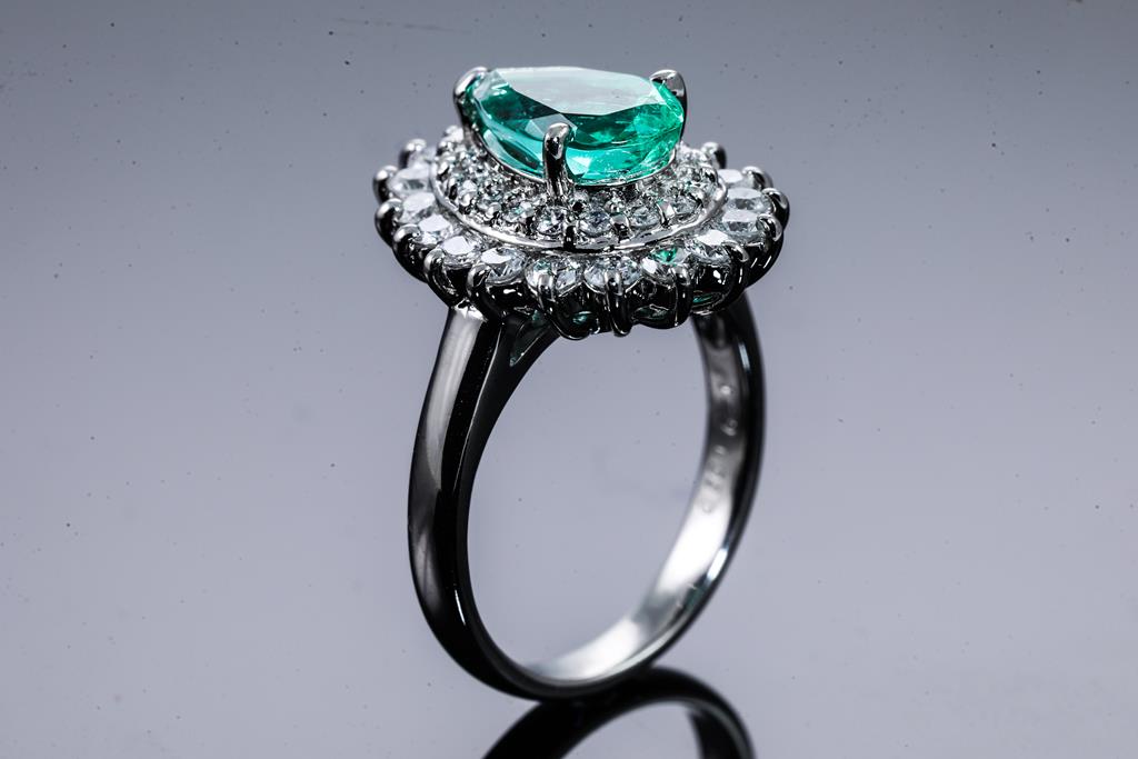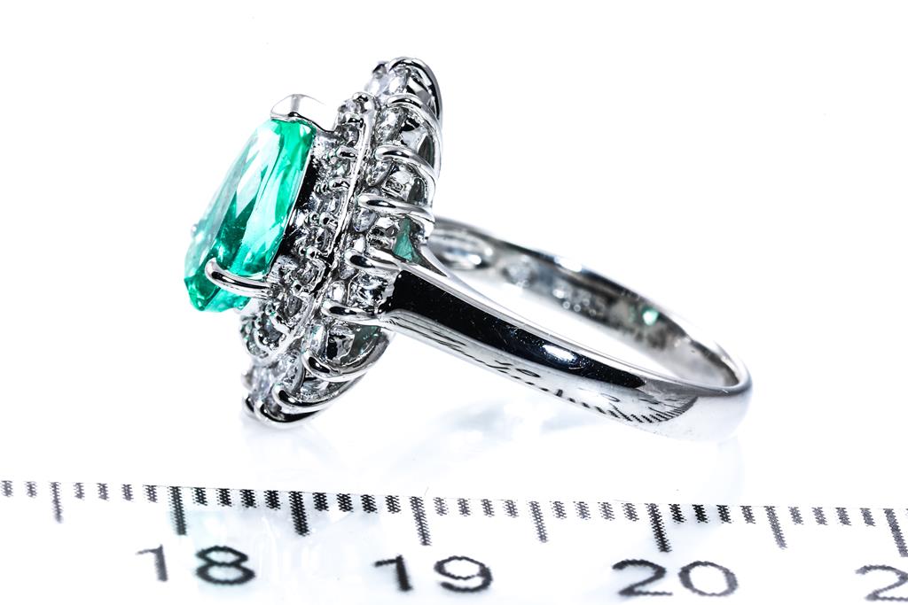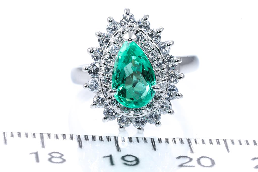 1840/ 141: Emerald and Diamond ring with a pear shape Emerald of 1.29ct and round Diamonds totalling 0.30cts (Estimated grading: G-H SI). Platinum. Ring size: I. Weight: 7.7g. (Pre-owned)