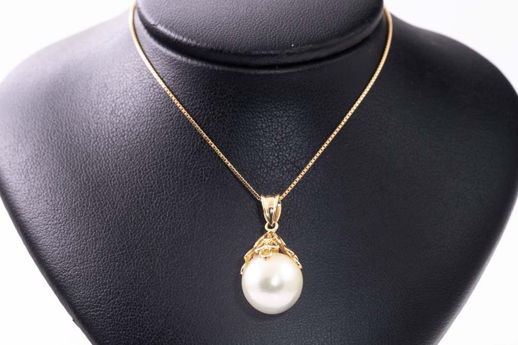 Pearl pendant with South Sea Pearl of 12.9mm. 18ct yellow gold with 44cm 18ct yellow gold adjustable chain. Weight: 7.1g. (Pre-owned)